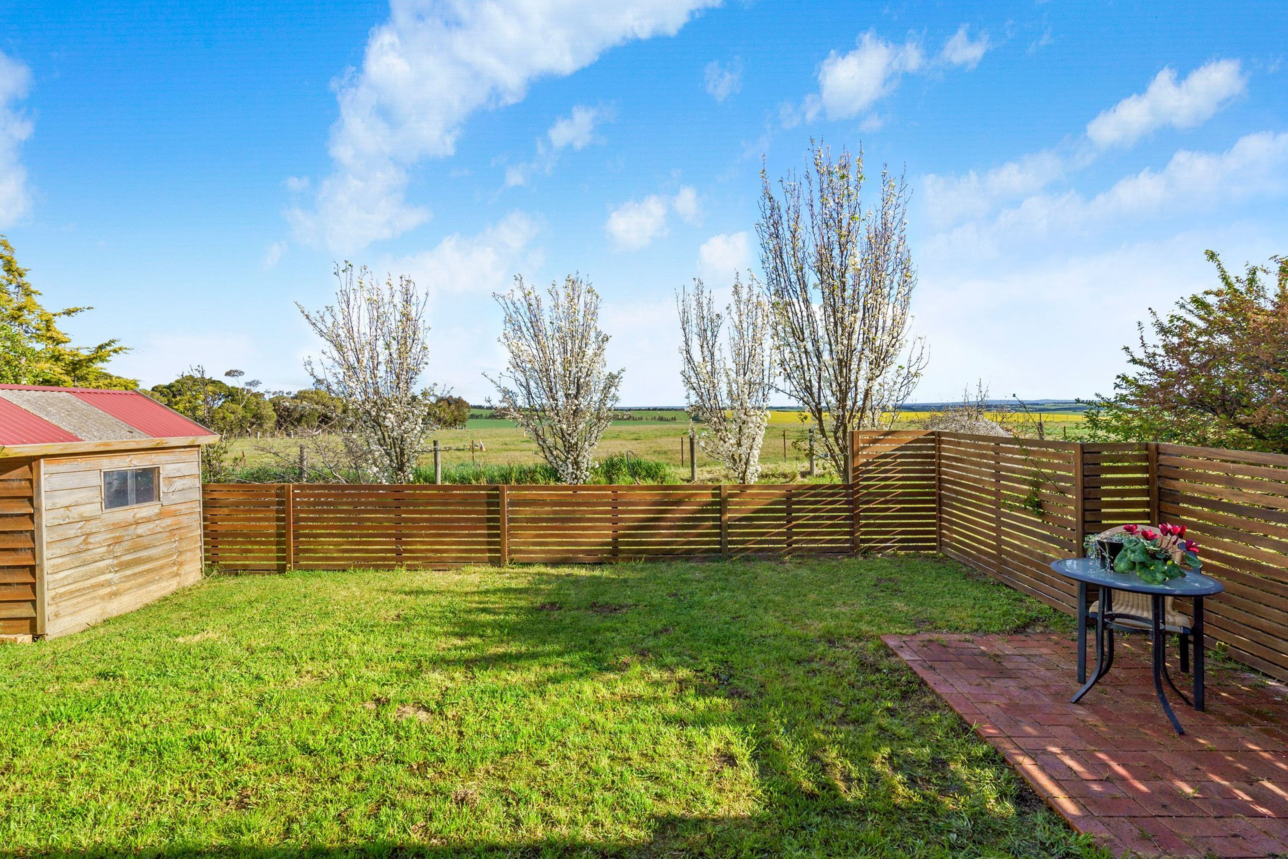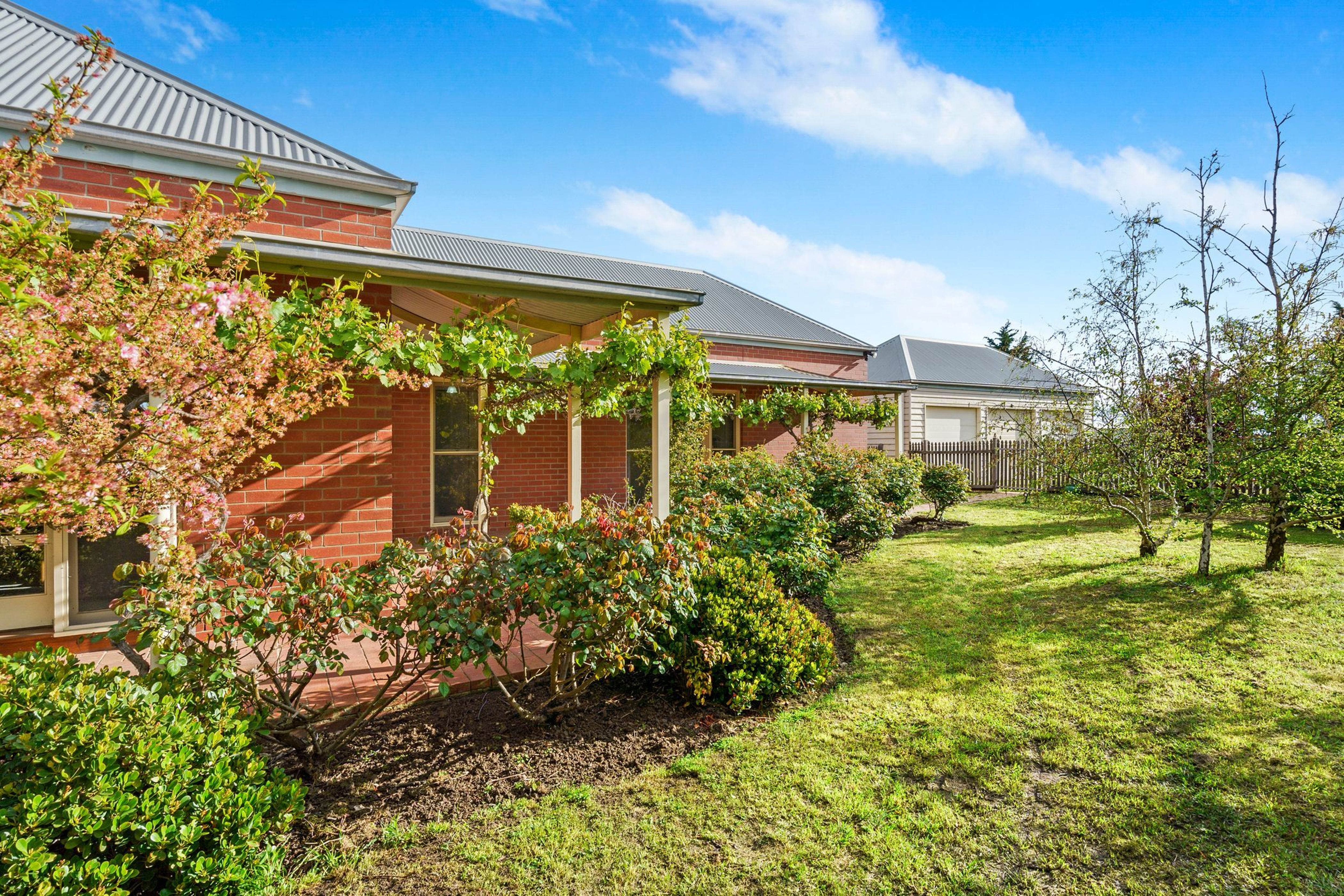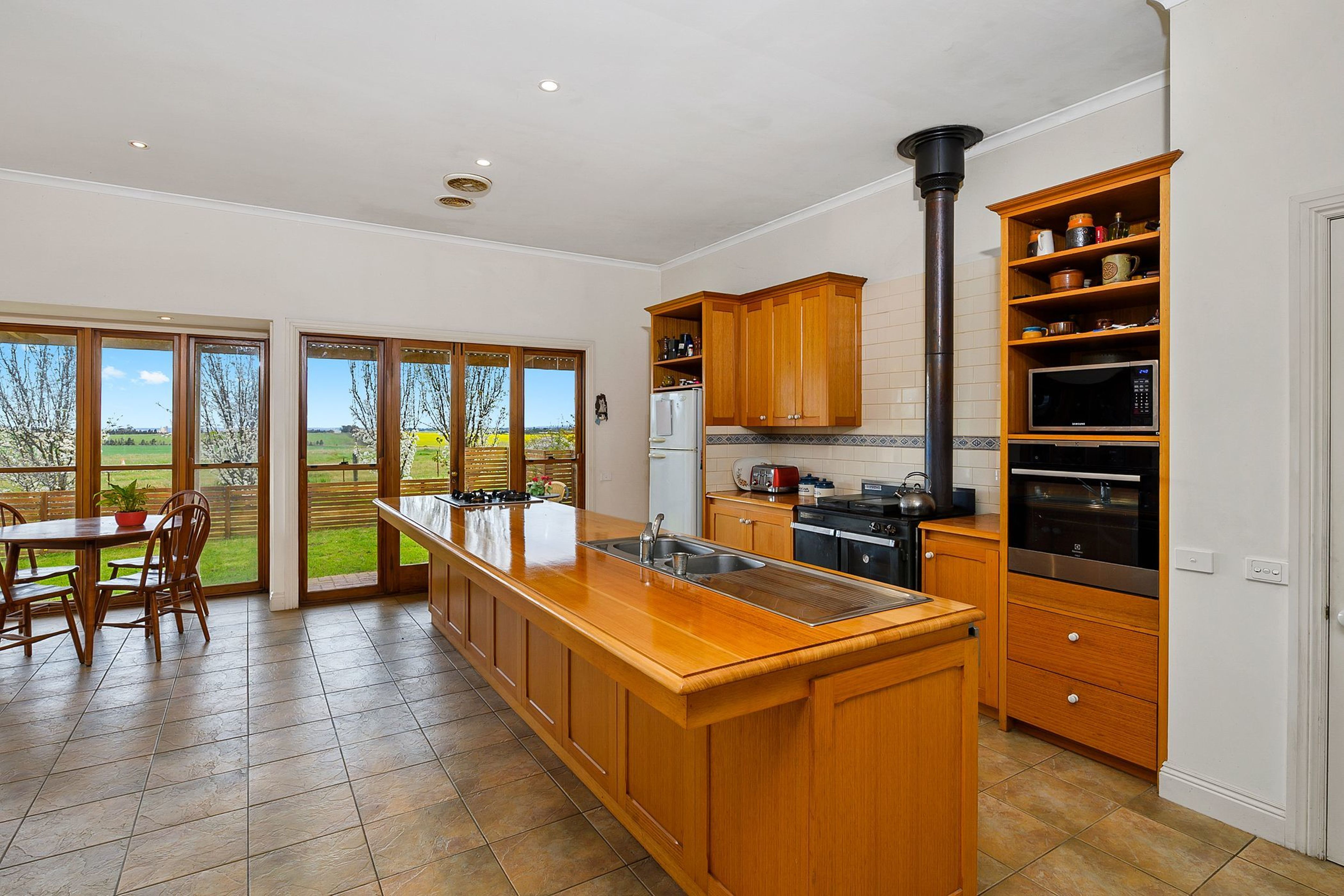 Surrounded by established gardens & fruit trees, this family residence is set well back from the road and offers 4 spacious bedrooms & 2 bathrooms (walk-in-robe & ensuite to main). A large kitchen with oak benchtops opens onto the rear courtyard area and is well-appointed with a Thermalux Supreme wood stove, gas hot plates, electric oven, dishwasher and walk-in-pantry. A meals area takes in the countryside views with a casual living-dining space adding to the ambience of the room.