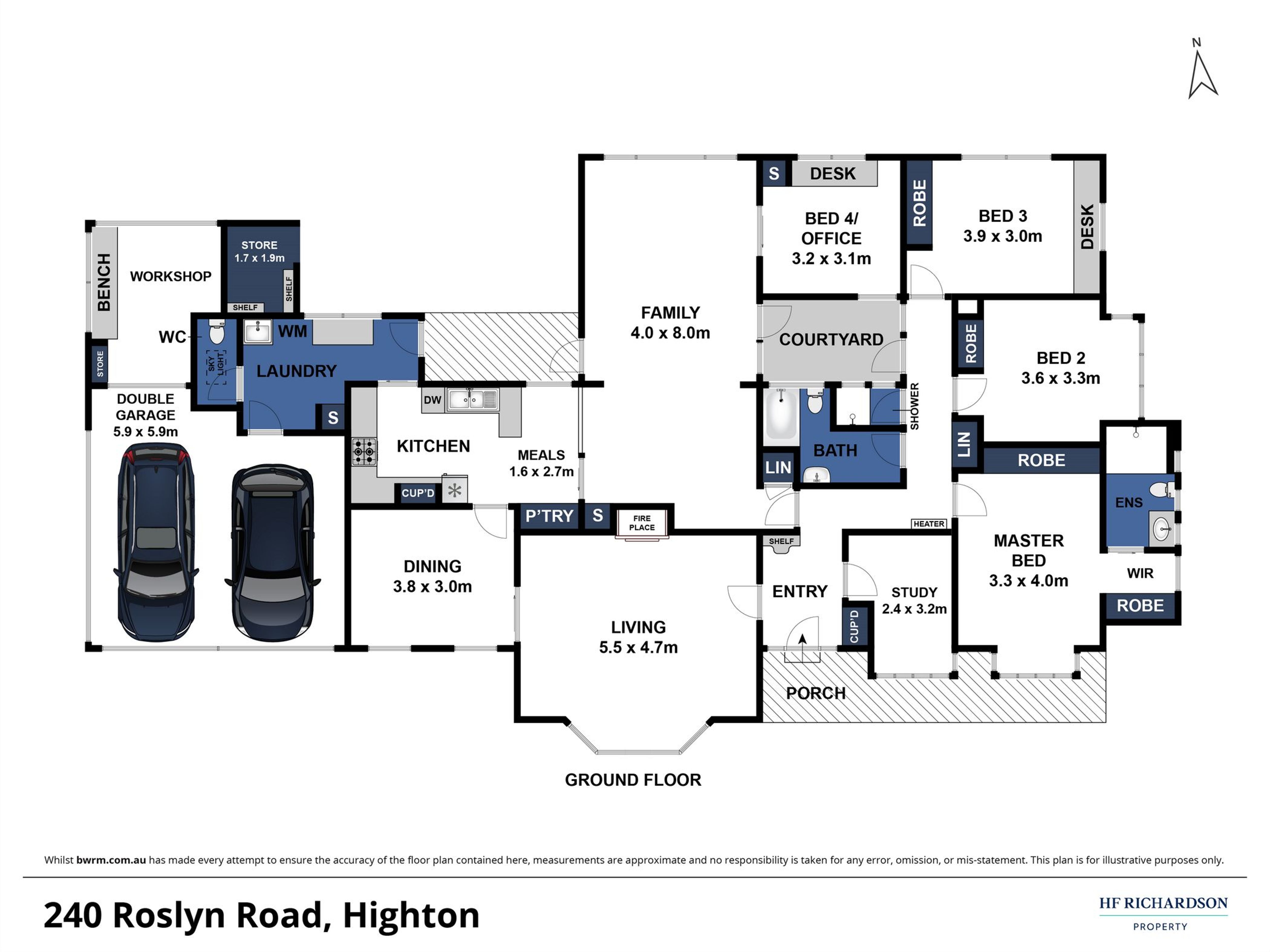 Comprising 4 spacious bedrooms plus separate study (master with WIR, all others with BIRs, bedroom 4/large office), 2 bathrooms (ensuite to master, central family bathroom with separate bath & toilet, and shower room), a gorgeous formal lounge with OFP and bay windows, formal dining, expansive family room at the rear with north-facing garden views, internal courtyard/fernery, a well-designed and functional kitchen with large pantry and good bench space (incl. St George electric stove and oven, Bosch dishwasher), an adjoining meals space, separate laundry & powder room plus internal access to the garage.