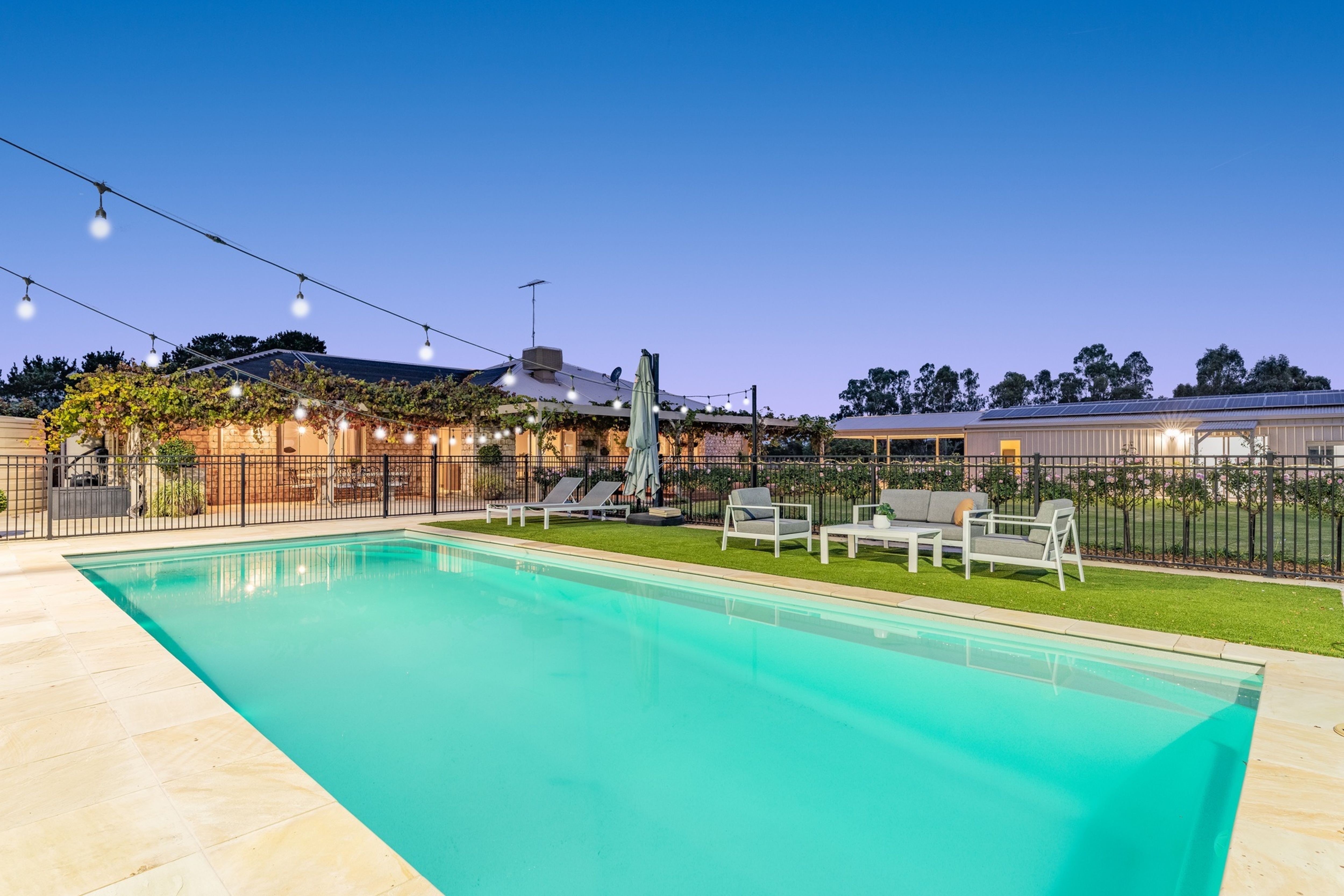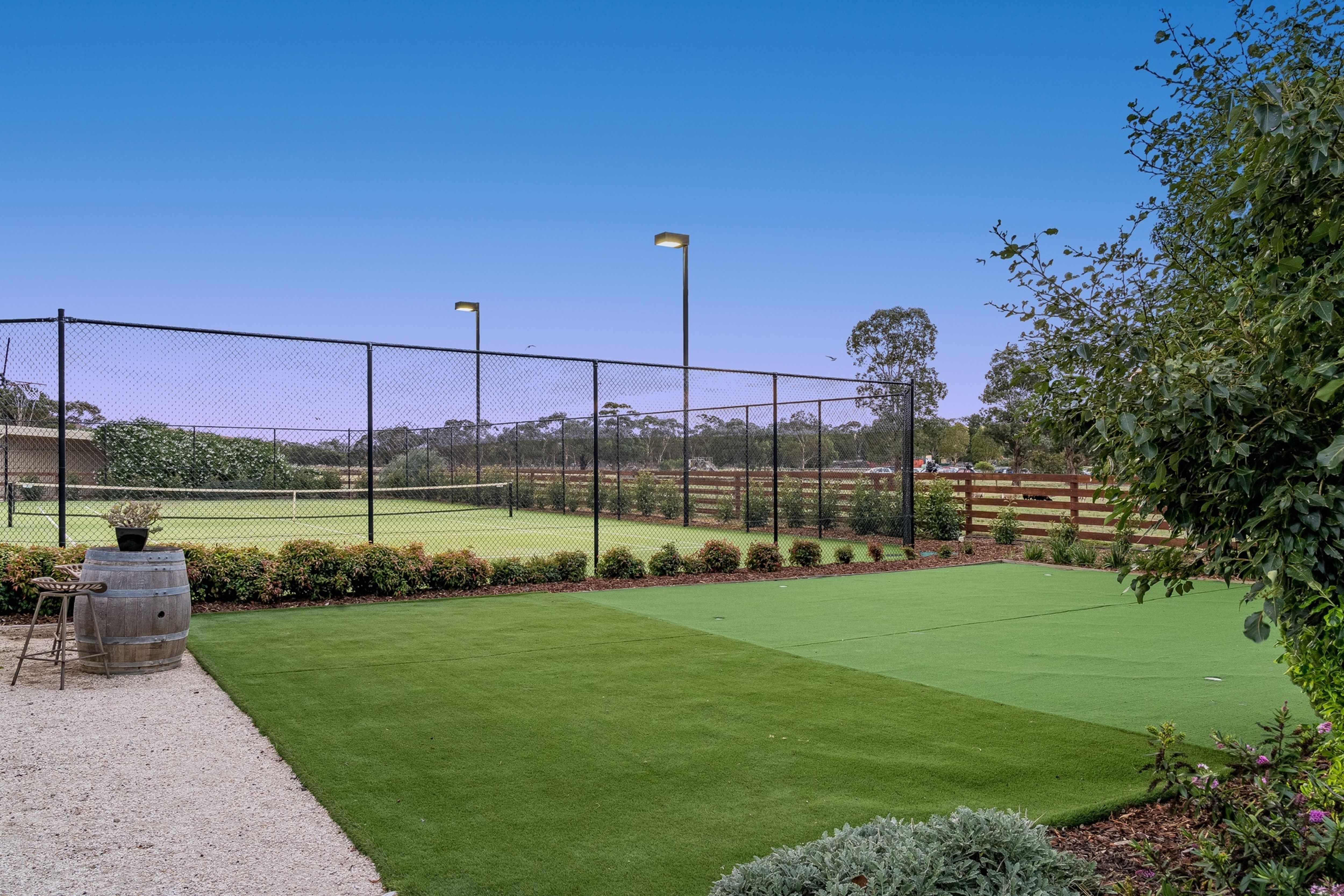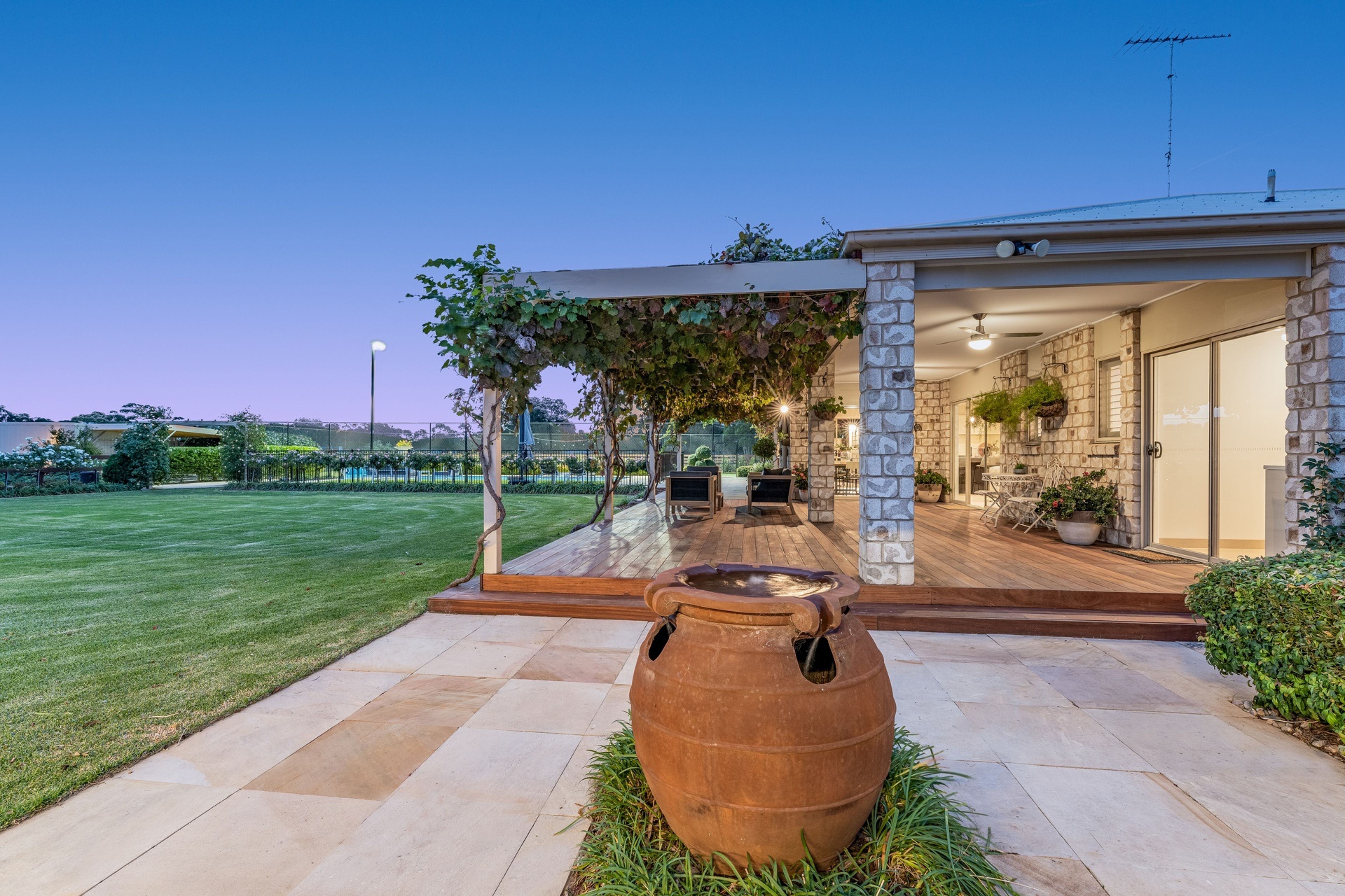 Externally the home enjoys great flexibility with a multitude of outdoor spaces including an in-ground 11.4 metre solar heated swimming pool (temperature controlled), championship sized synthetic grass floodlit tennis court, golf putting and chipping green, manicured lawns, a small vineyard which could easily be reinstated, landscaped gardens & veggie gardens (fully irrigated off tank water) and an established orchard with a variety of fruit trees (olive, fig, passionfruit, apple, pear, plum, apricot, almond & quince).