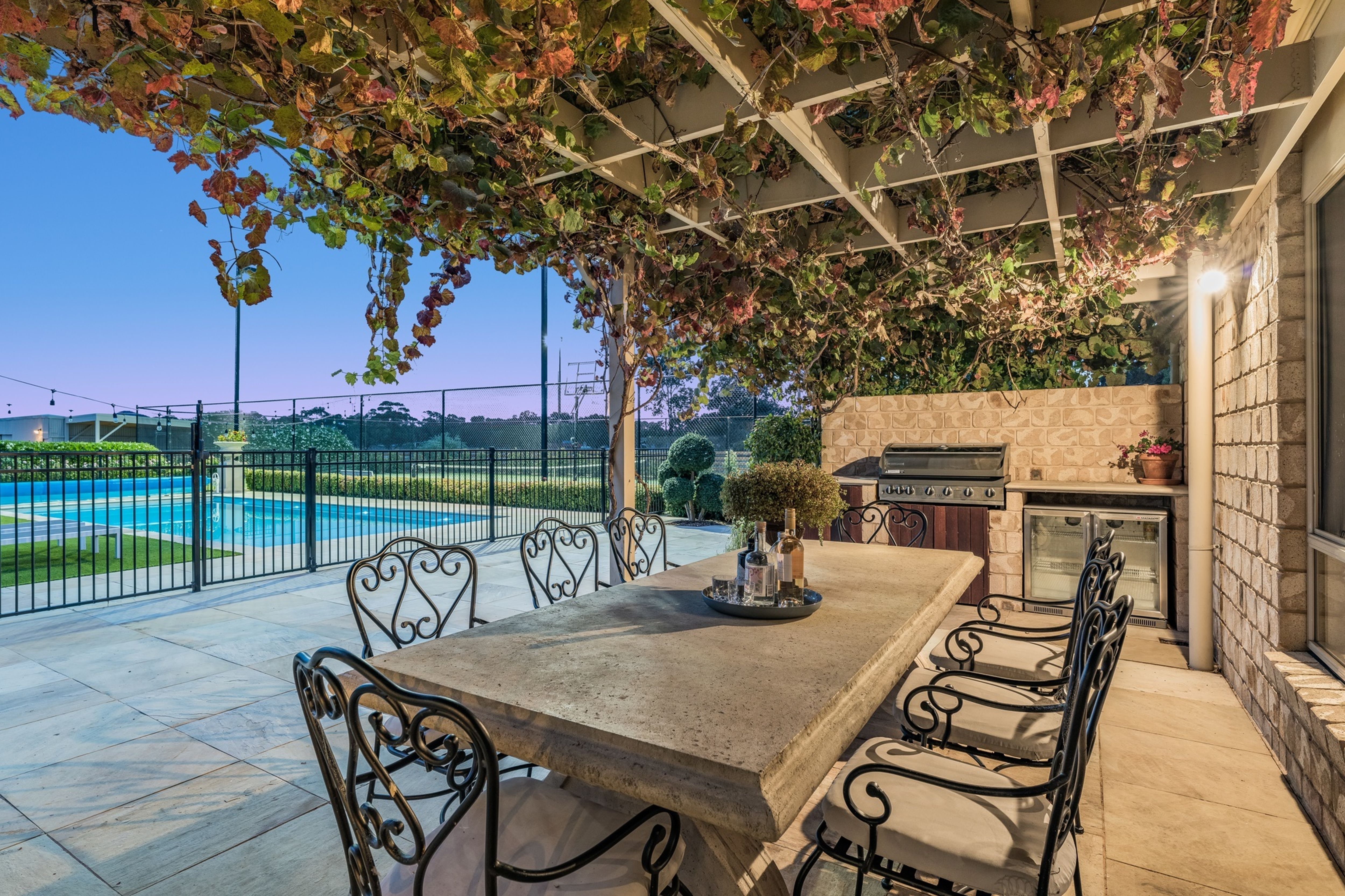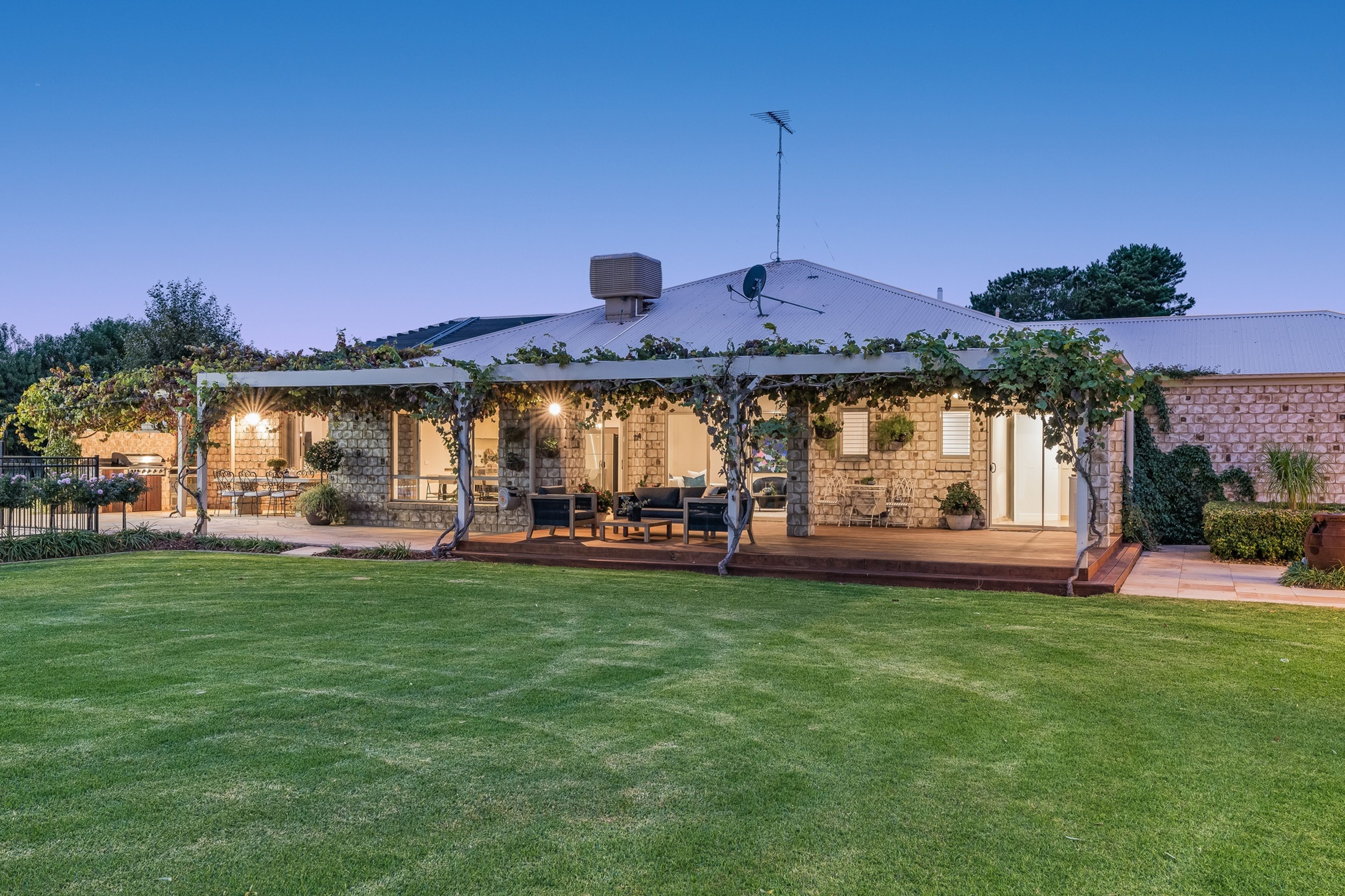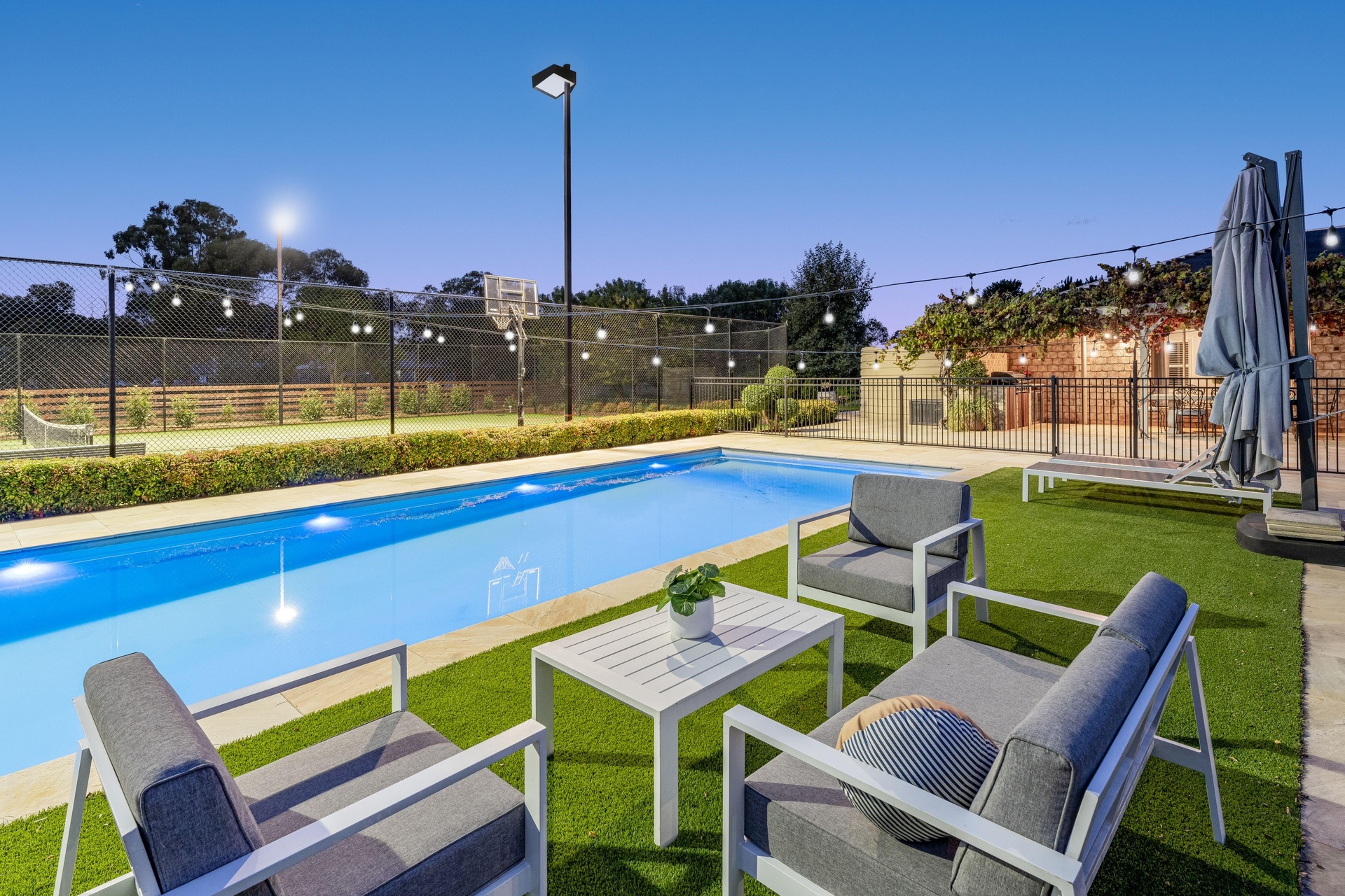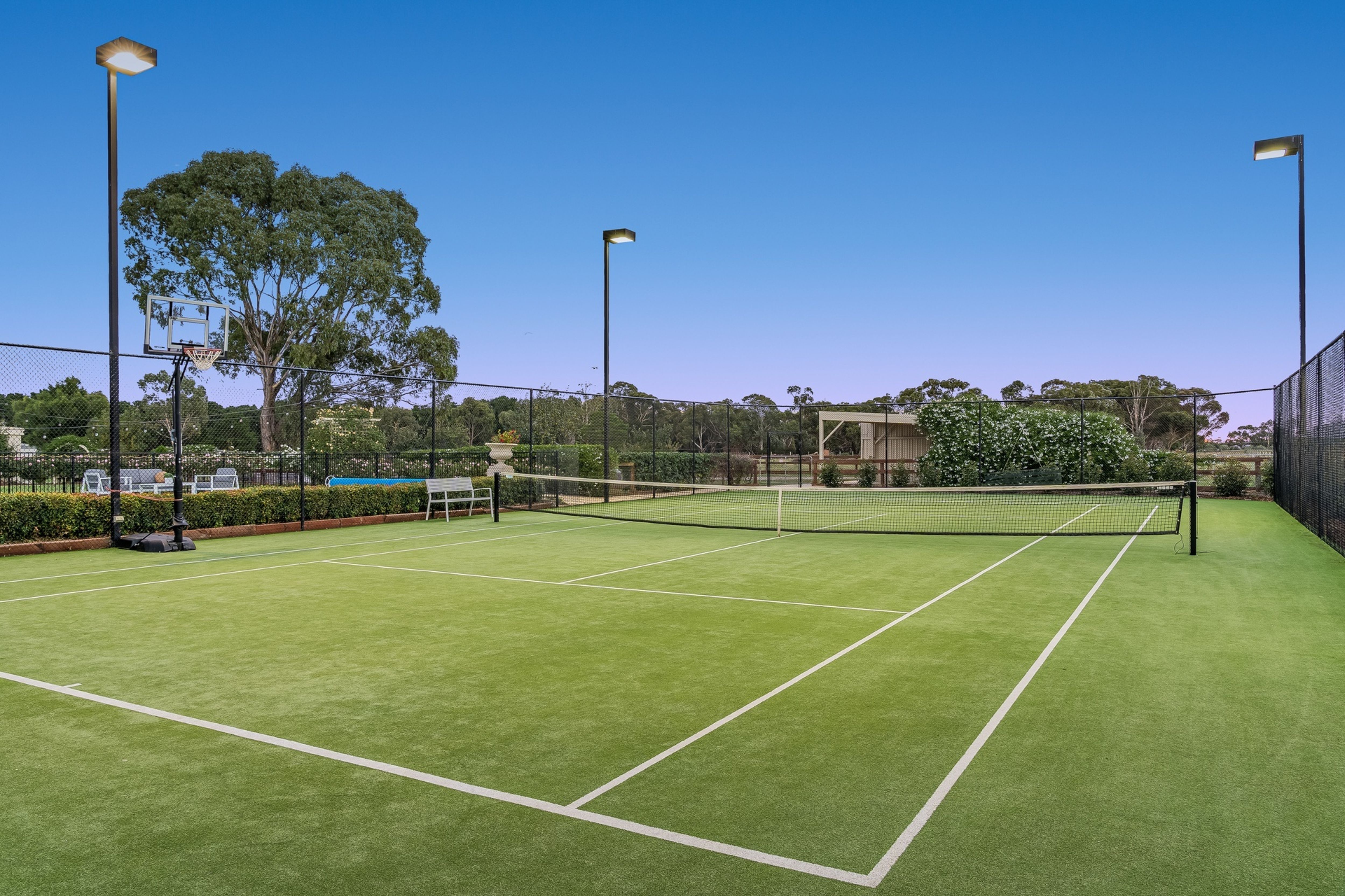 Externally the home enjoys great flexibility with a multitude of outdoor spaces including an in-ground 11.4 metre solar heated swimming pool (temperature controlled), championship sized synthetic grass floodlit tennis court, golf putting and chipping green, manicured lawns, a small vineyard which could easily be reinstated, landscaped gardens & veggie gardens (fully irrigated off tank water) and an established orchard with a variety of fruit trees (olive, fig, passionfruit, apple, pear, plum, apricot, almond & quince).