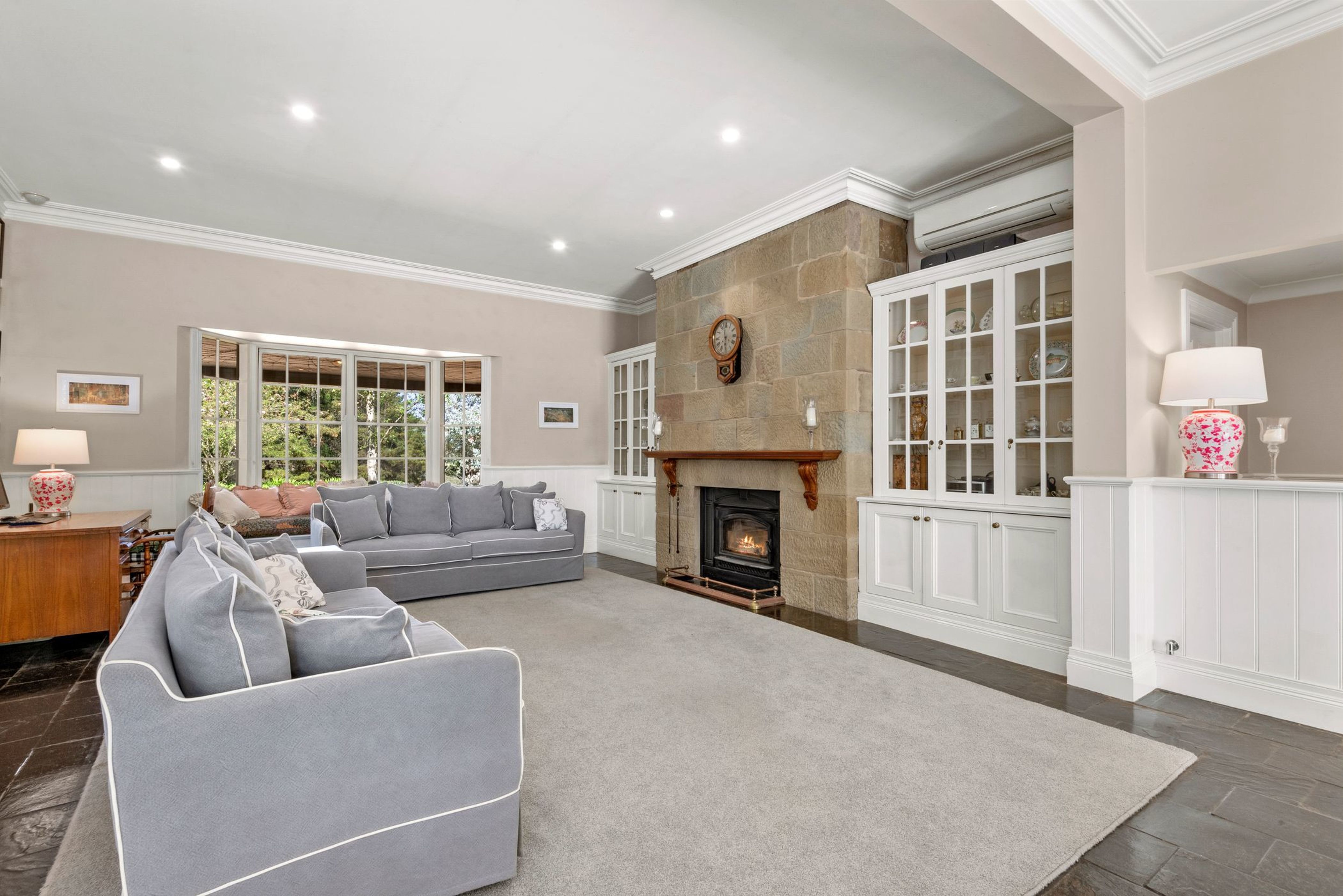 Adjoining the kitchen is a large dining/meals space and family lounge area featuring a Barrabool sandstone fireplace for added regality. Off this area and down a flight of stairs sits a large underground cellar, perfect for the wine enthusiast with a large collection requiring safe storage.