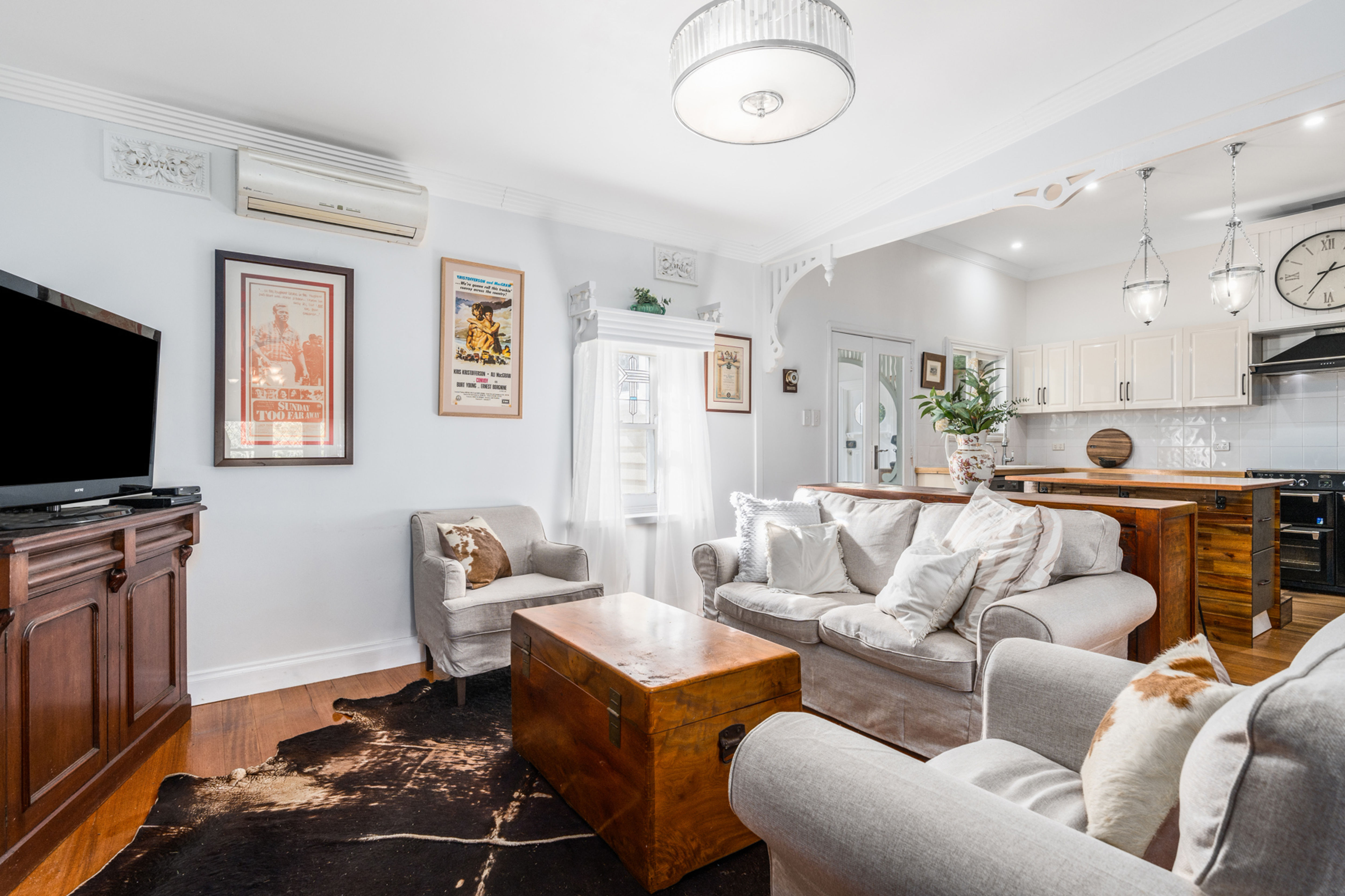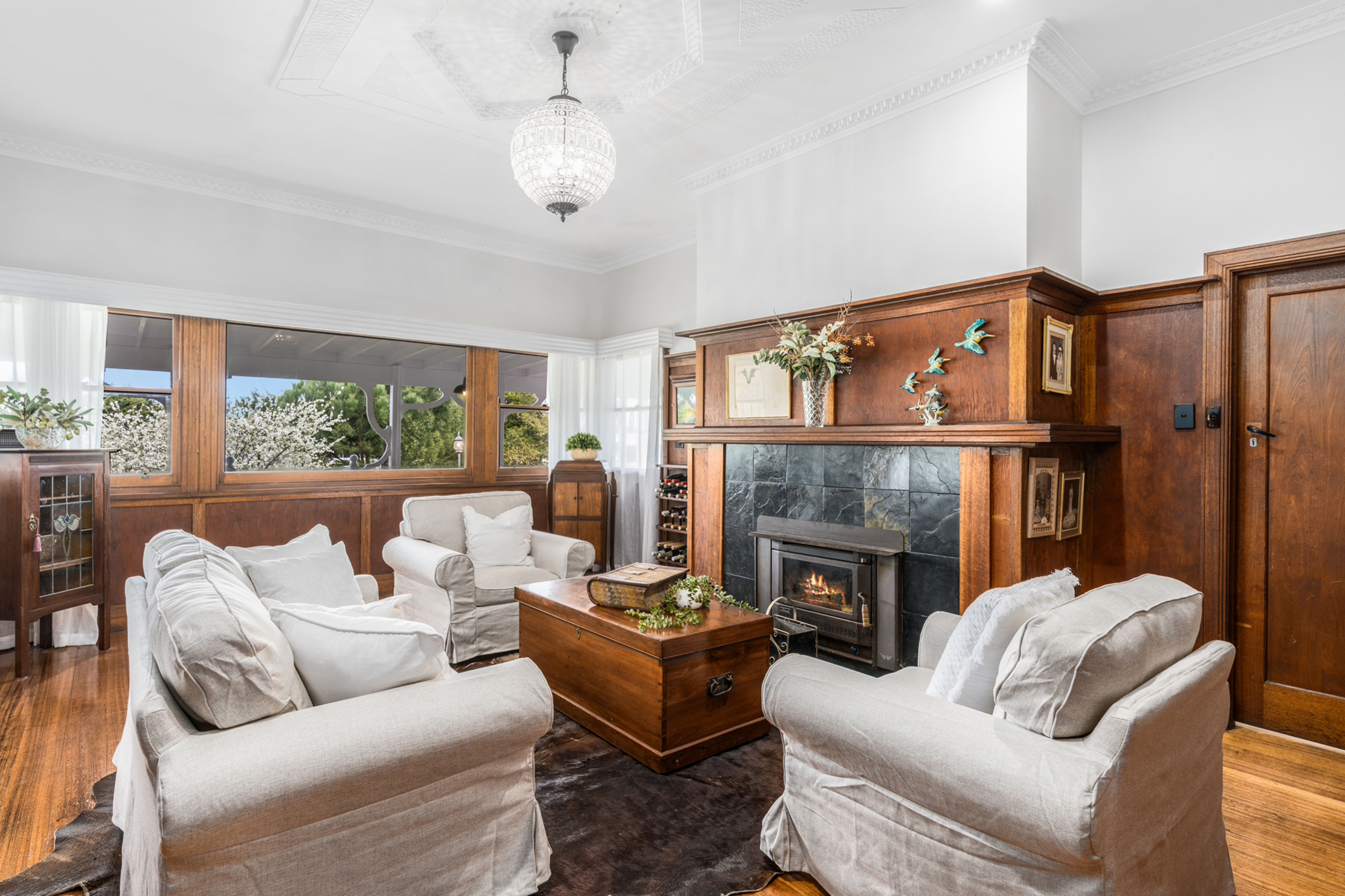 The lounge room is a true homage to country living, featuring stunning wood panelling and a timeless open fireplace, creating a warm and welcoming atmosphere.