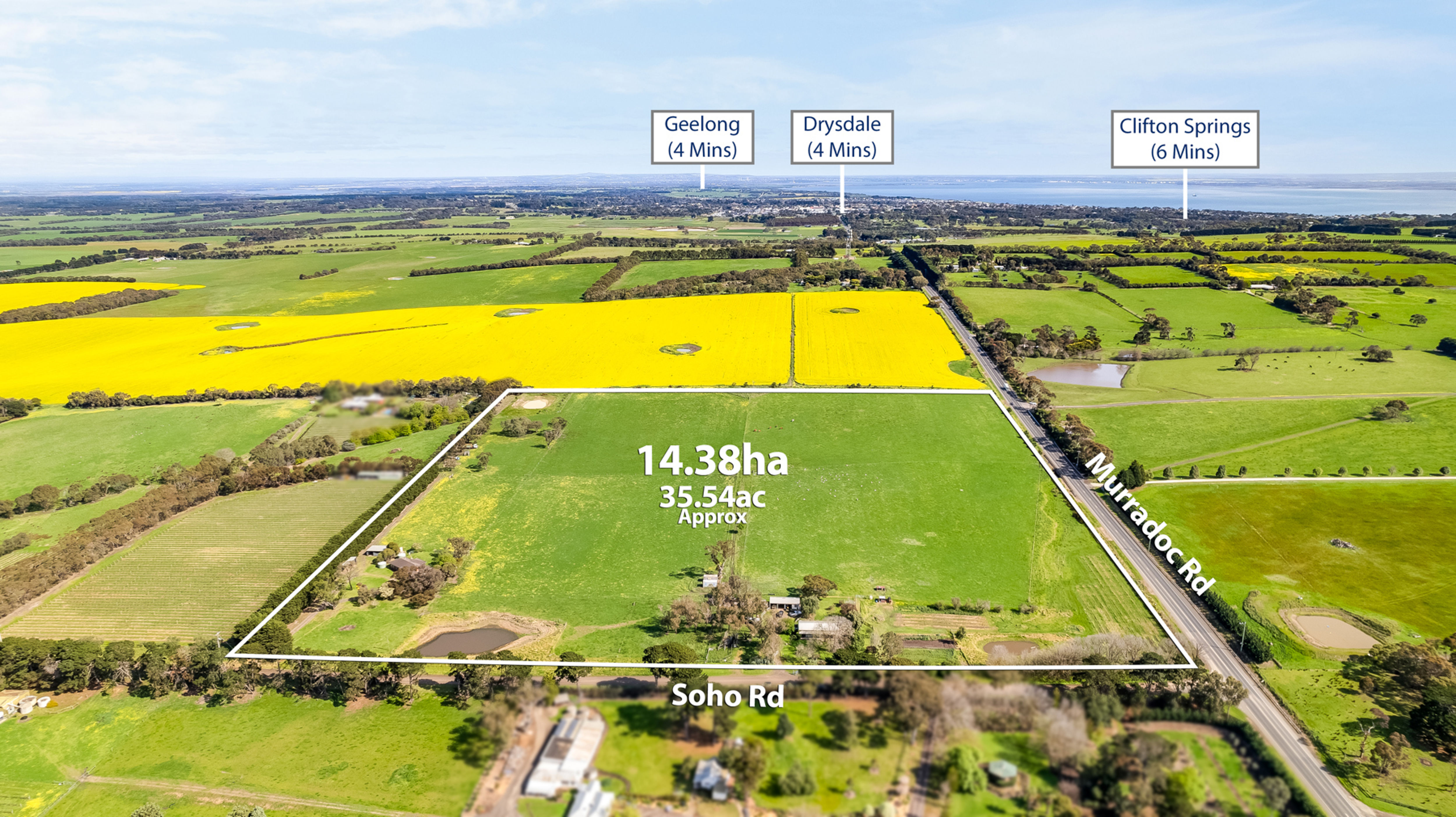 Set on an expansive 14.38 hectares (35.54 acres approx.) with water views over Swan Bay towards Sorrento, this remarkable property offering two houses is the ultimate rural escape just minutes from the heart of Drysdale, with its proximity to Geelong (20 minutes) and world-class golf courses and beaches in Point Lonsdale and Barwon Heads (10 minutes). Under the same family ownership for over 45 years, this exceptional rural holding is surrounded by the renowned wineries of the Bellarine Peninsula and provides endless lifestyle opportunities.