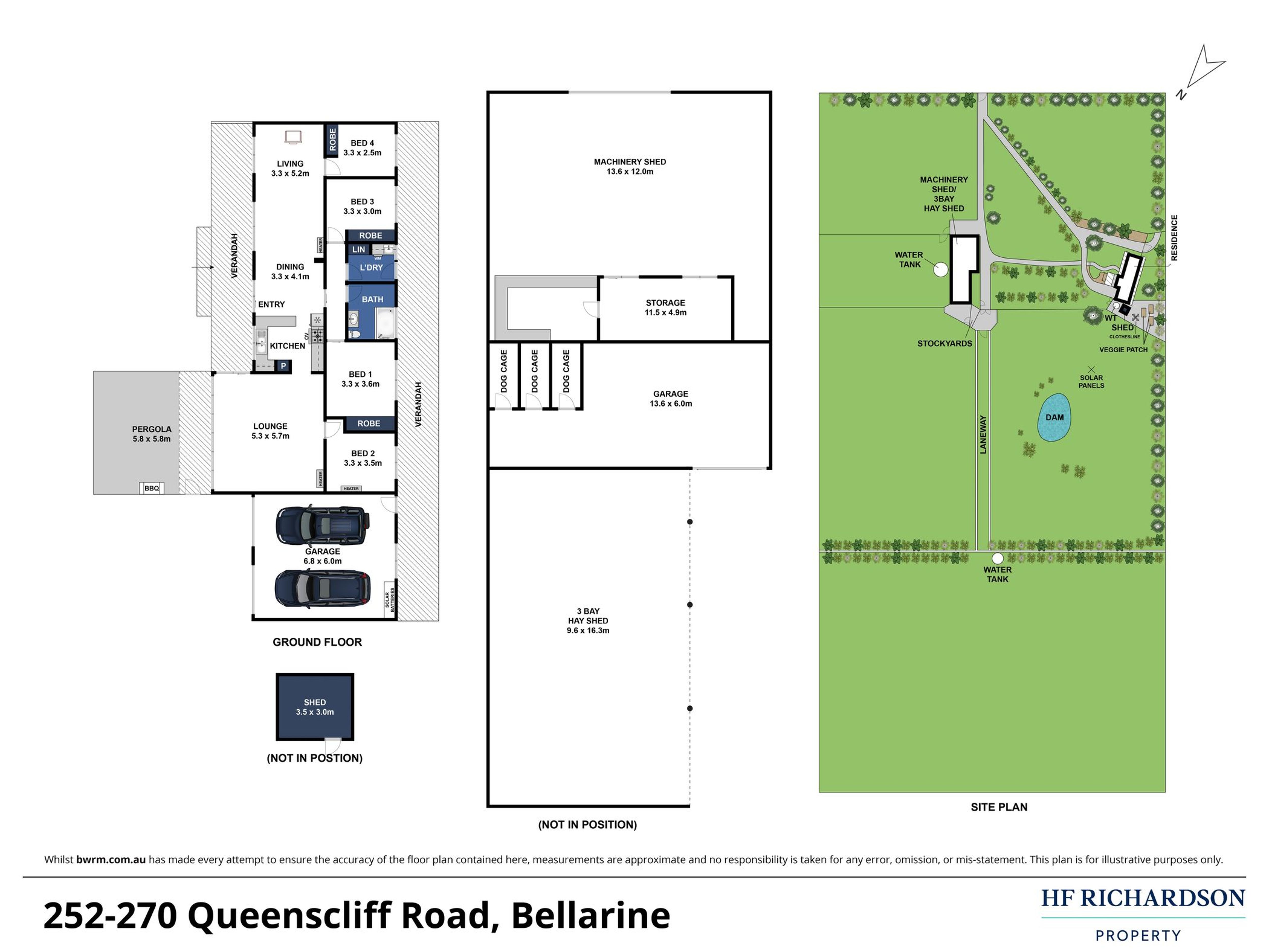 - Paddocks & Shedding: Double garage next to the home, garden shed, large machinery shed with workspace and internal secure storage room, separate garage with three dog cages, 3 bay hay shed, stock yards & loading facilities, 6 main paddocks plus a large house paddock, 1 dam and multiple water tanks