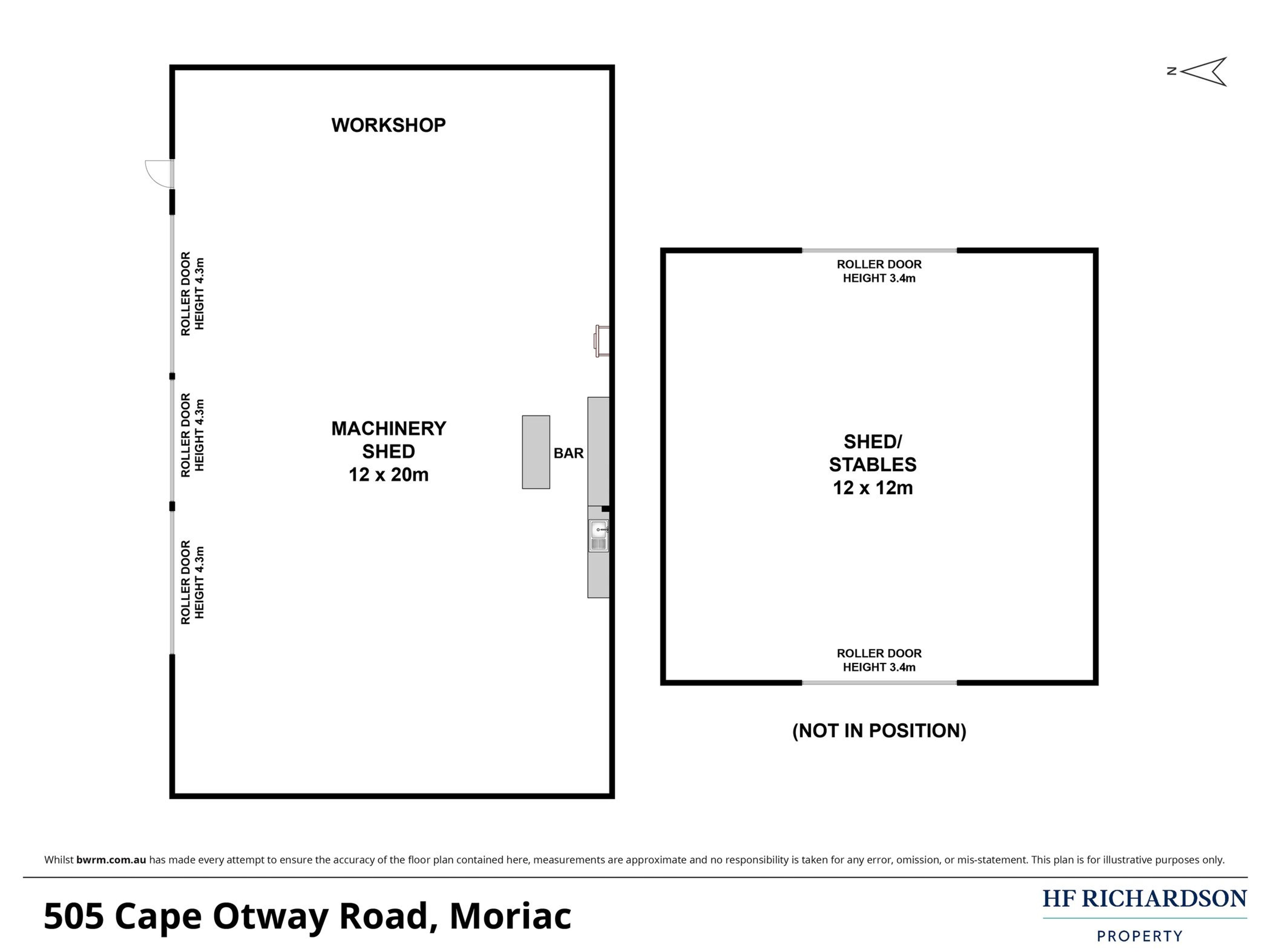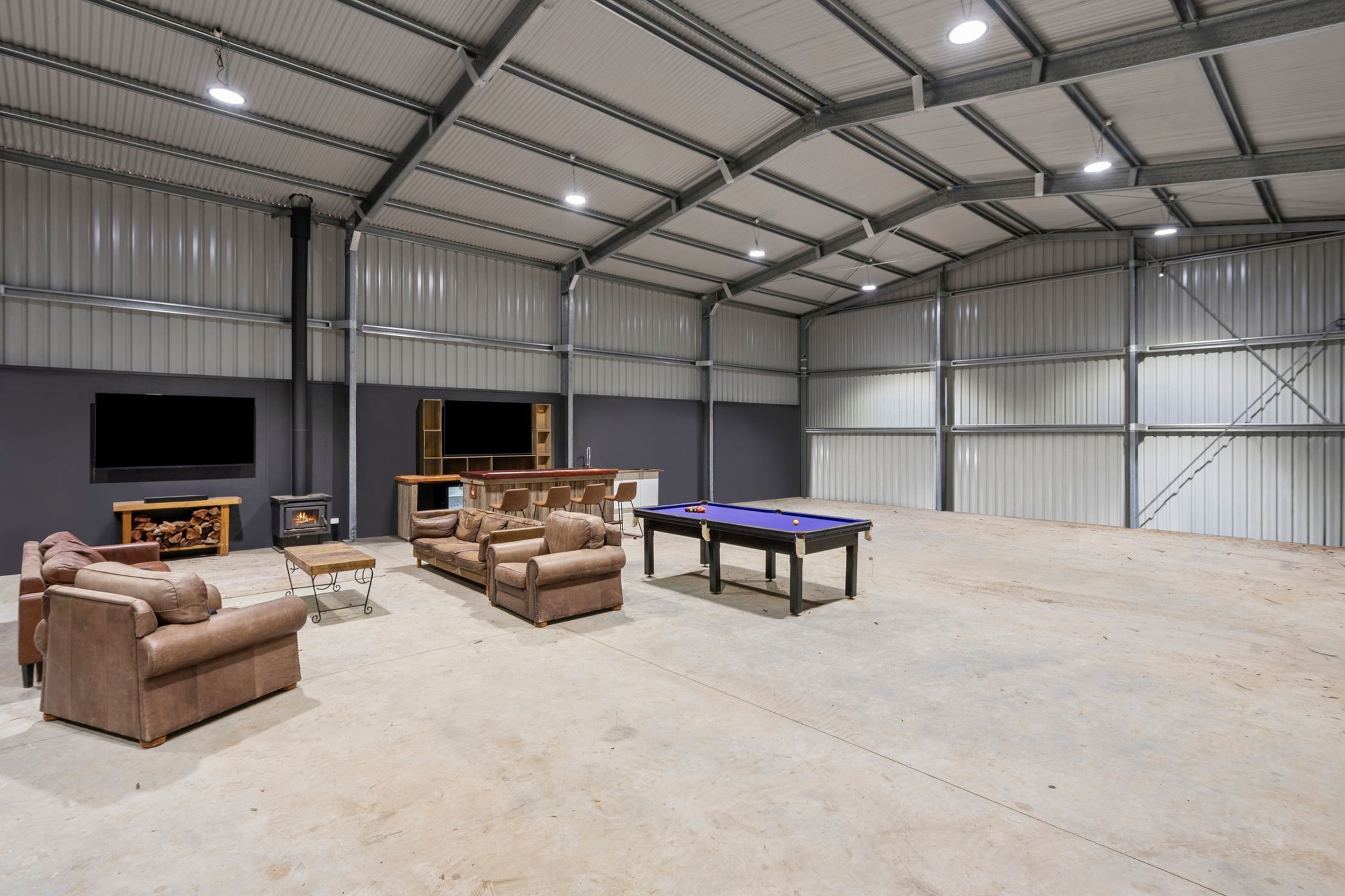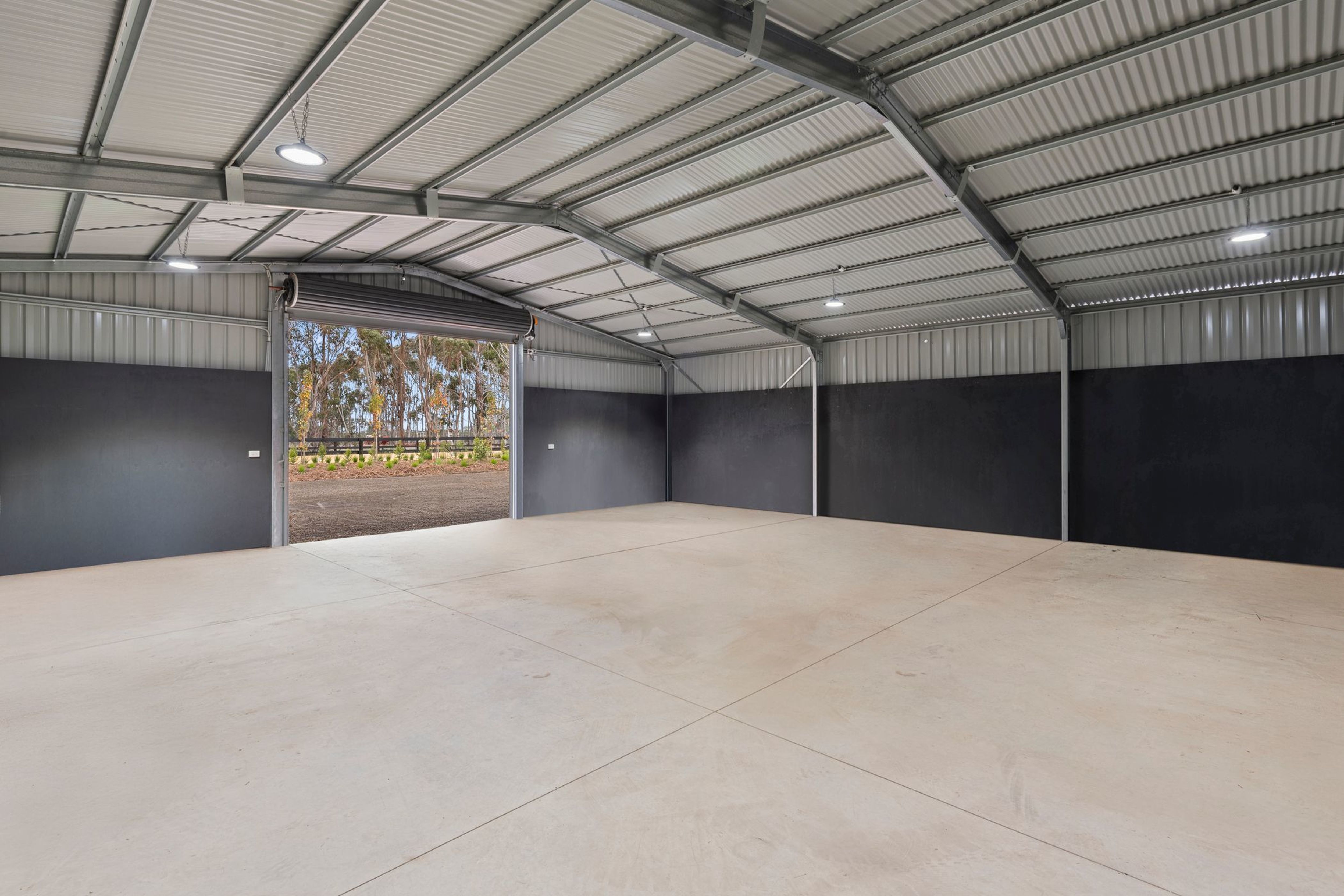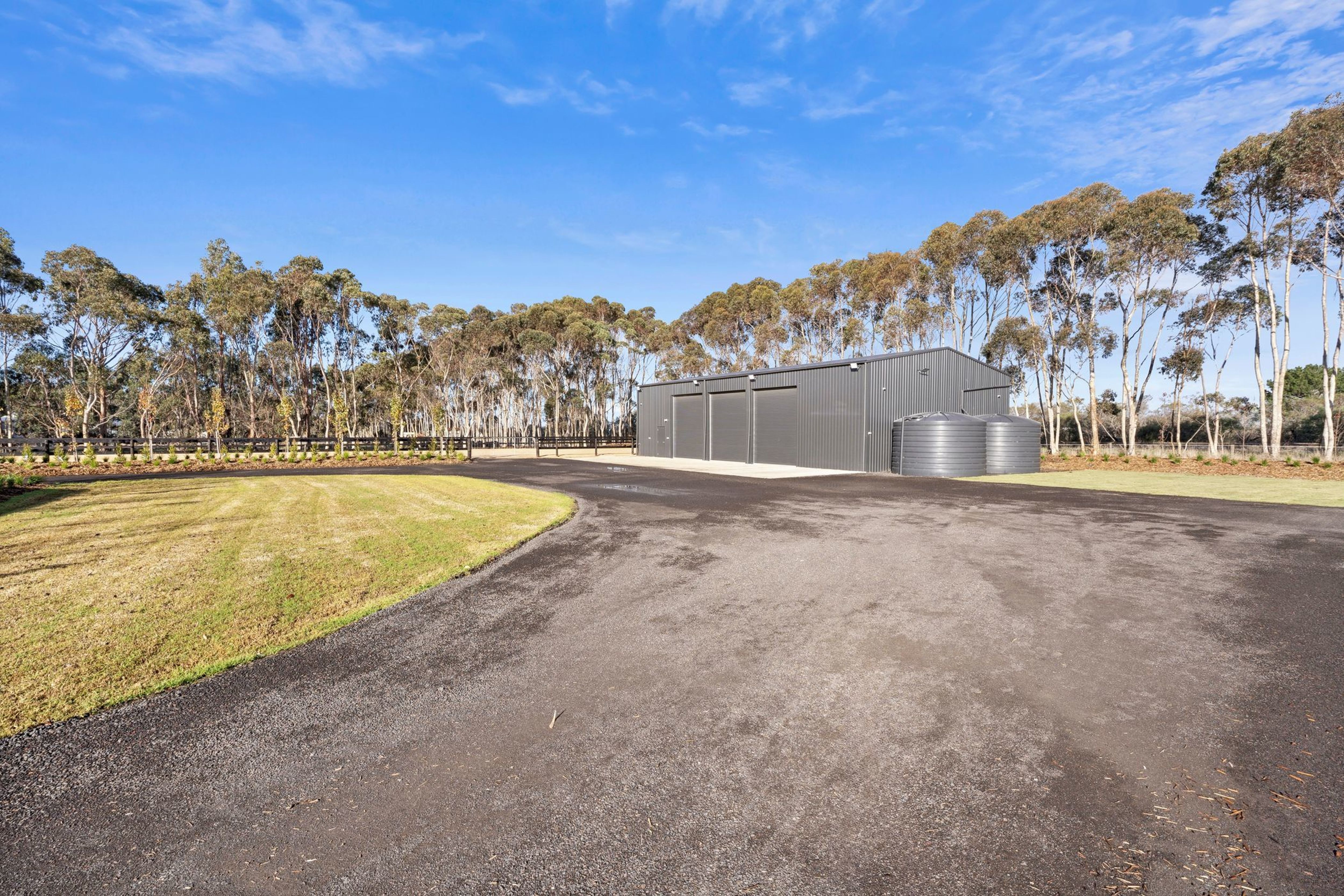 Key Features: 12m x 20m machinery shed (incl. 3 remote doors, wood fire, bar & pool table), 12m x 12m machinery shed offering plenty of flexibility as either a large garage to service the future house or as a stables facility to support farm activities (front and rear auto roller doors allow horse float parking, along with five stall sections plus a separate tack & feed bay)
