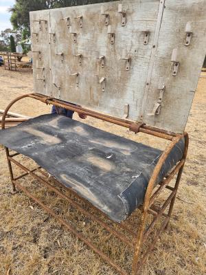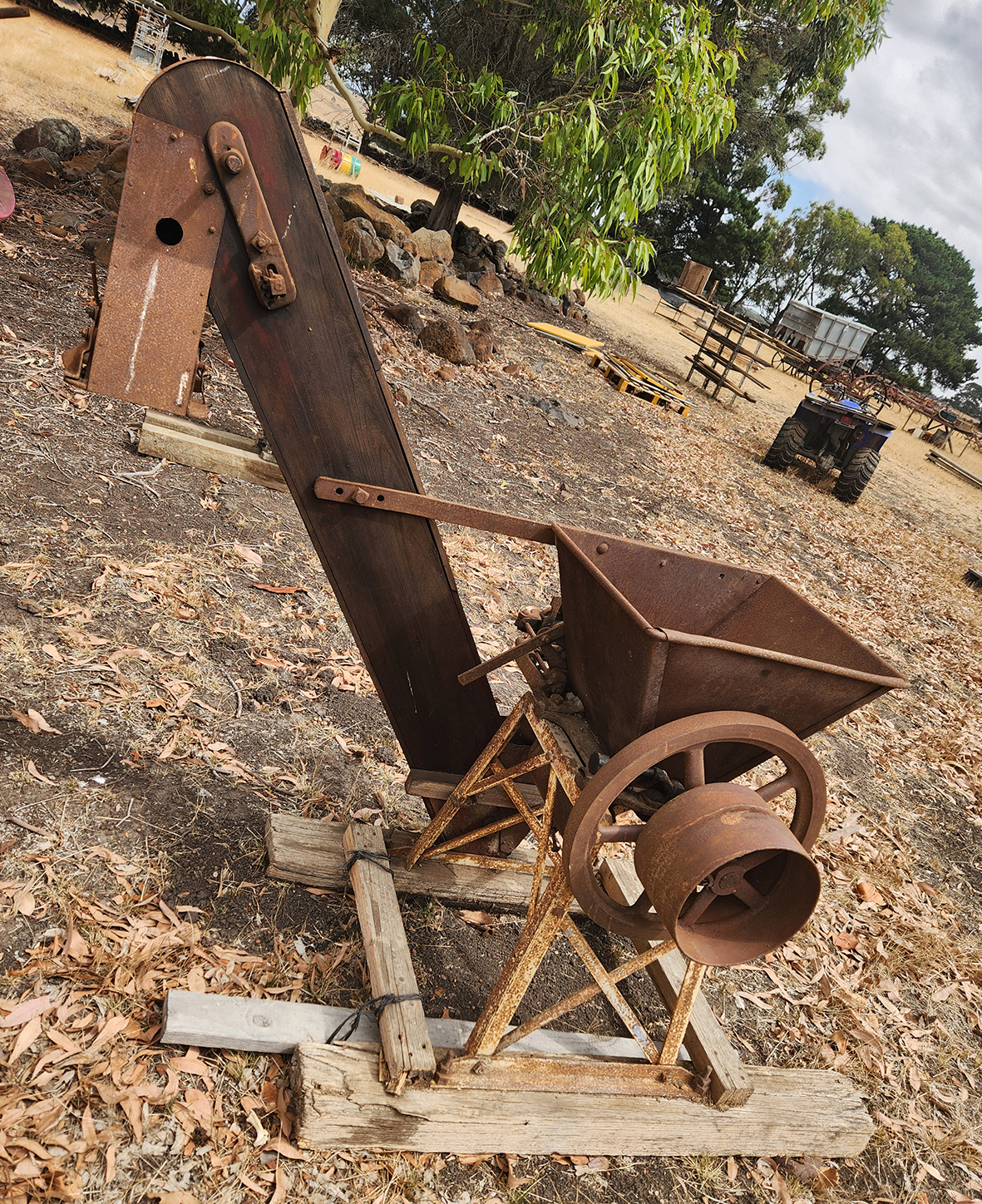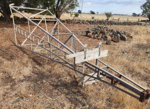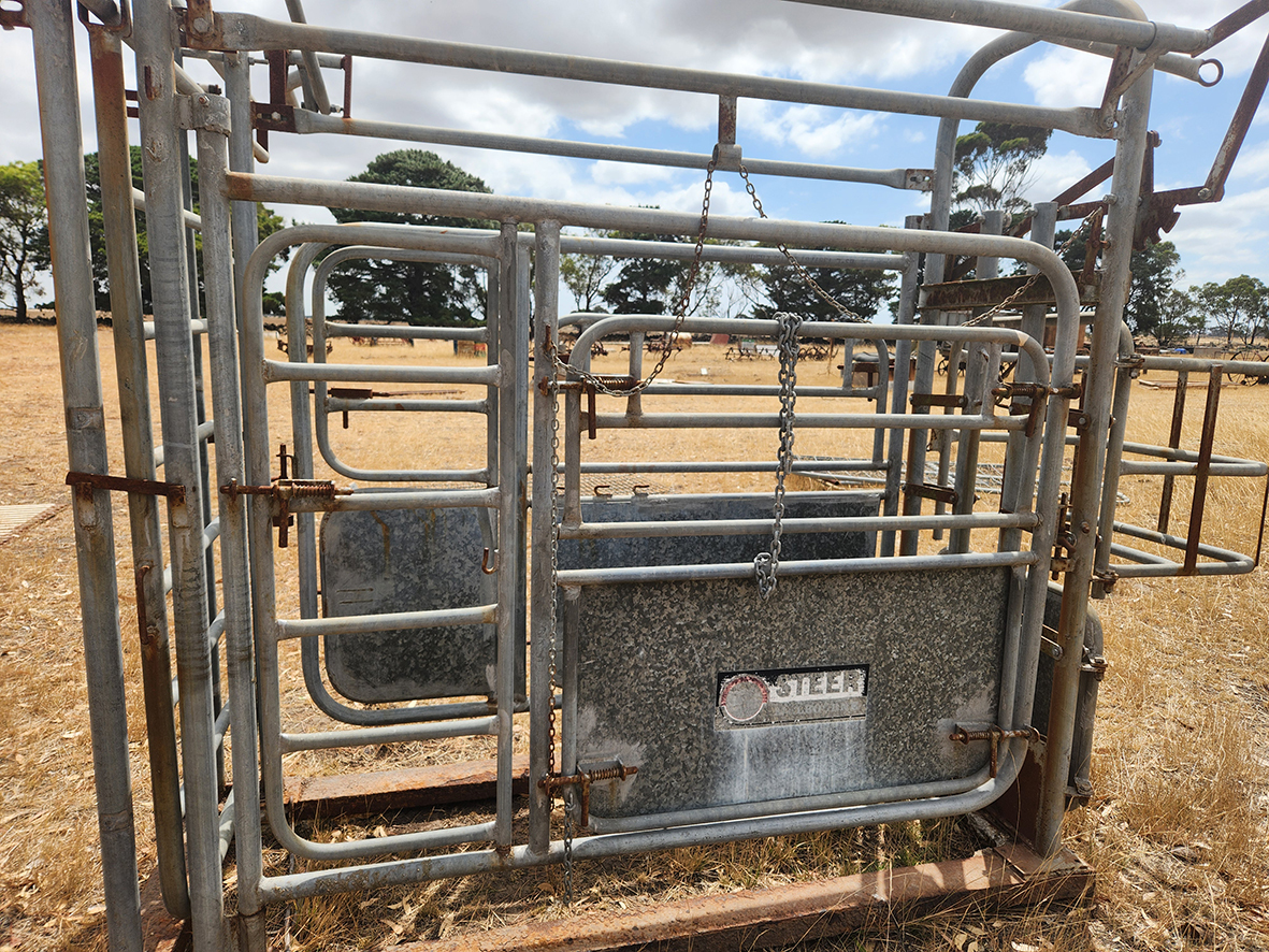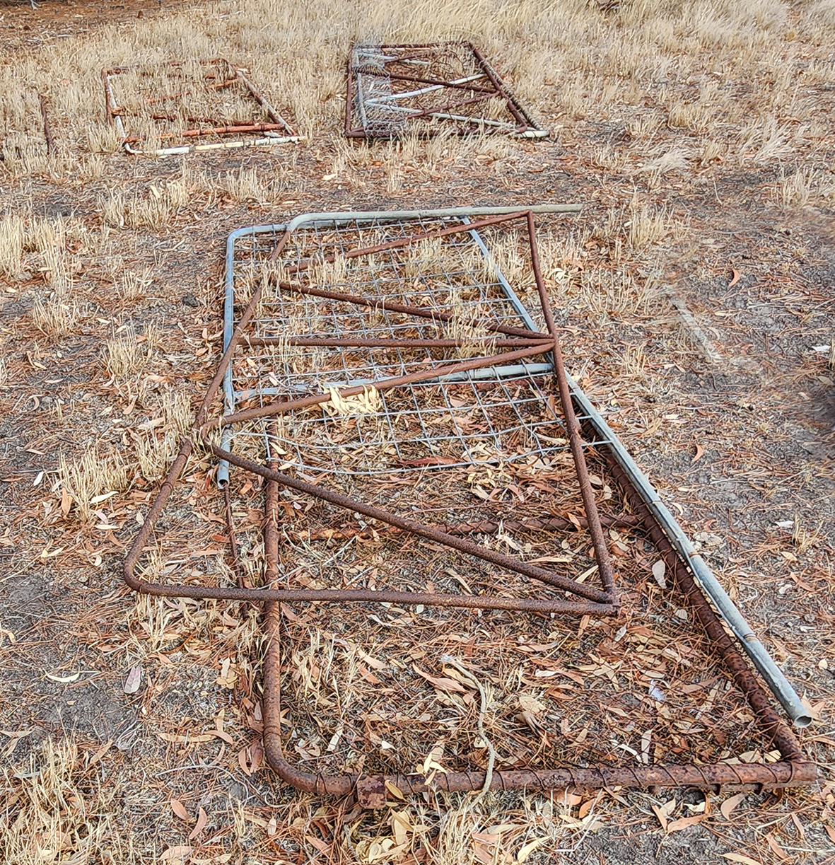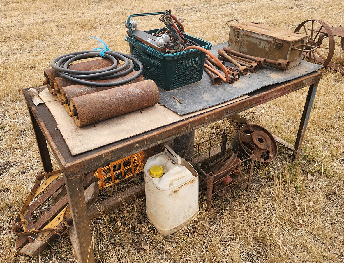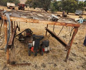 Steel fire pit; 4 x 44 galvanised Chairs; Steel baths; 2 x sandstone wheels; 44 gallon chariot pump, 20ft sheets iron roof and other lengths; Bloomfield jack; Daddy dry pickler; various gates; timber mesh guard rail steel; shelving; benches; various feed bins; 9ft x 6ft crate plus other items too numerous to mention.