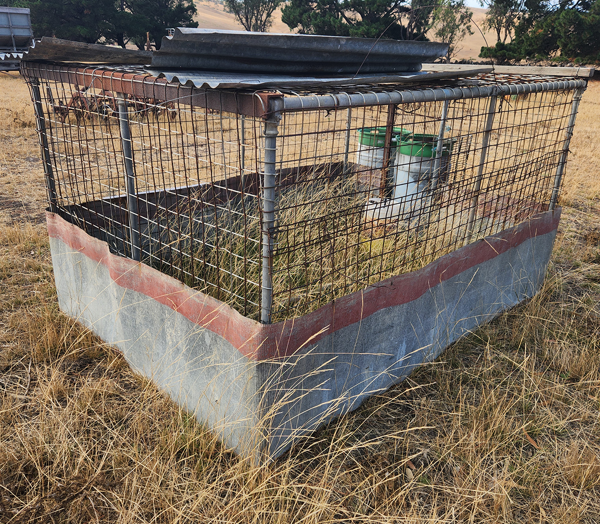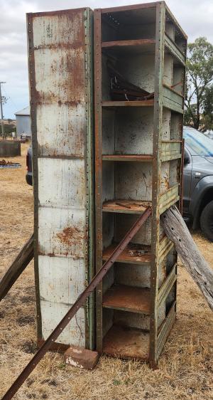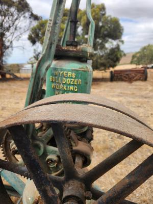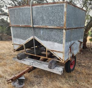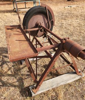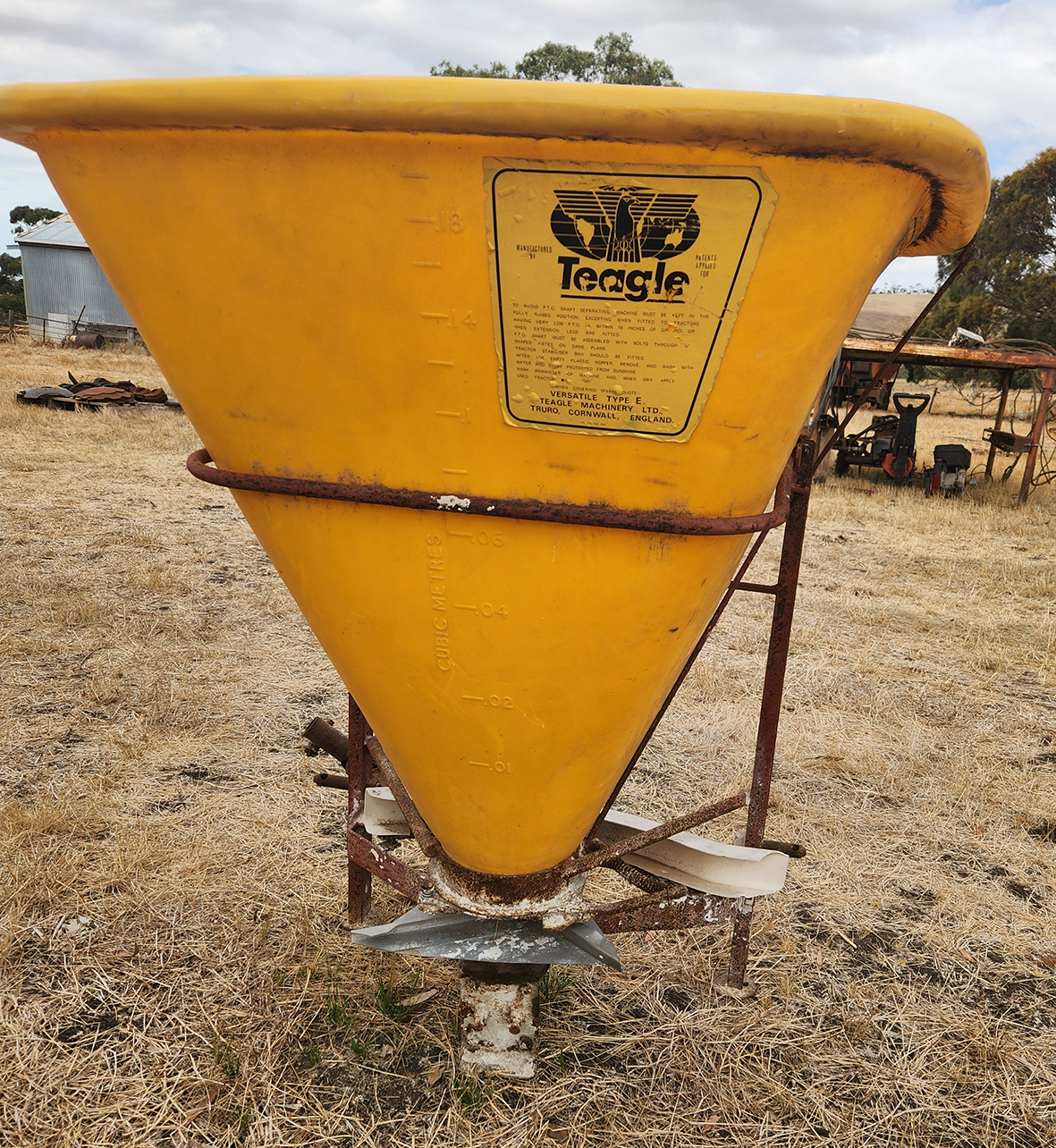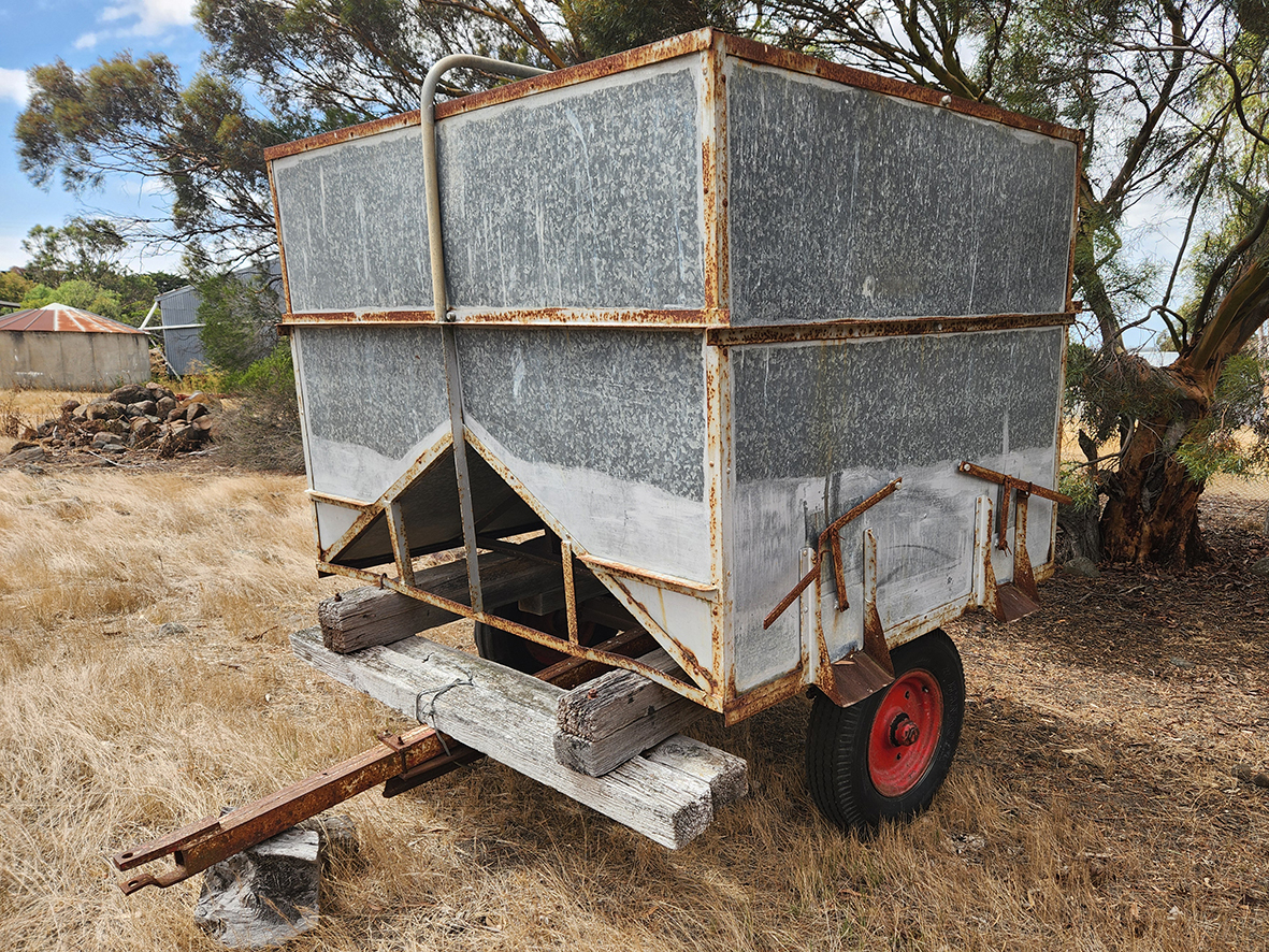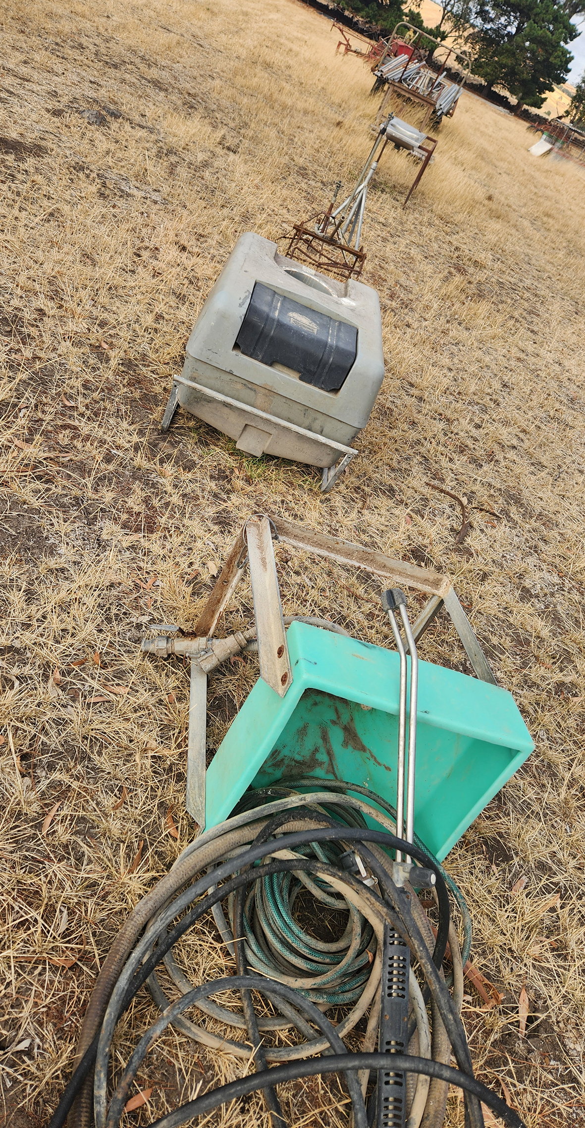 Steel fire pit; 4 x 44 galvanised Chairs; Steel baths; 2 x sandstone wheels; 44 gallon chariot pump, 20ft sheets iron roof and other lengths; Bloomfield jack; Daddy dry pickler; various gates; timber mesh guard rail steel; shelving; benches; various feed bins; 9ft x 6ft crate plus other items too numerous to mention.