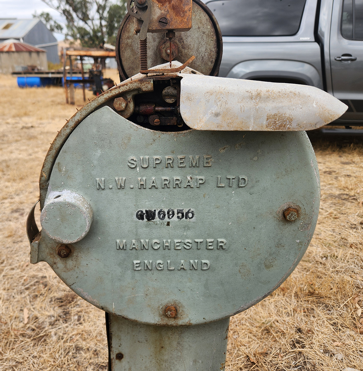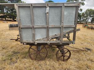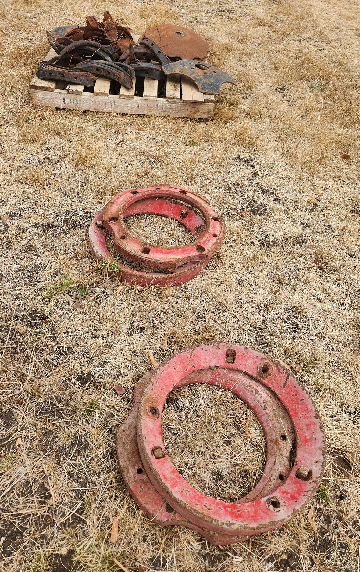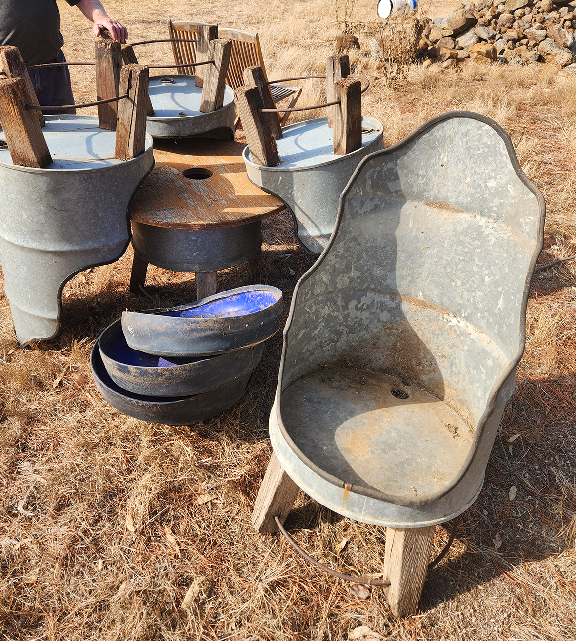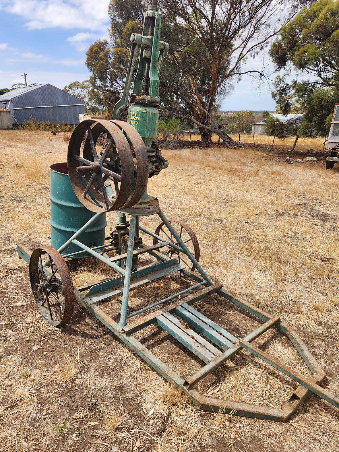 Steel fire pit; 4 x 44 galvanised Chairs; Steel baths; 2 x sandstone wheels; 44 gallon chariot pump, 20ft sheets iron roof and other lengths; Bloomfield jack; Daddy dry pickler; various gates; timber mesh guard rail steel; shelving; benches; various feed bins; 9ft x 6ft crate plus other items too numerous to mention.