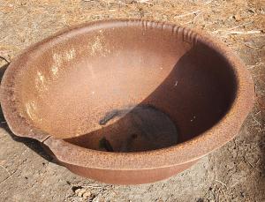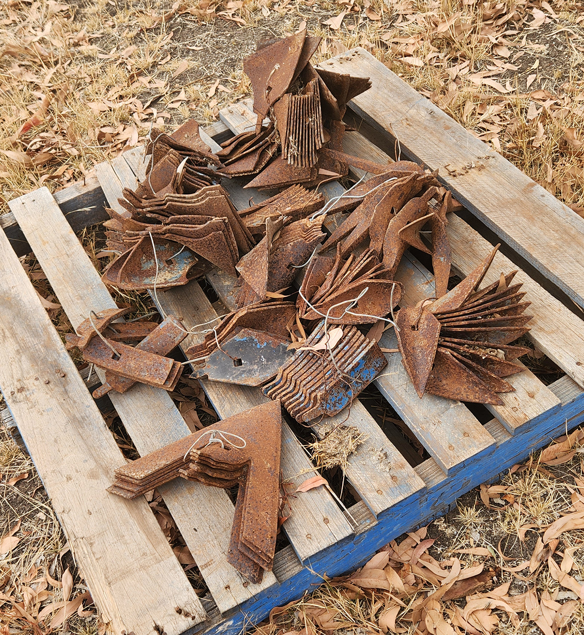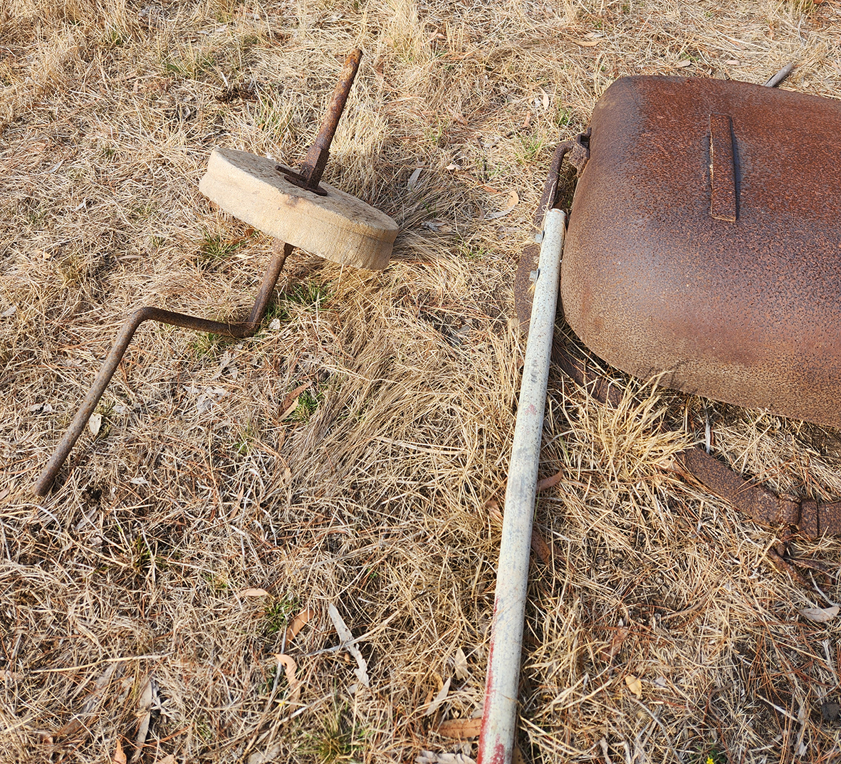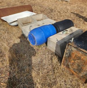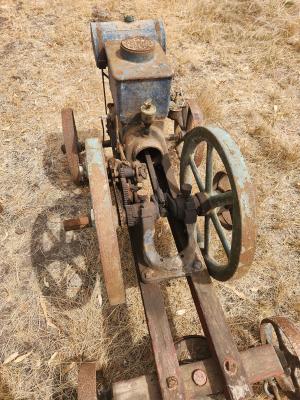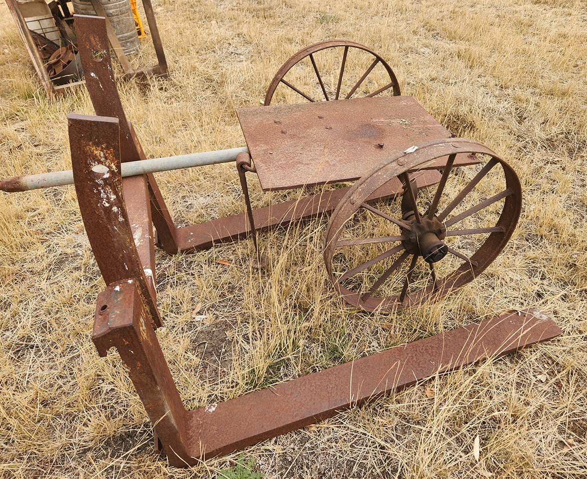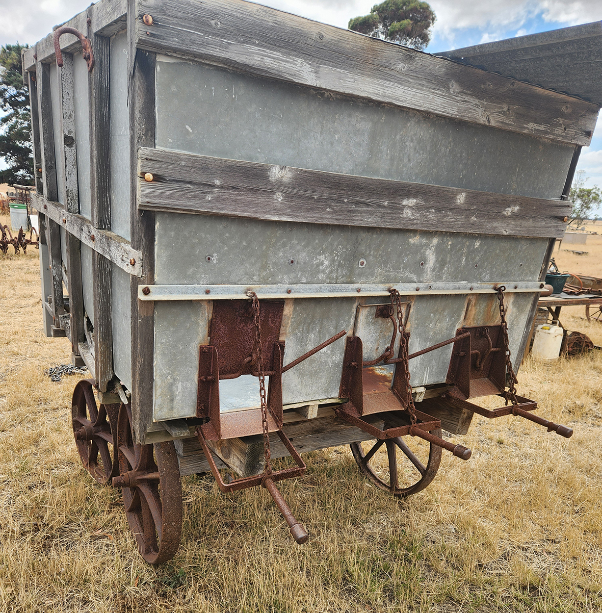 Steel fire pit; 4 x 44 galvanised Chairs; Steel baths; 2 x sandstone wheels; 44 gallon chariot pump, 20ft sheets iron roof and other lengths; Bloomfield jack; Daddy dry pickler; various gates; timber mesh guard rail steel; shelving; benches; various feed bins; 9ft x 6ft crate plus other items too numerous to mention.