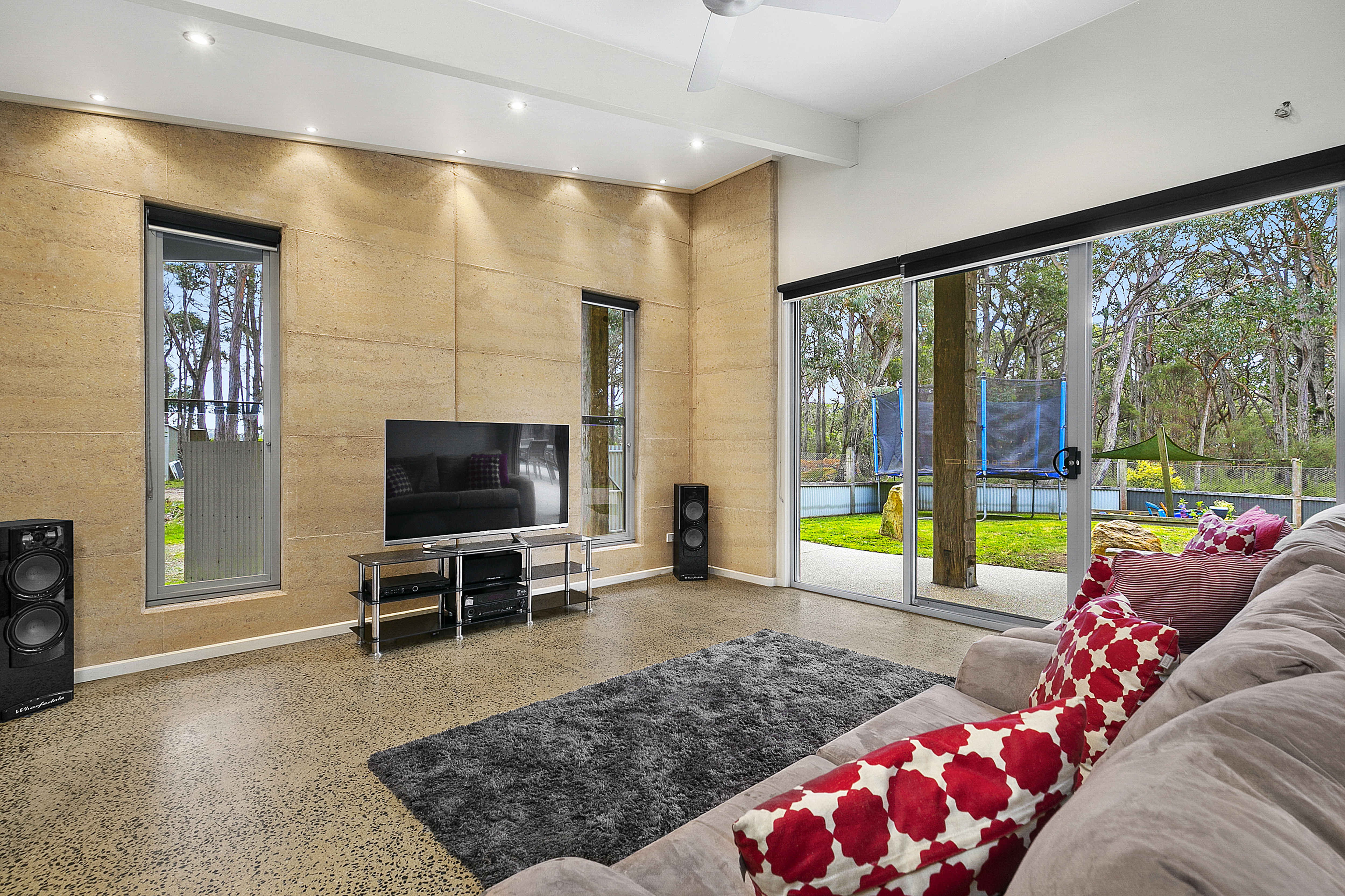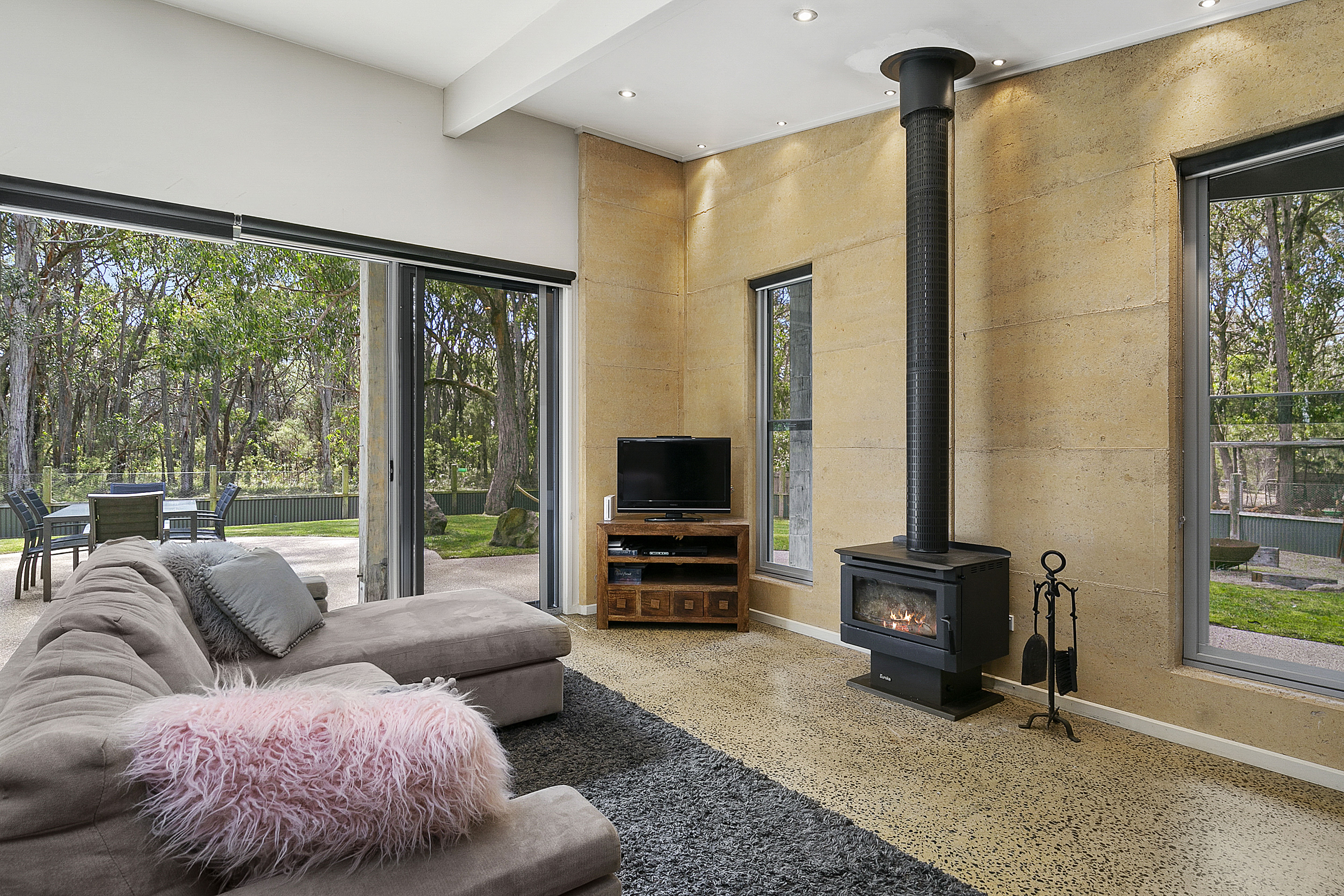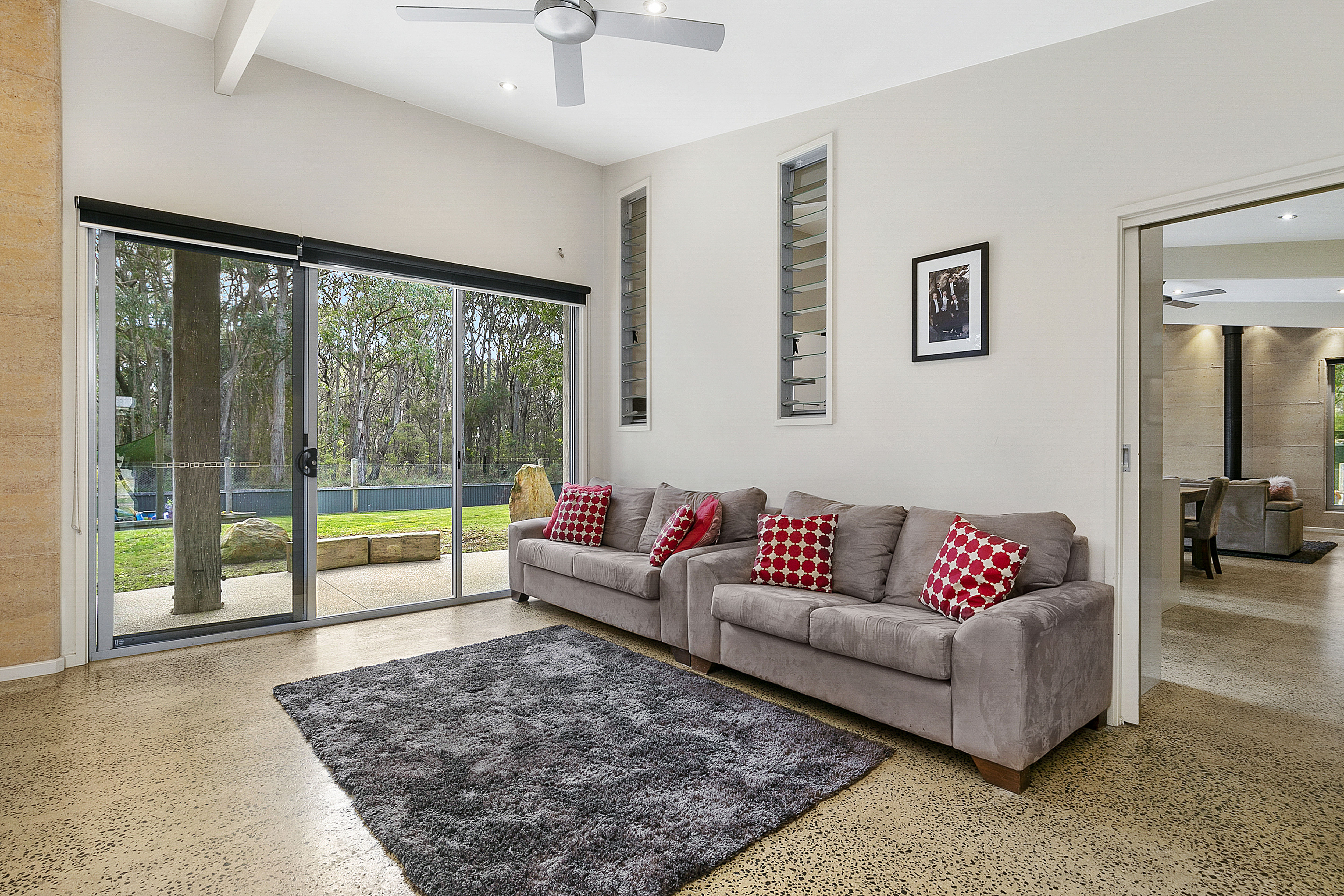 Architect designed, the home features a spacious open plan living/dining/kitchen with wood heater, formal lounge or rumpus room. Bedrooms have built in robes and an ensuite to the master bedroom. North facing windows give a light filled outlook over the lawns and outdoor entertaining areas and out to bushland as a backdrop.