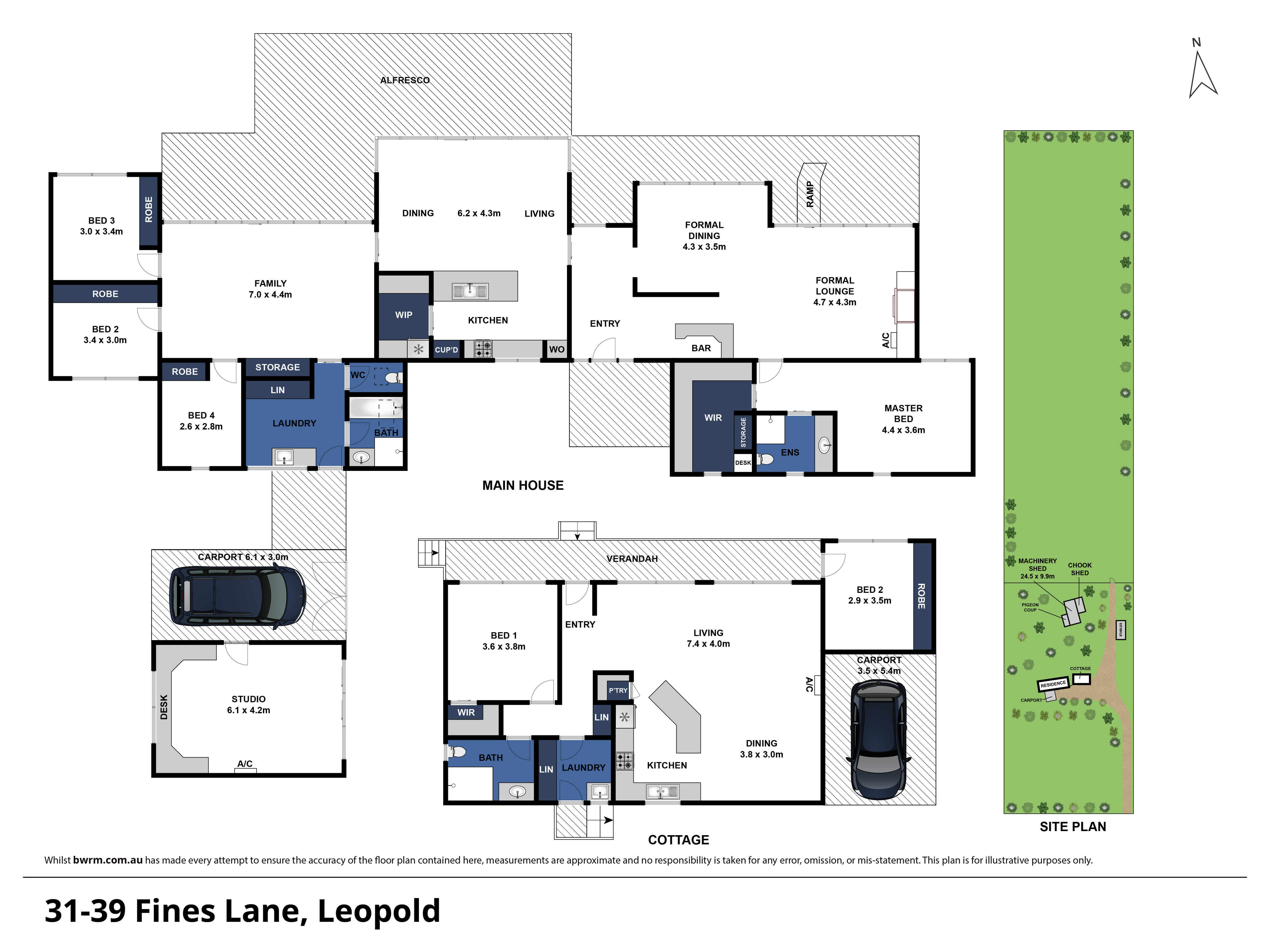 The main residence consists of four bedrooms, master with ensuite and WIR, formal lounge and dining with wood fire and split system, open plan kitchen/dining/living, family room, studio/office, single carport and undercover alfresco area.