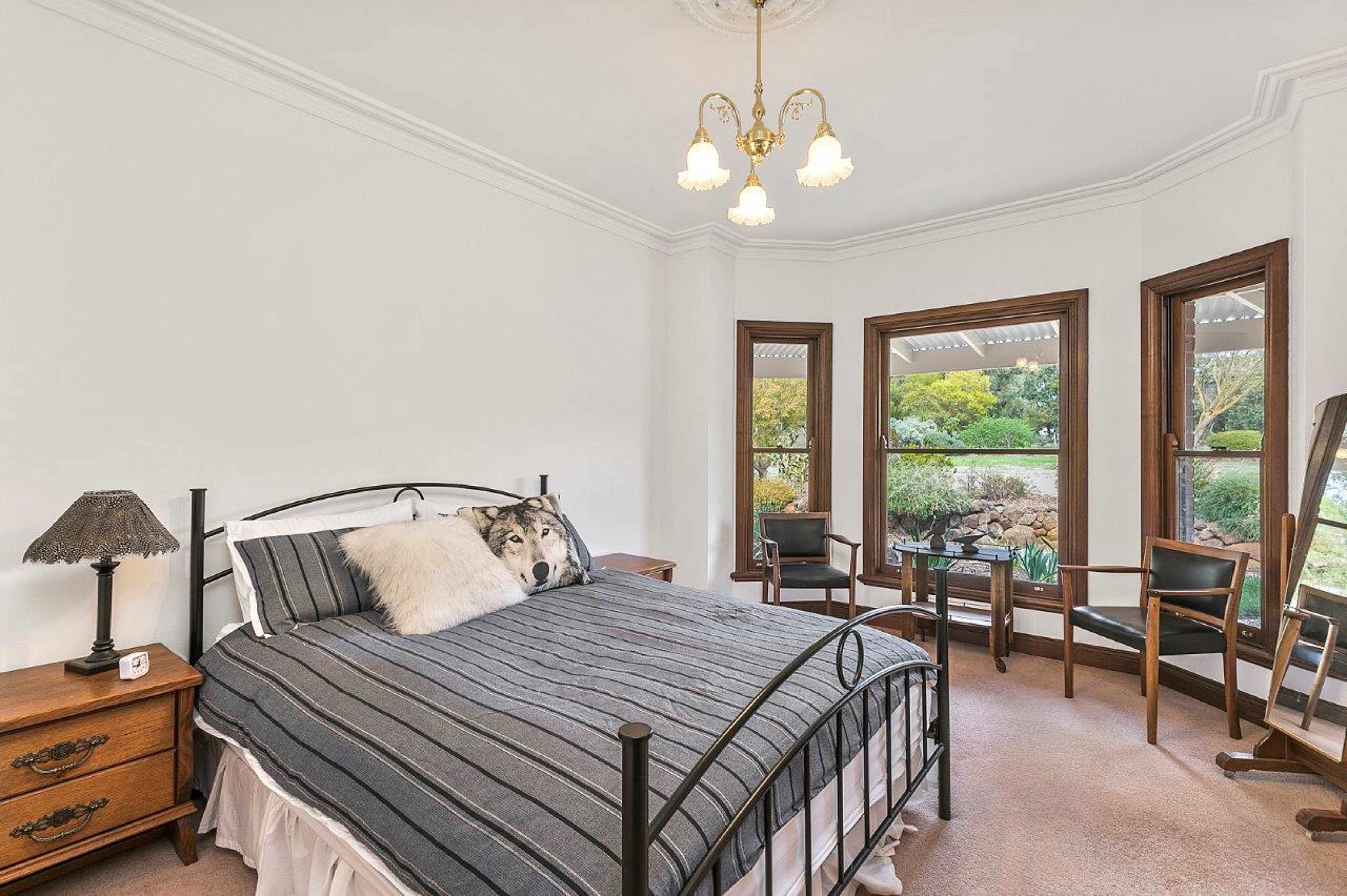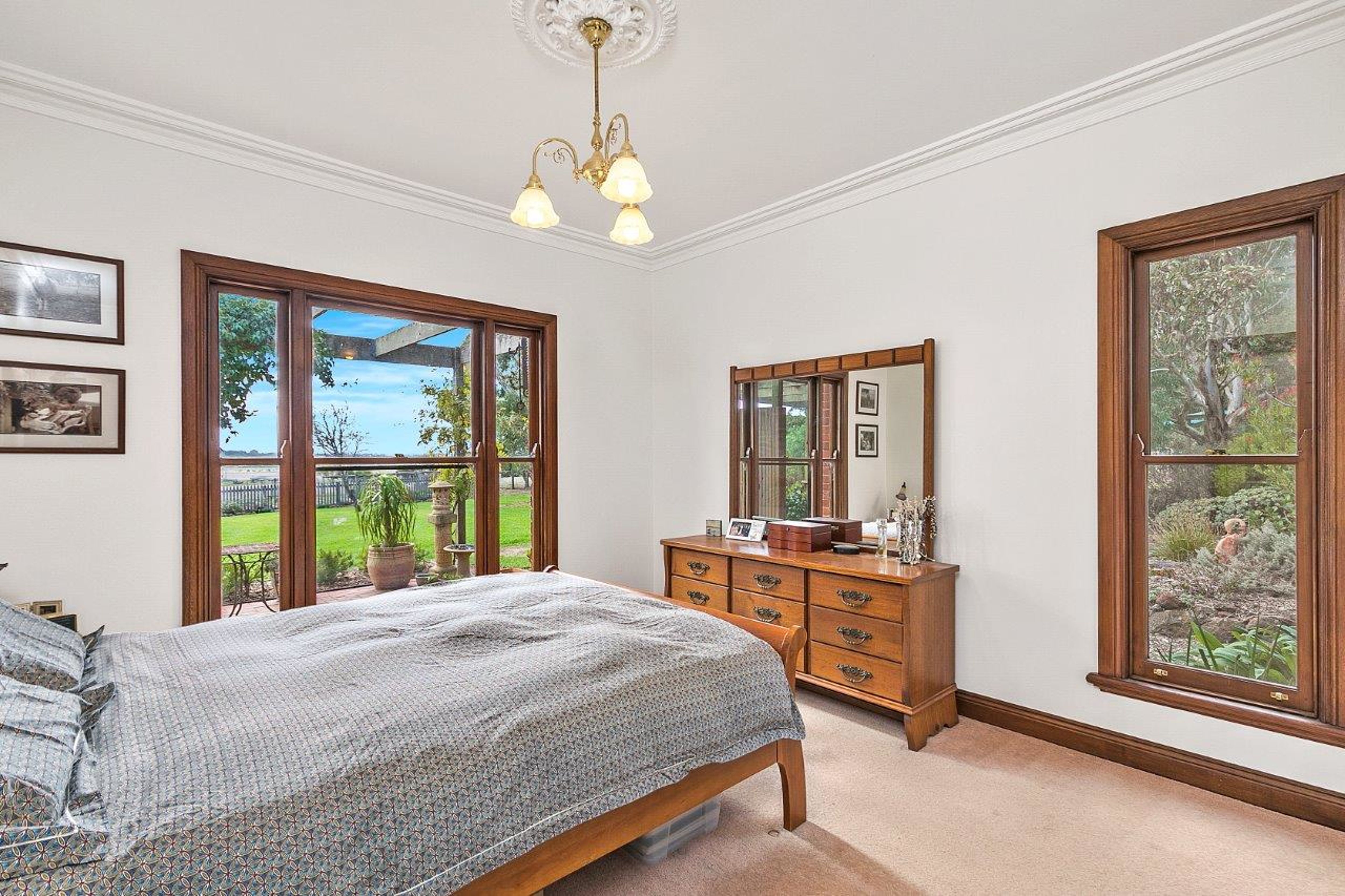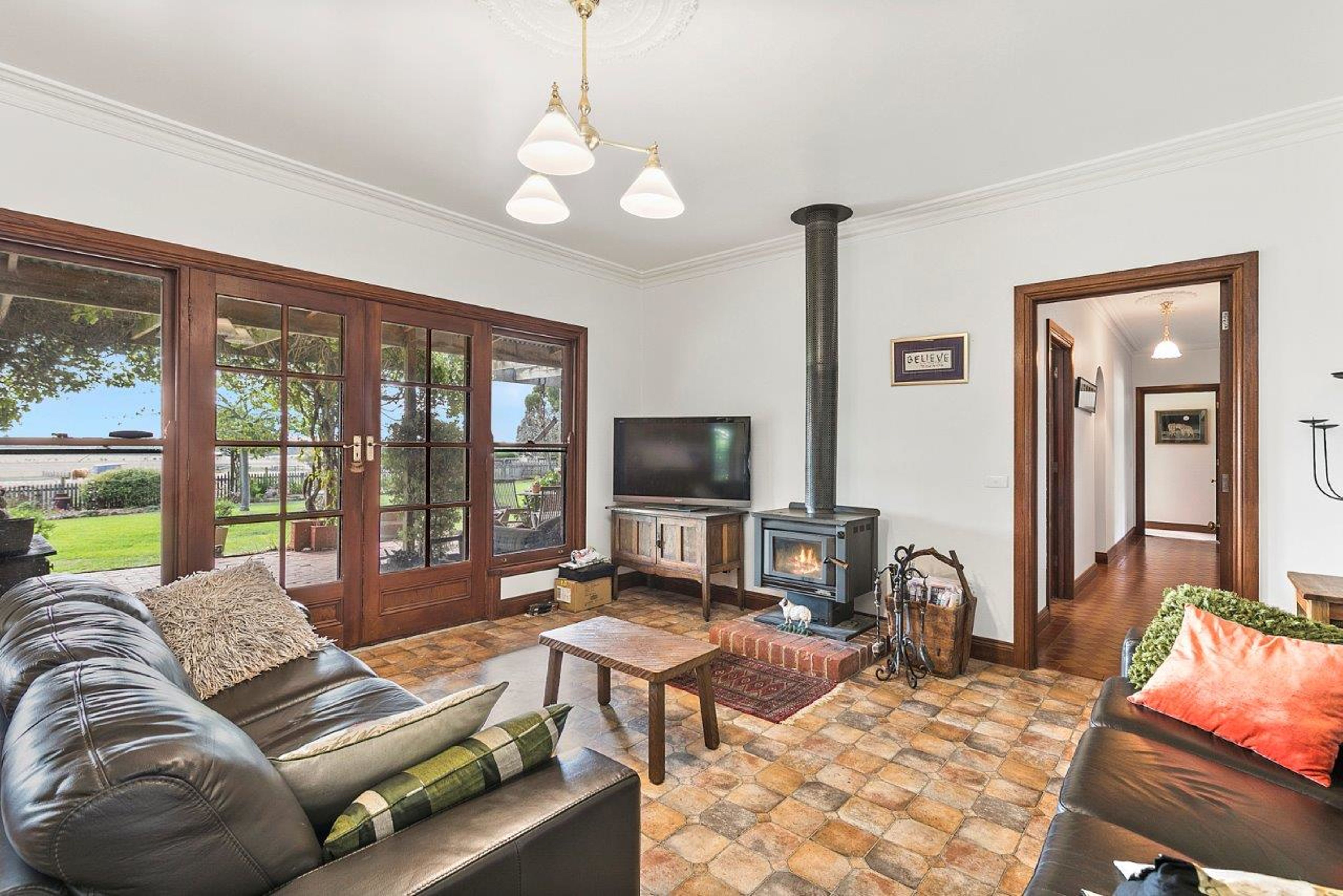 Other features include ornate ceiling roses and cornices, bevelled double glass doors internally and wood heating, a central family bathroom, functional and spacious laundry, solar powered HWS, a large outdoor paved, north facing entertaining area looking over the land.