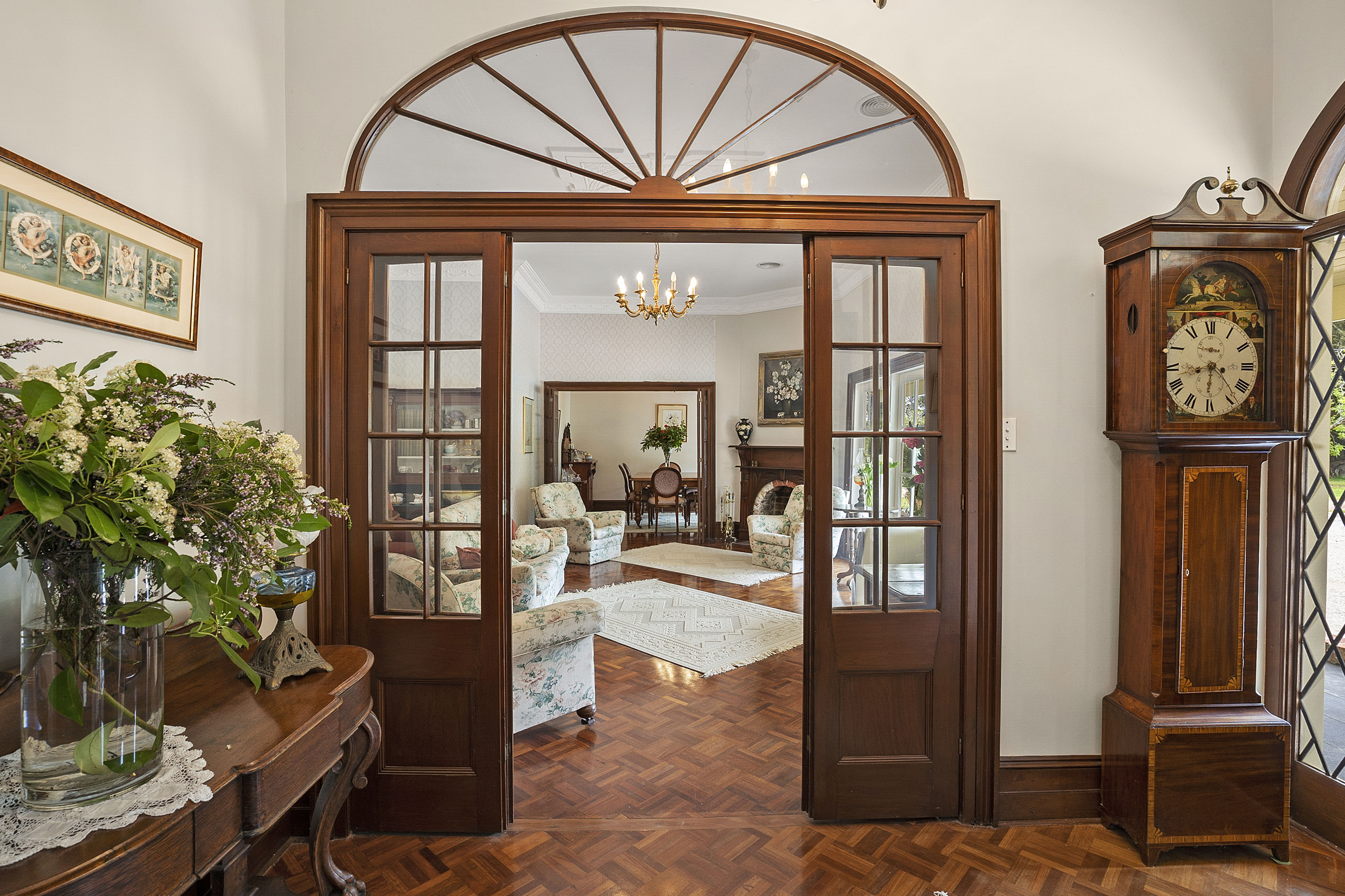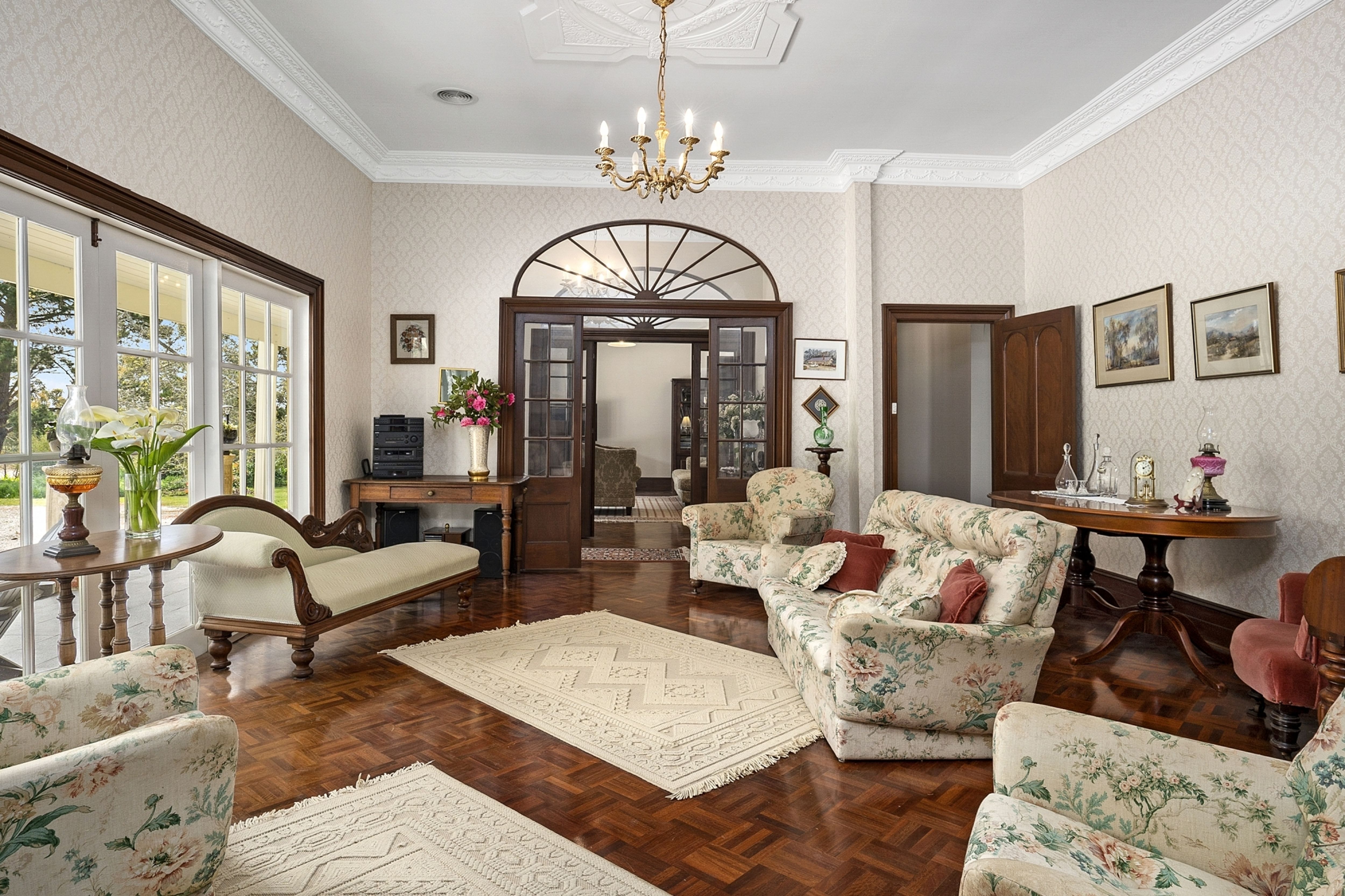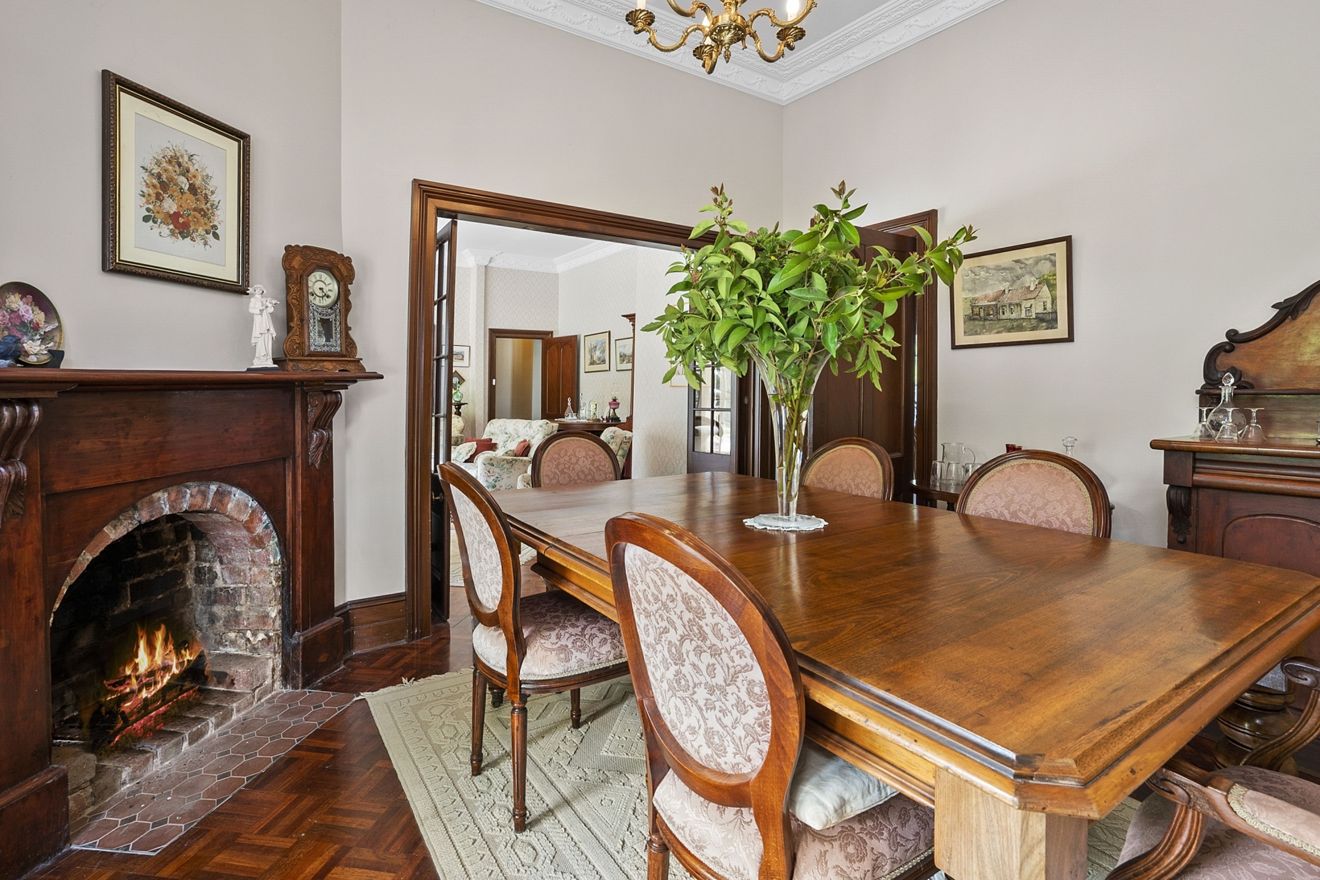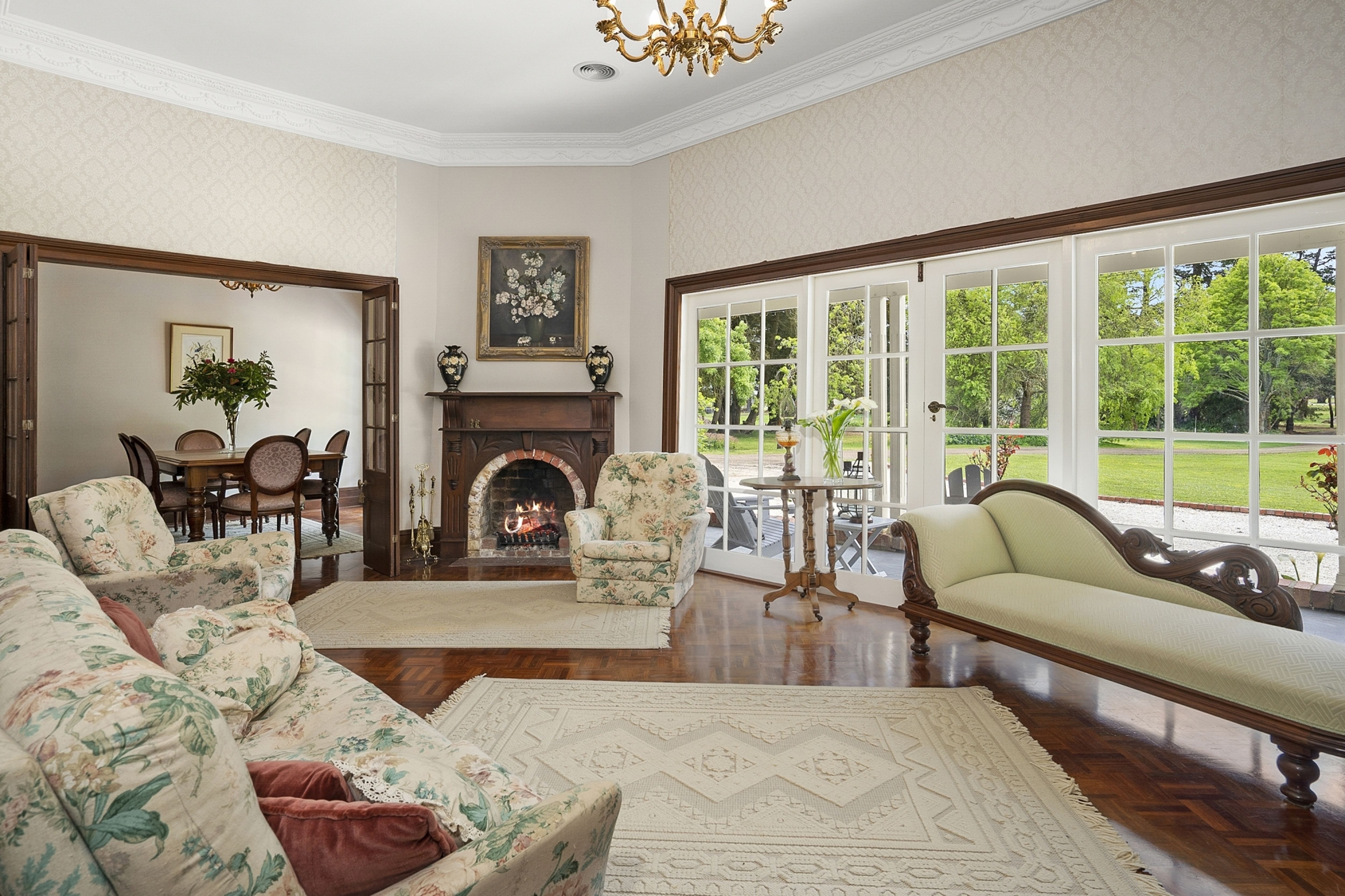 The stunning front entrance off the north facing veranda leads to formal lounge, dining areas and second casual lounge area all with stunning parquetry floors, open fires and high ceilings with sweeping views over the expansive garden. The home has zoned ducted heating throughout.