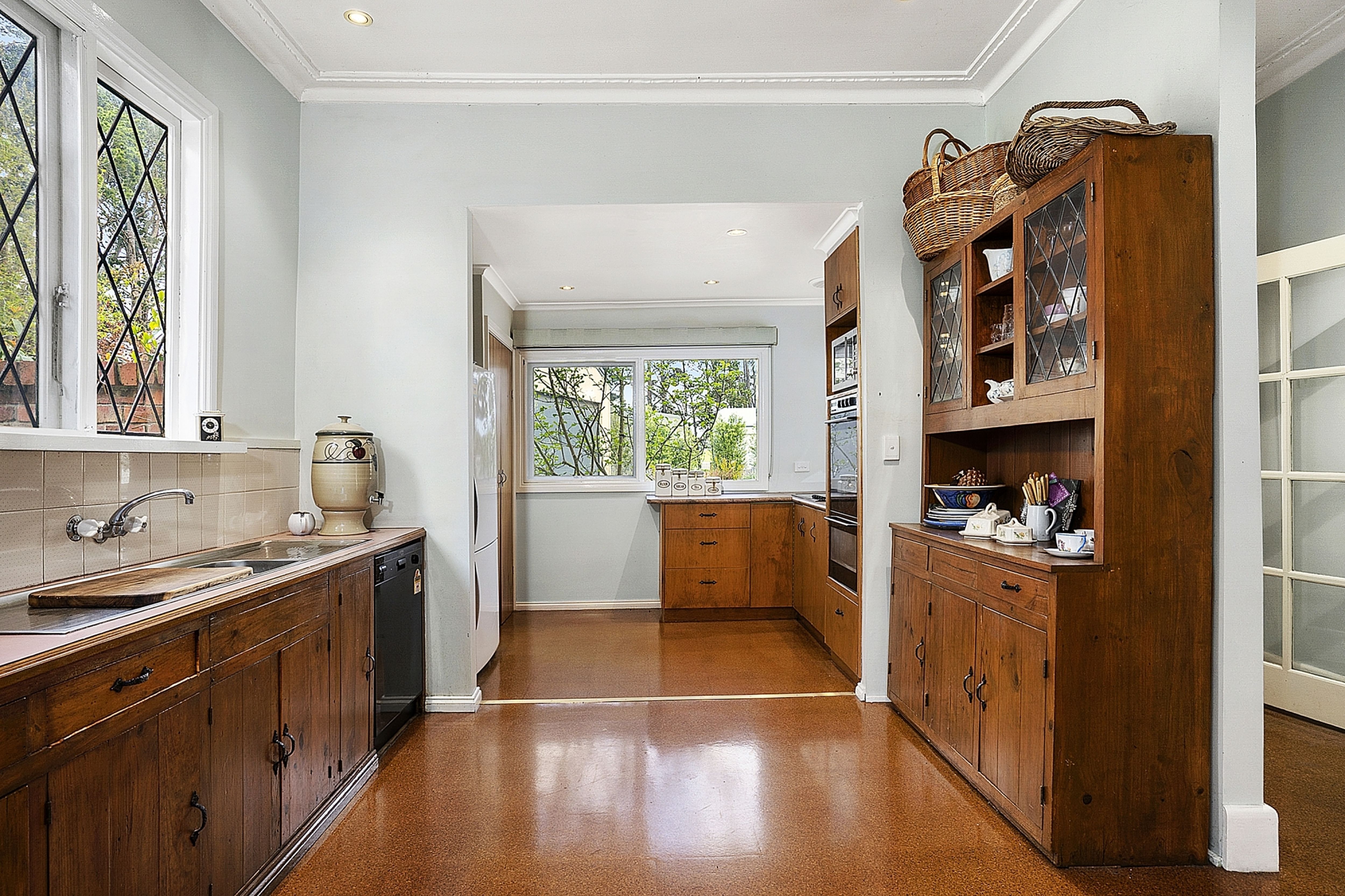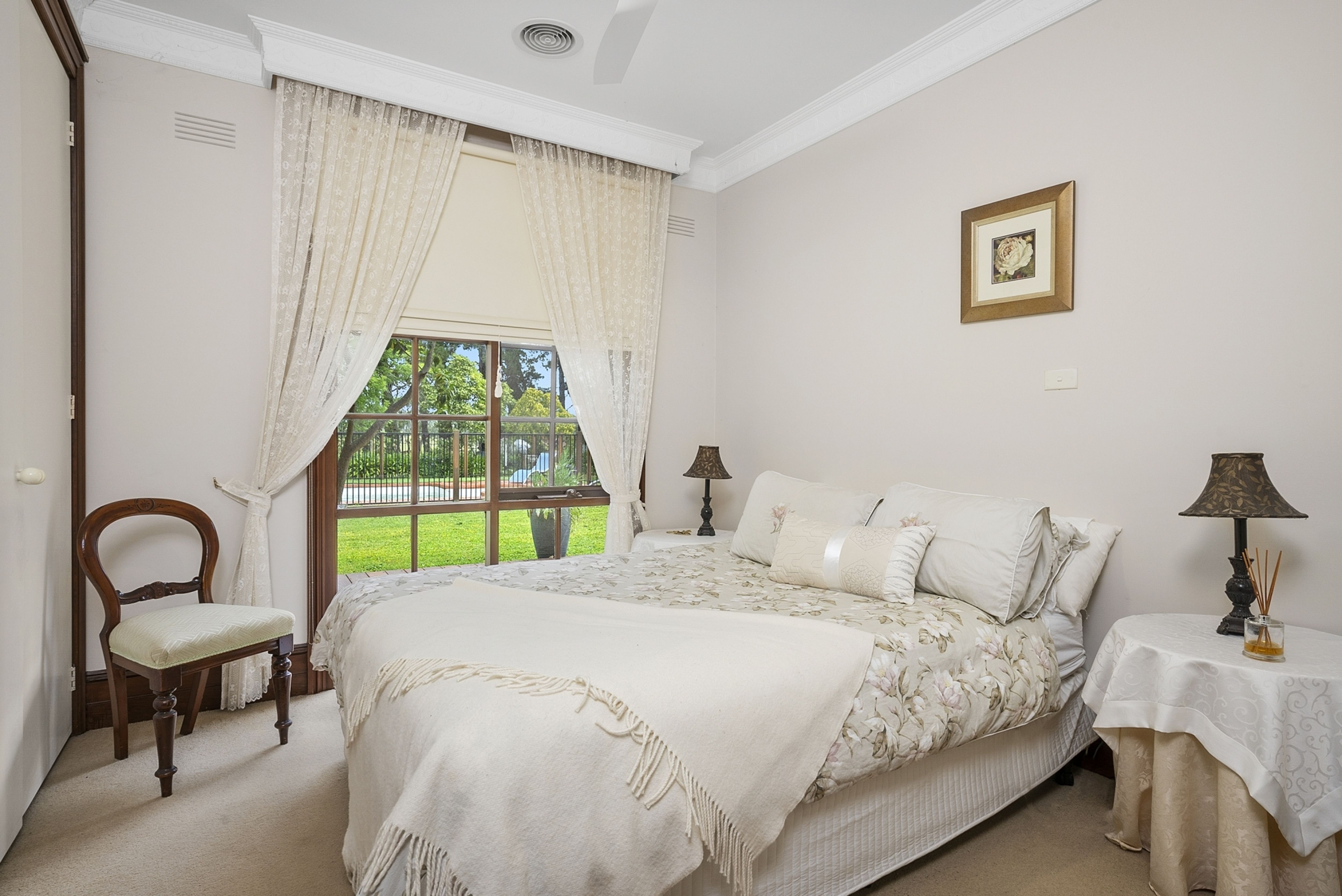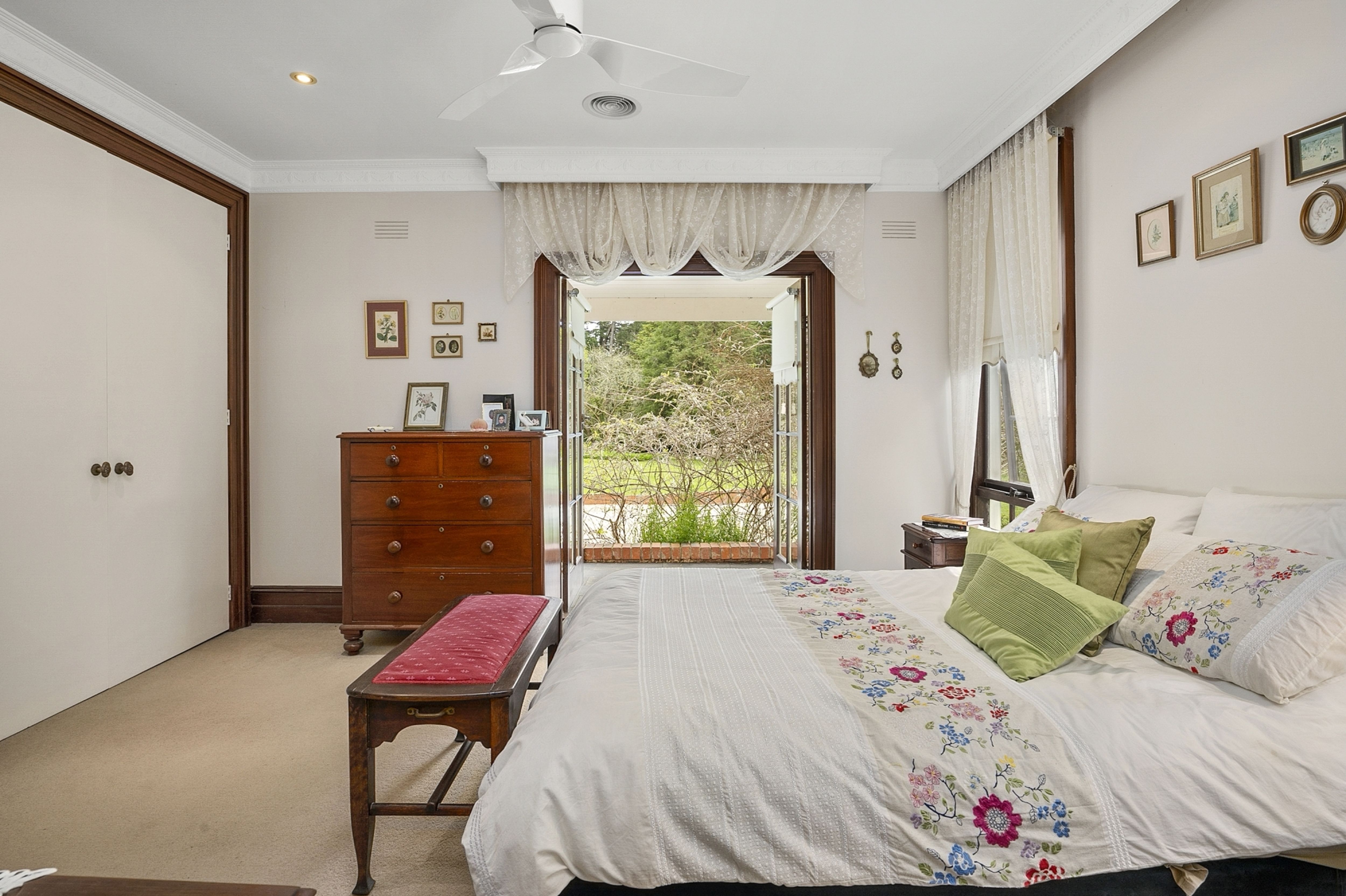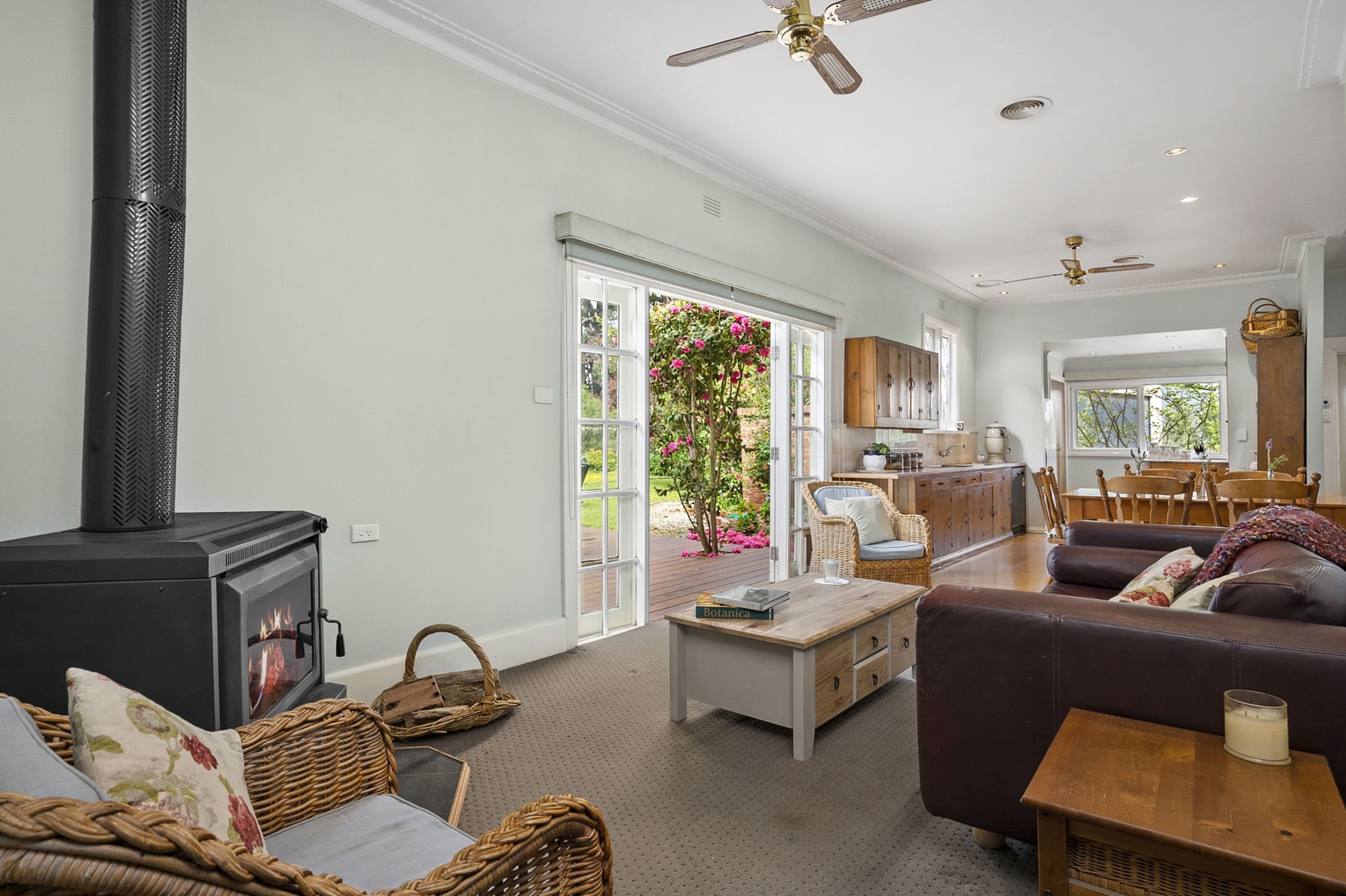 The stunning front entrance off the north facing veranda leads to formal lounge, dining areas and second casual lounge area all with stunning parquetry floors, open fires and high ceilings with sweeping views over the expansive garden. The home has zoned ducted heating throughout.