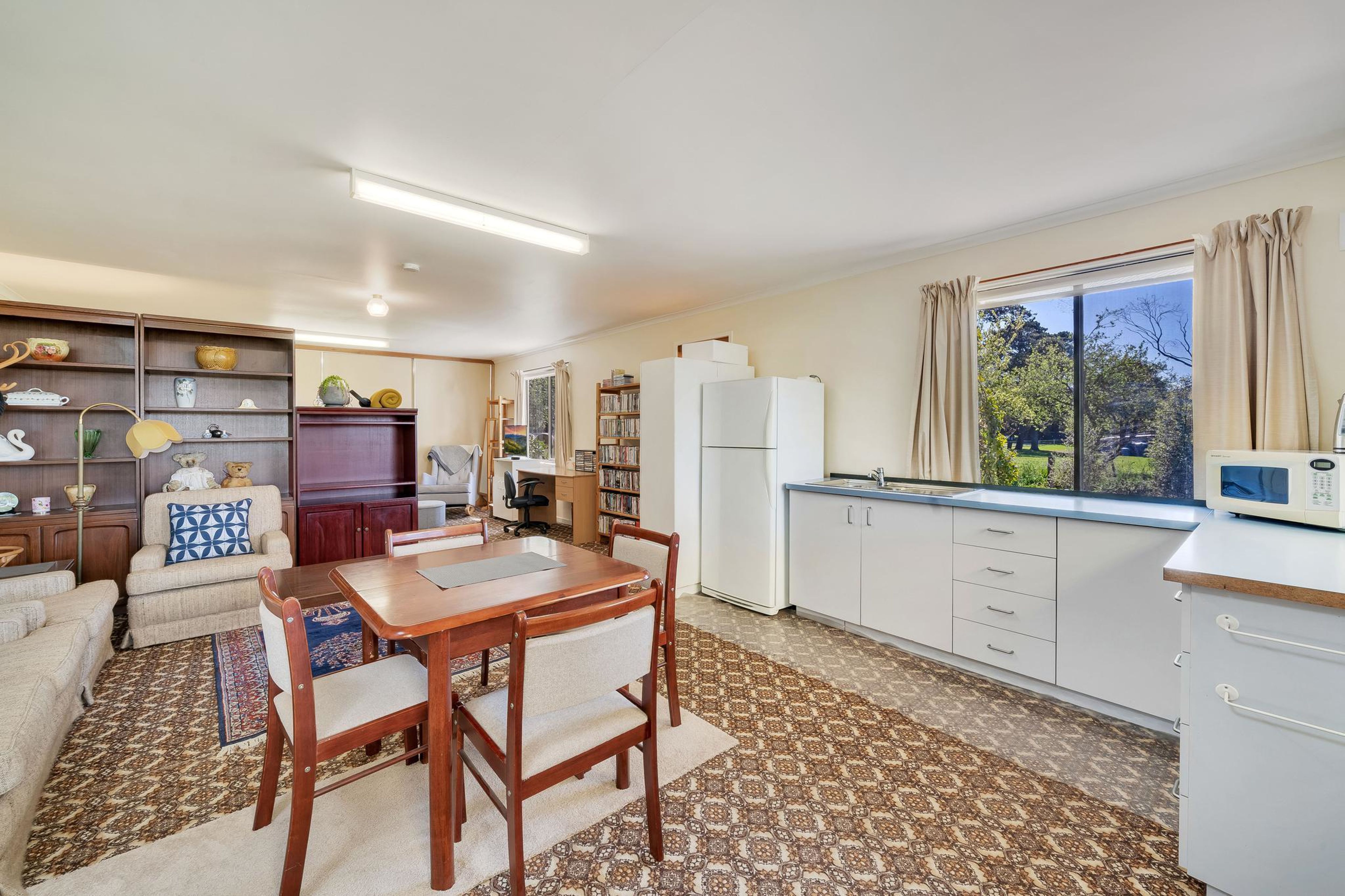 A tree line driveway leads to the home offering 4 spacious bedrooms, two bathrooms, an expansive lounge & dining space with a northerly aspect (plus open wood fire &gas heating), kitchen plus a convenient laundry / mudroom room entry at the rear.