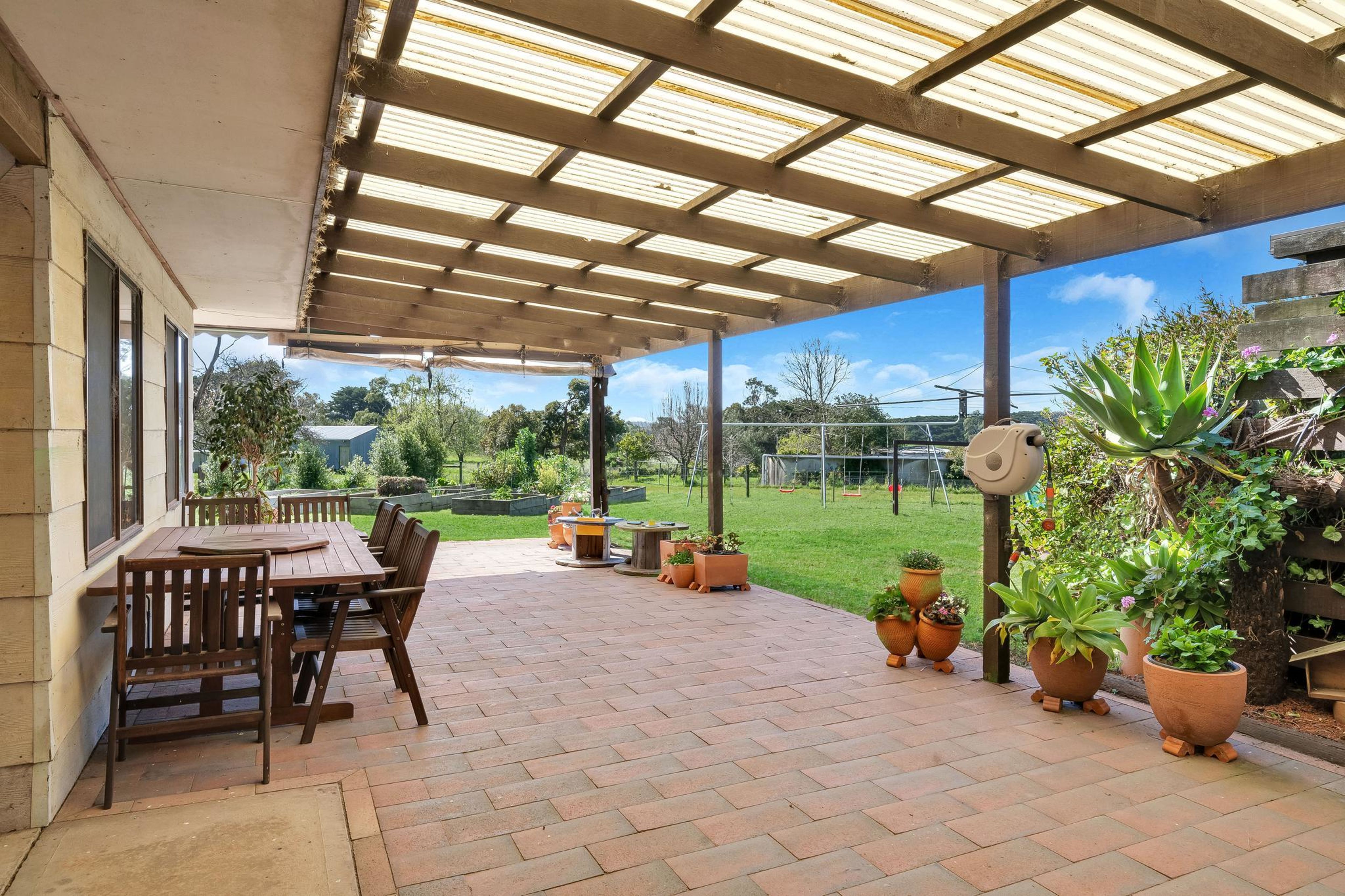 To the rear of the home is a self-contained unit complete with bathroom, kitchenette and gas heater. An undercover entertaining area offers vistas over the gardens to Mount Moriac.