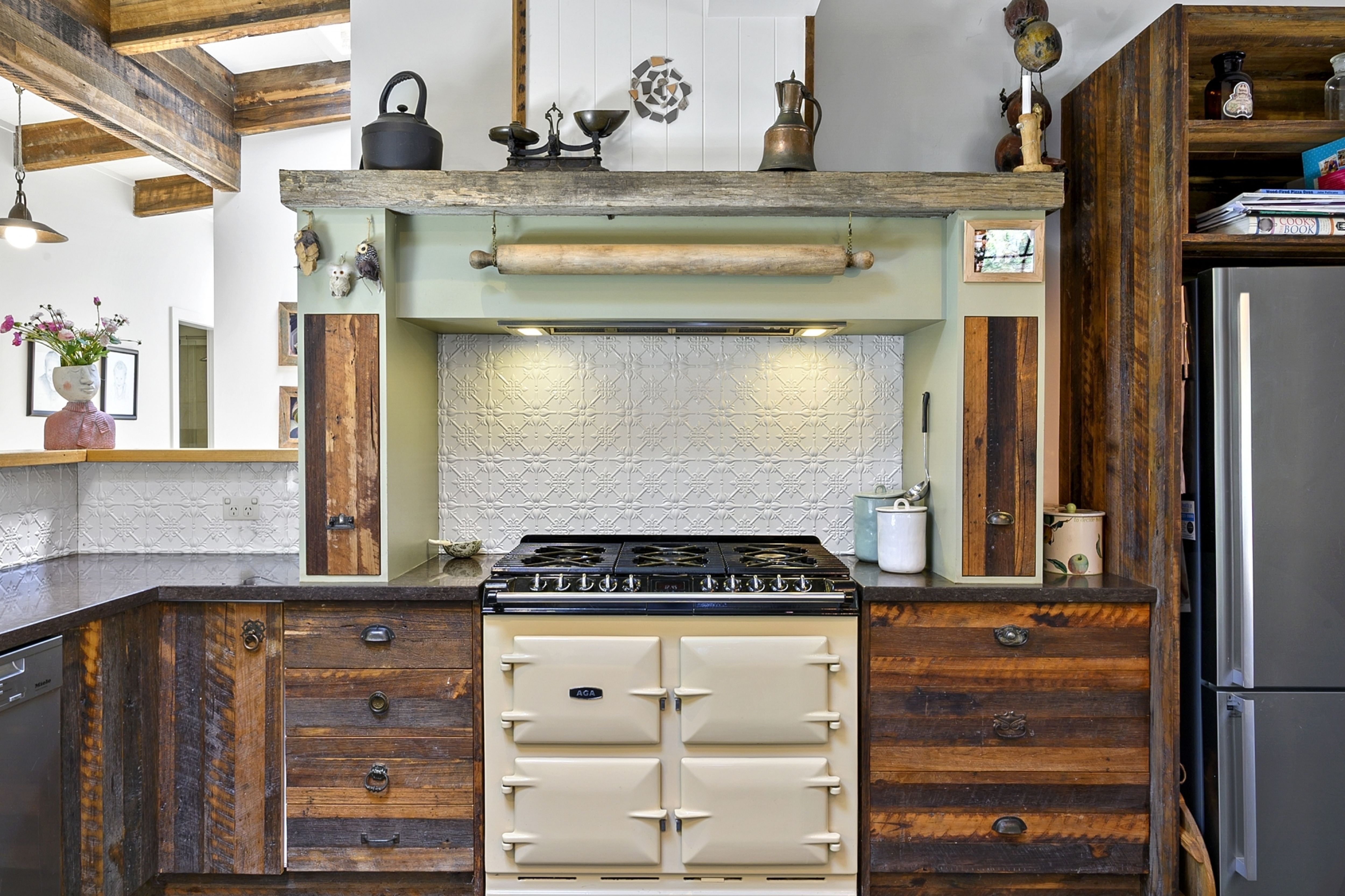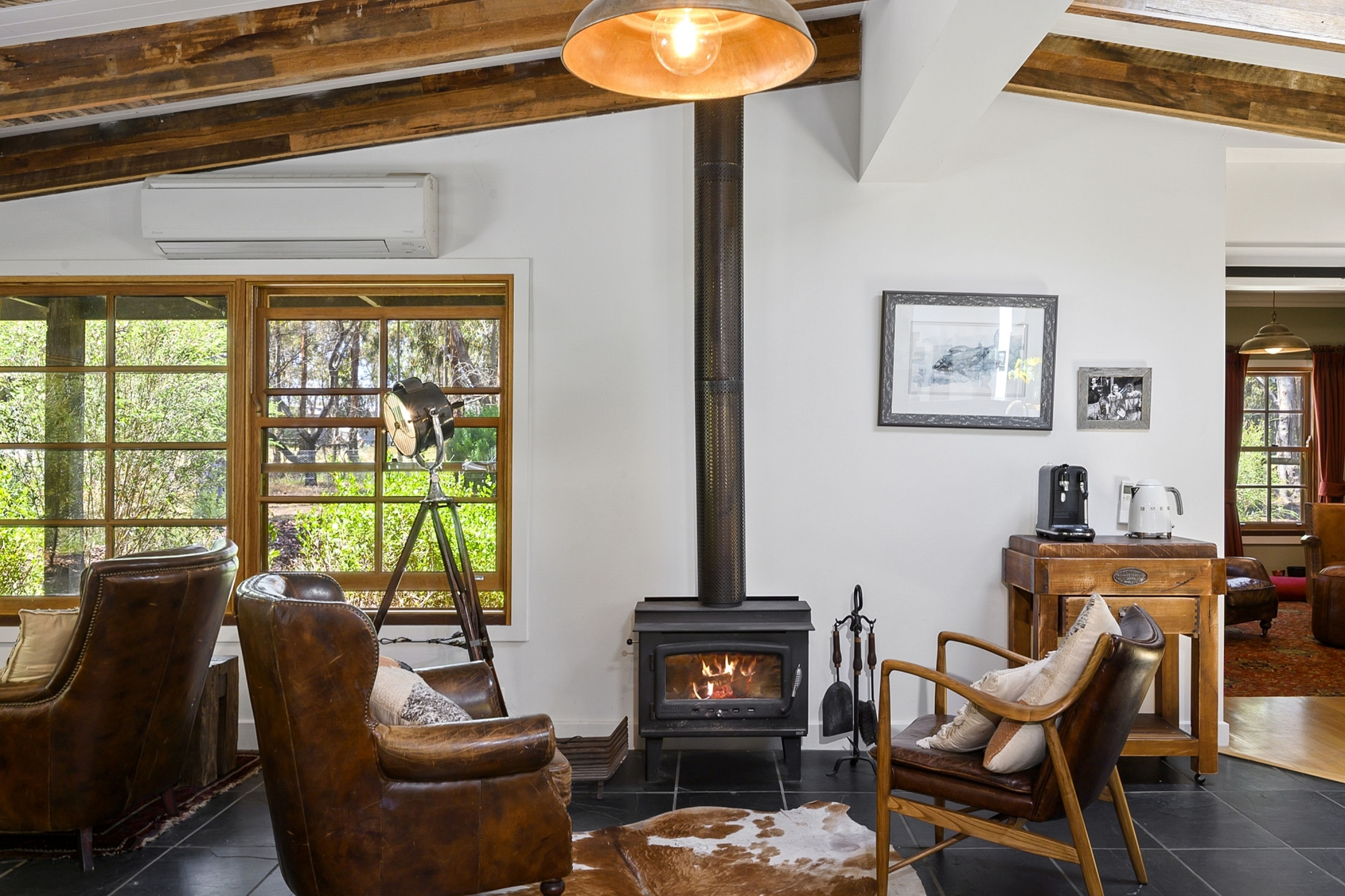 An open kitchen, living & dining space is the hub of the home with the gas/electric 4 door AGA stove taking pride of place, offset by a gorgeous pressed metal splash back, quality stone bench tops, dishwasher, farmhouse-style sink, split system and a beautiful Nectre wood fire for extra warmth.