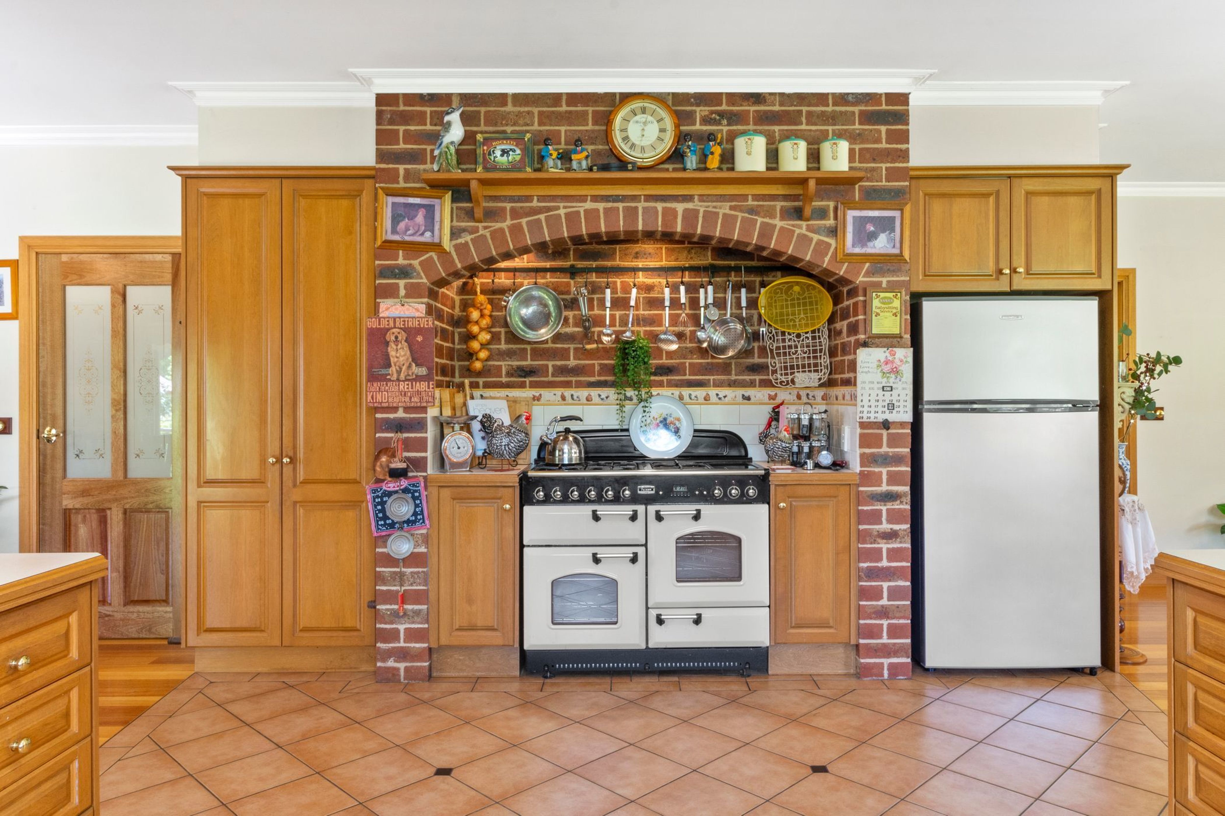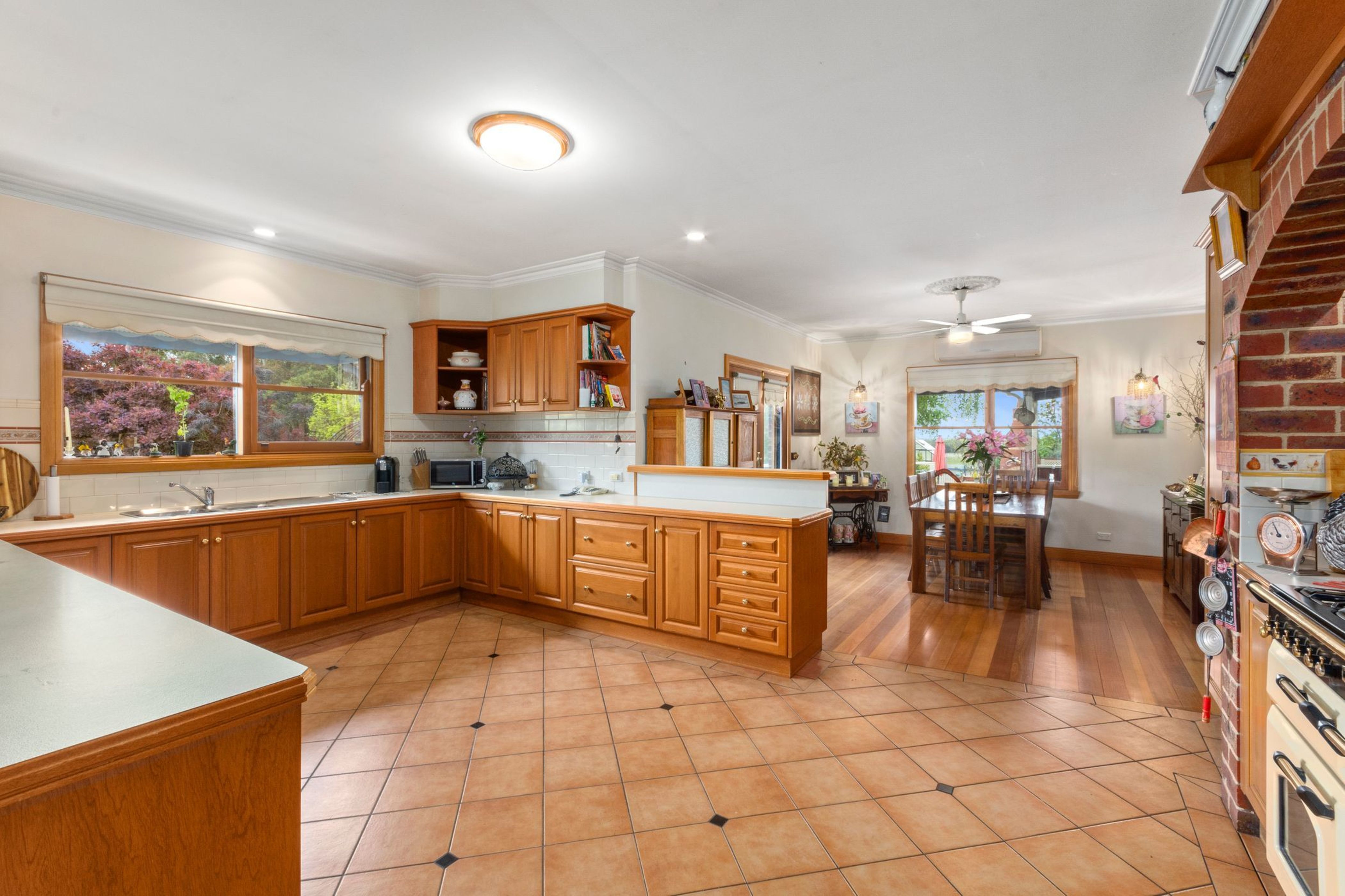 Comprising a spacious open plan, living and dining with hardwood floors,Heat Charm wood fire, split system and spacious timber kitchen with Falcon Upright Stove.