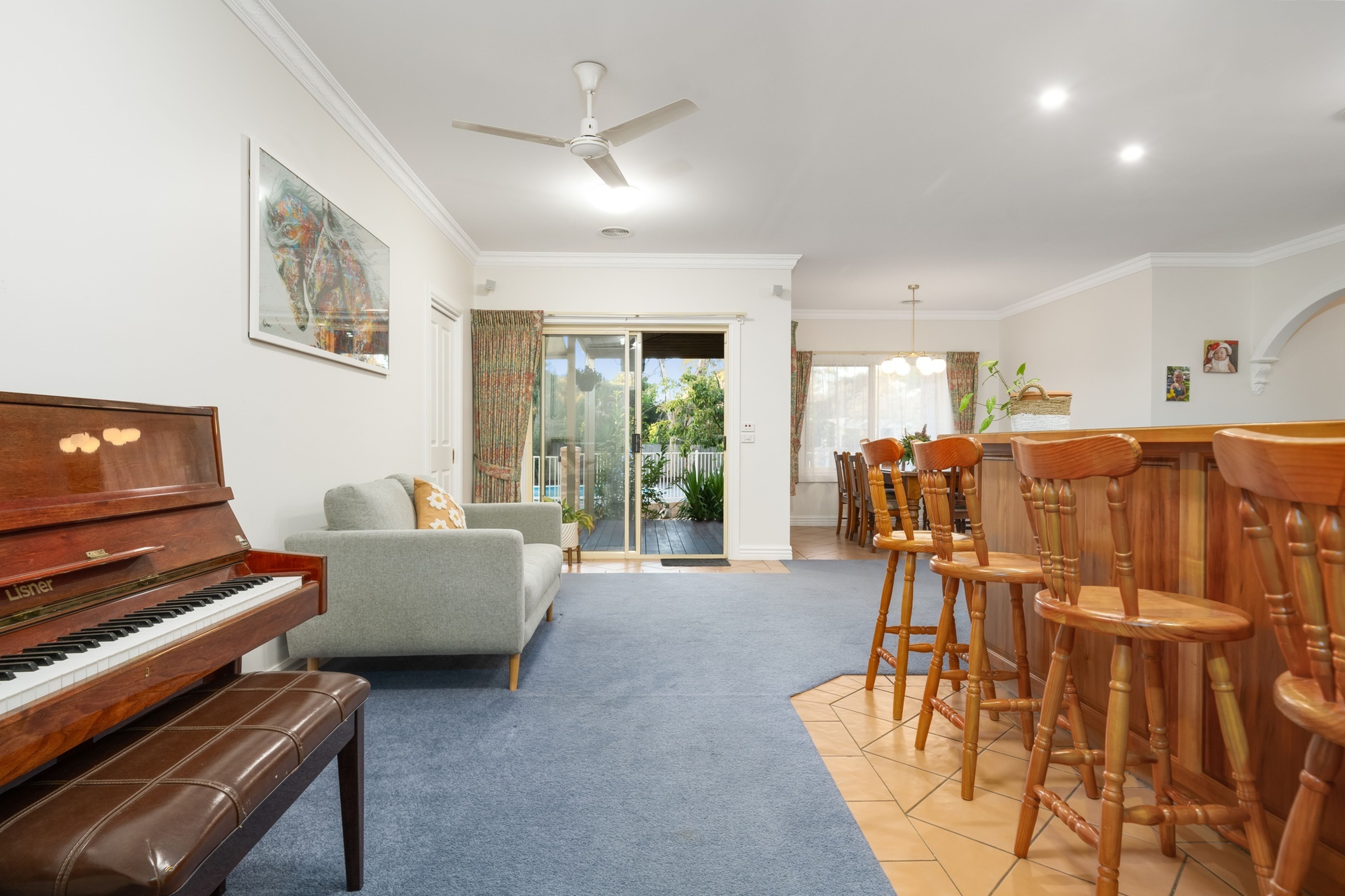 This central area is the hub of the home and enjoys a lovely northerly aspect with a designated meals/dining space and sitting area which effortlessly flows out to the extensive outdoor decked entertaining area fitted with 'café style' ceiling-mounted strip heaters and an electric remote awning - the perfect space for year-round entertaining! Enjoying beautiful views of the secure garden, fenced play area with synthetic turf and cubby house and the fully decked and fenced pool area (electric heated 15,000L pool), this area will certainly delight all ages.