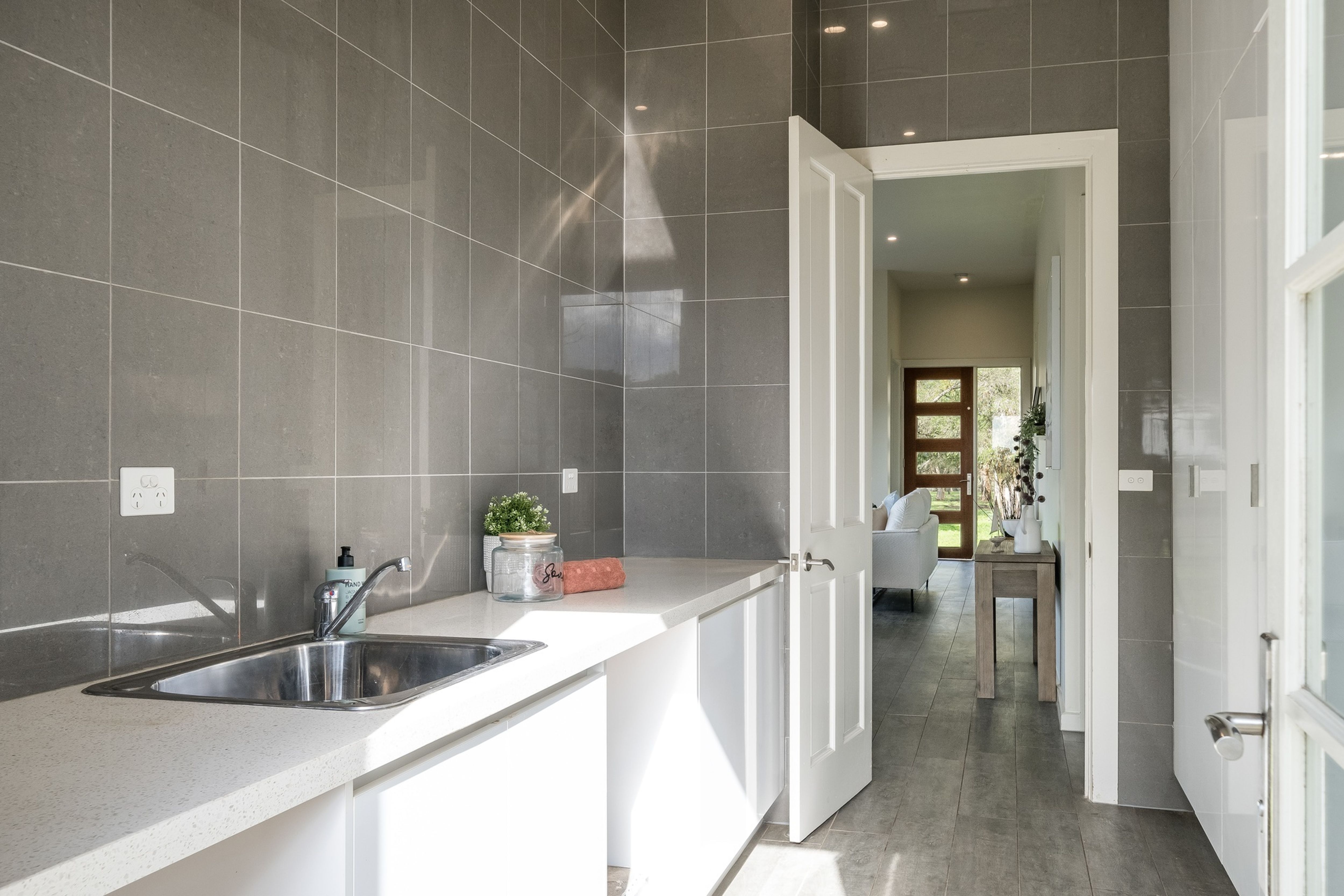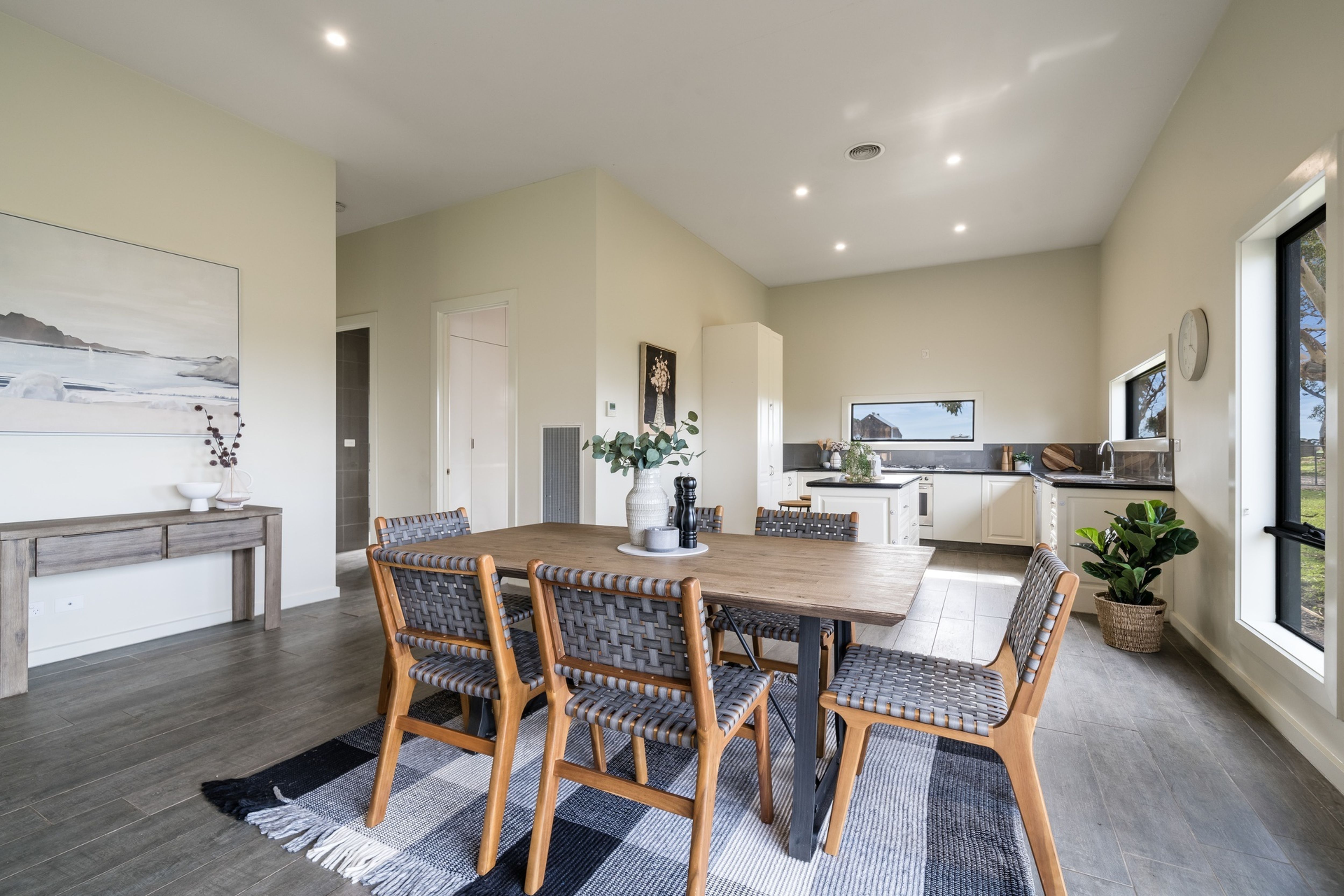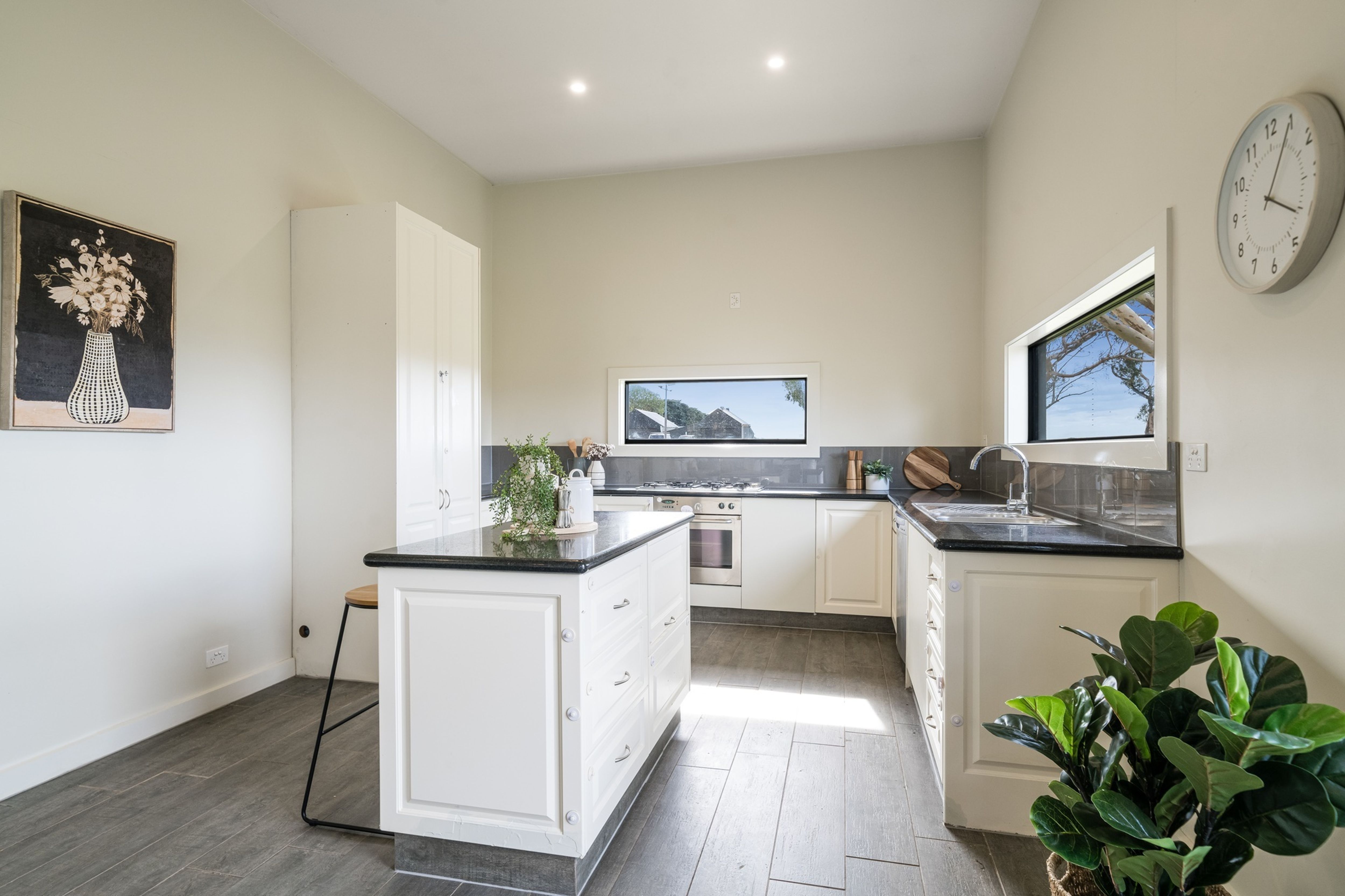 Comprising of three spacious bedrooms, open plan kitchen, dining and living (sliding door opens onto outside deck), family bathroom with freestanding bath and double basins, mudroom/laundry with floor to ceiling cupboards, powder room and double carport with storage room.