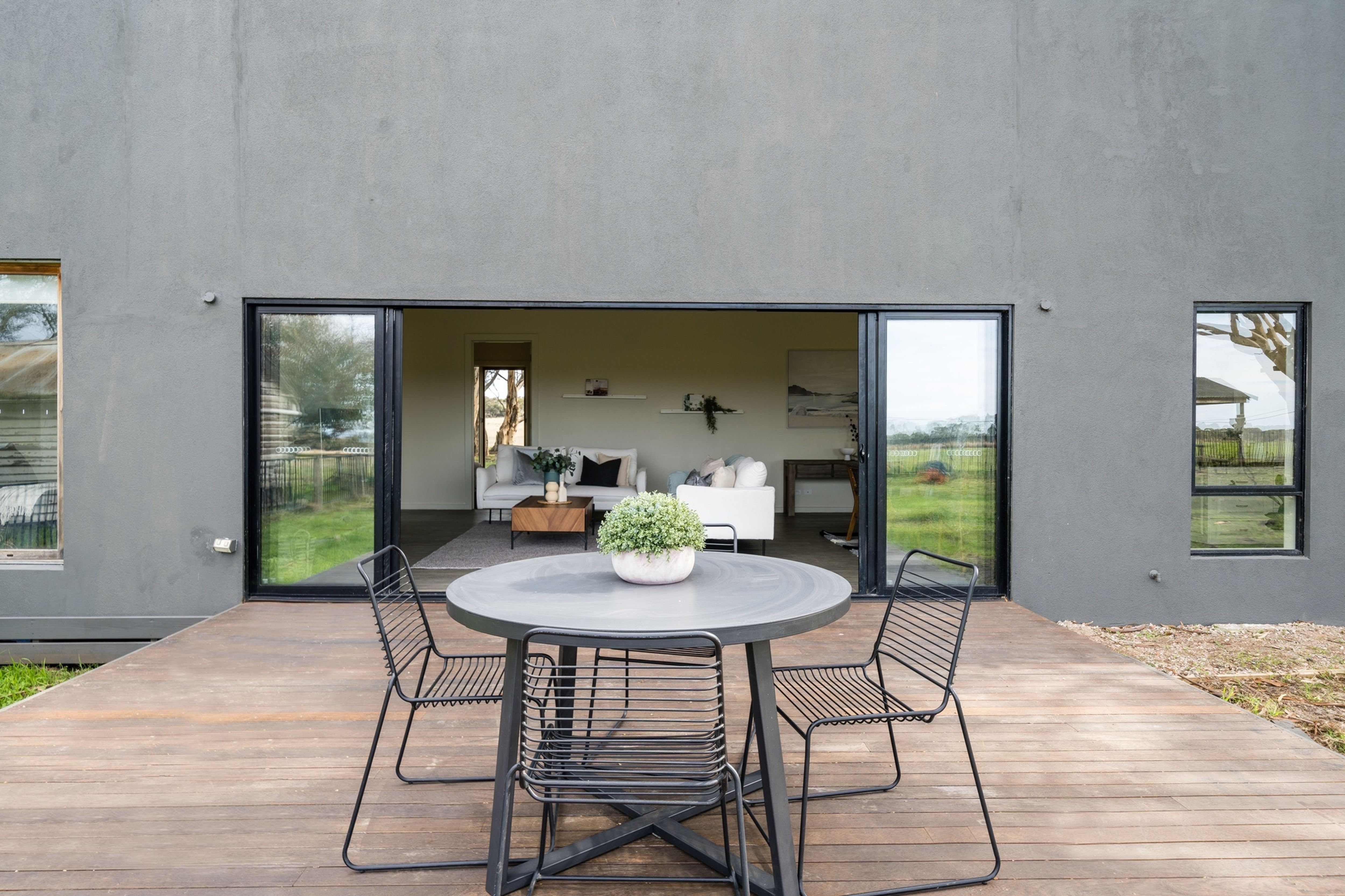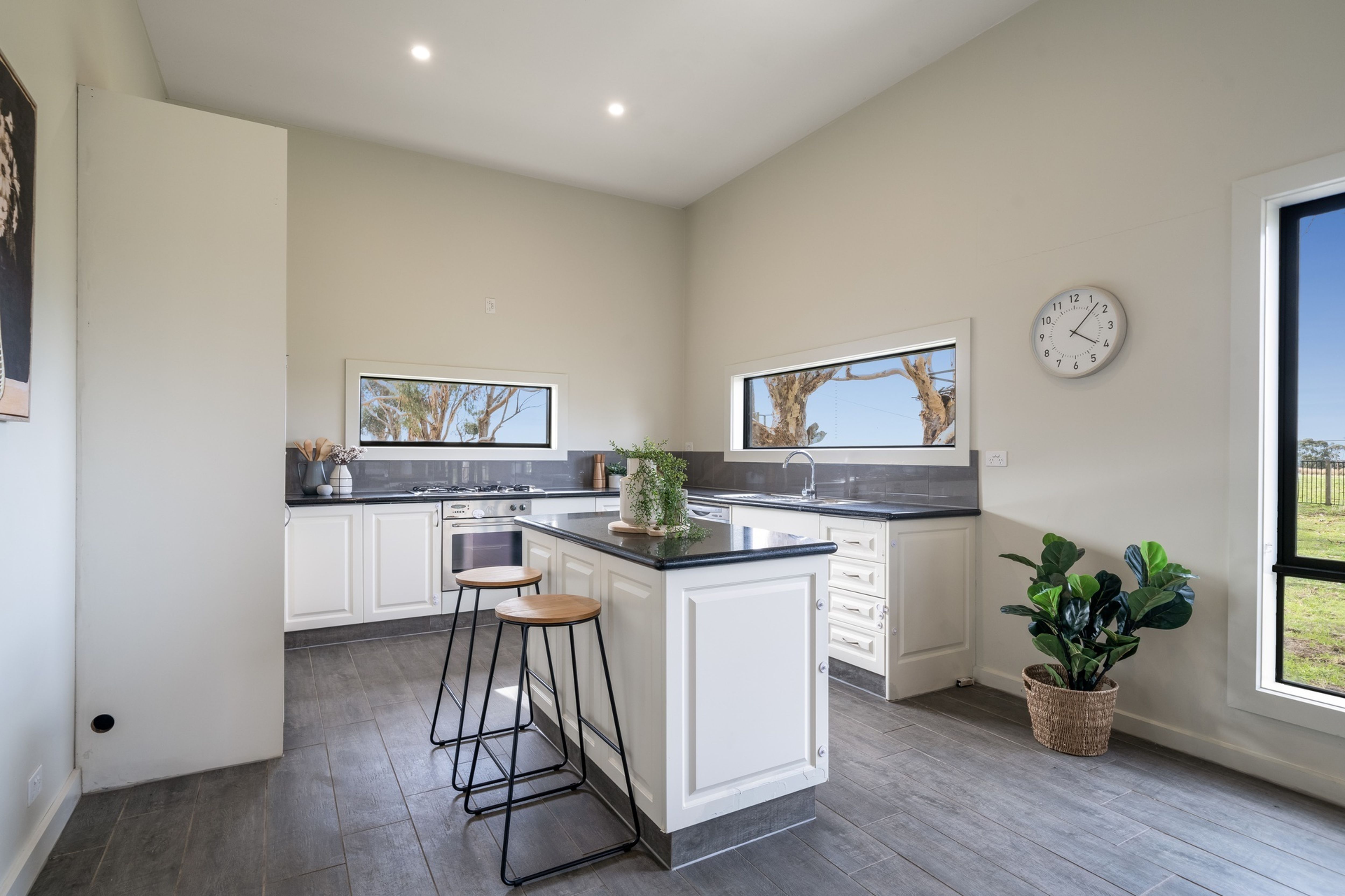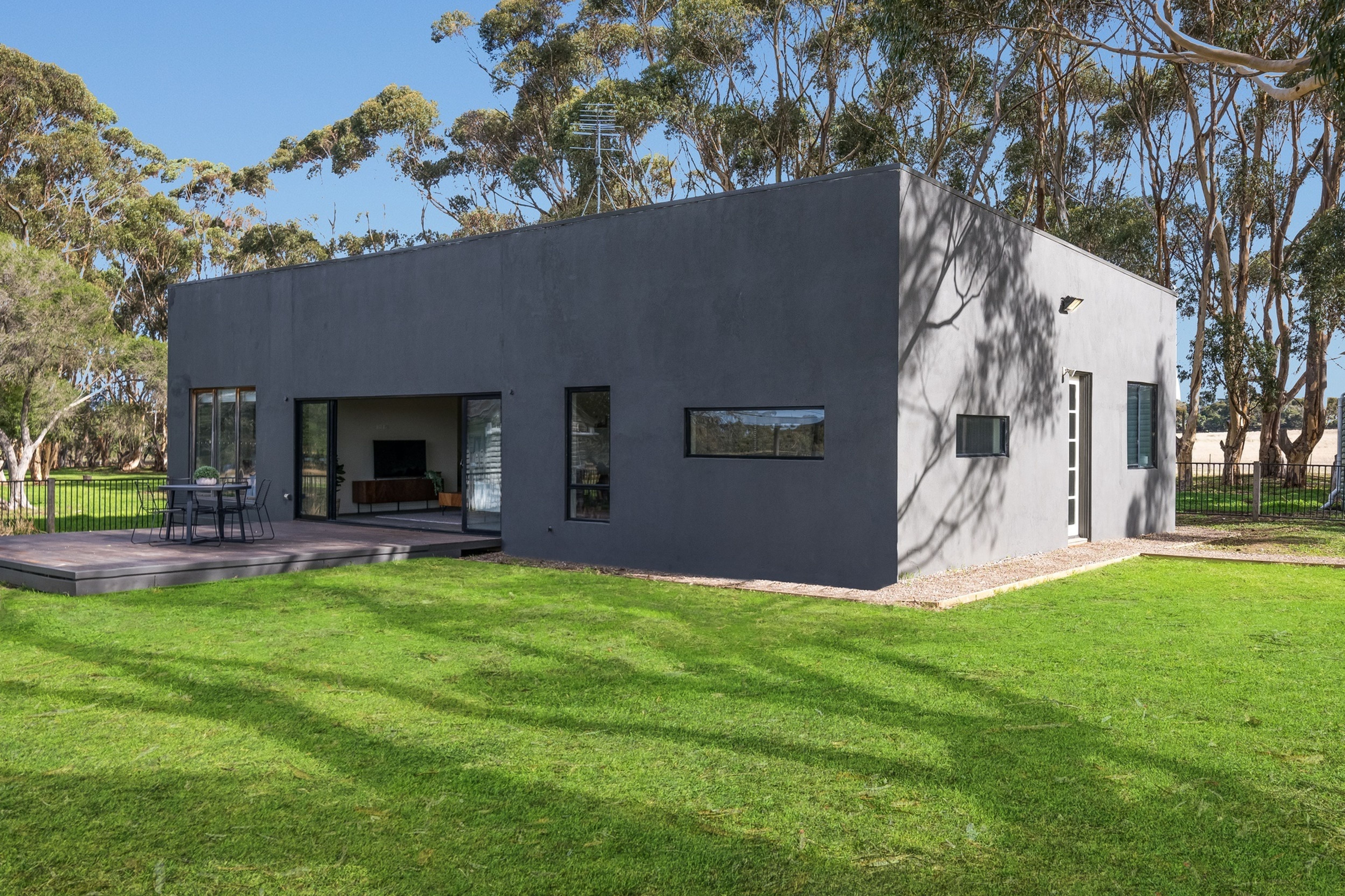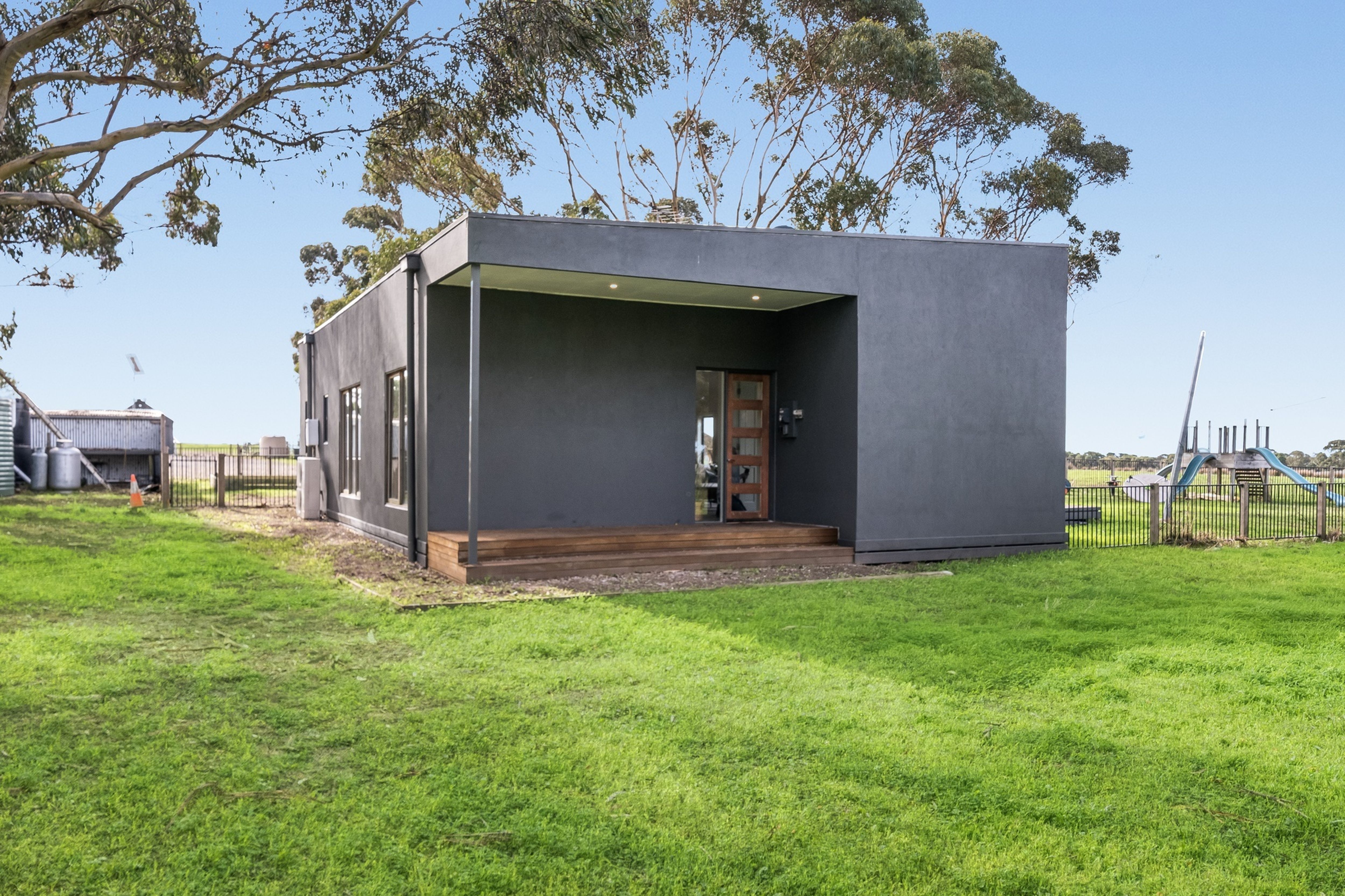 The property entrance is lined with mature gums leading to the original weatherboard homestead, now rendered on the outside and fitted with aluminium double-glazed windows, which has been modernised and renovated throughout.