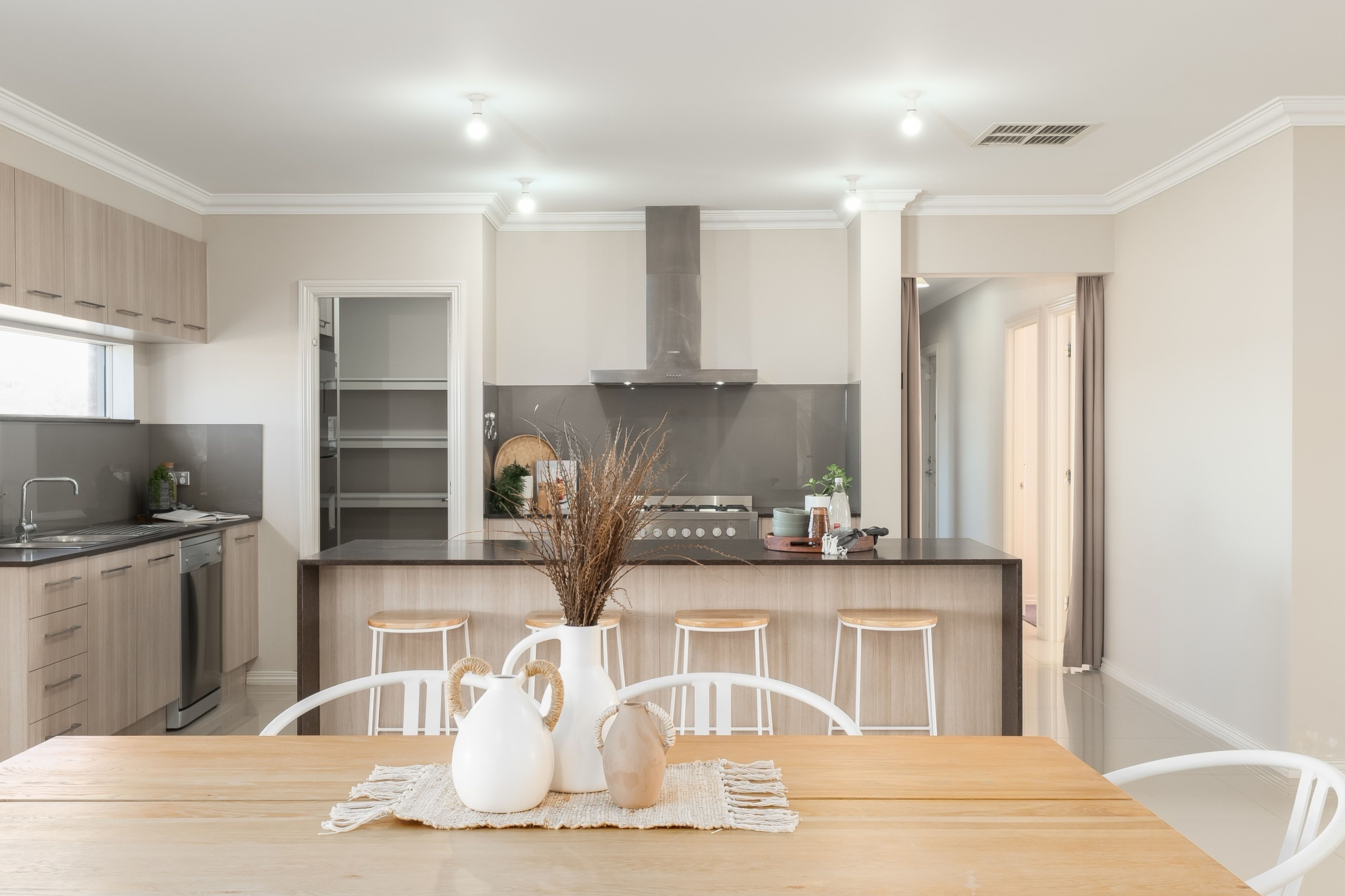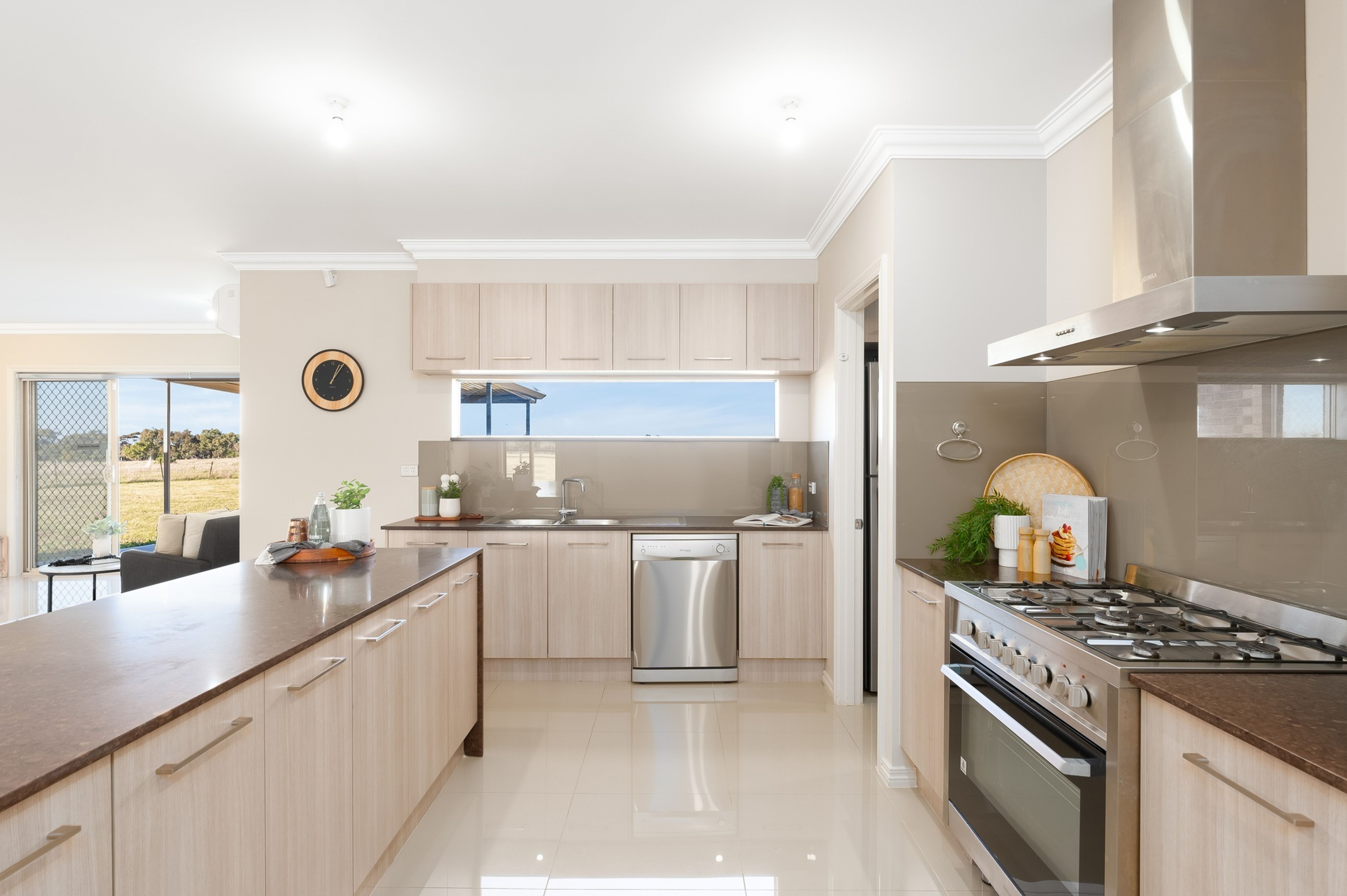 The contemporary kitchen features a large walk-in pantry, a fabulous country-style, freestanding cooker with canopy rangehood, dishwasher, stone benchtops and warm natural light streaming through the windows that perfectly frame the paddock views.