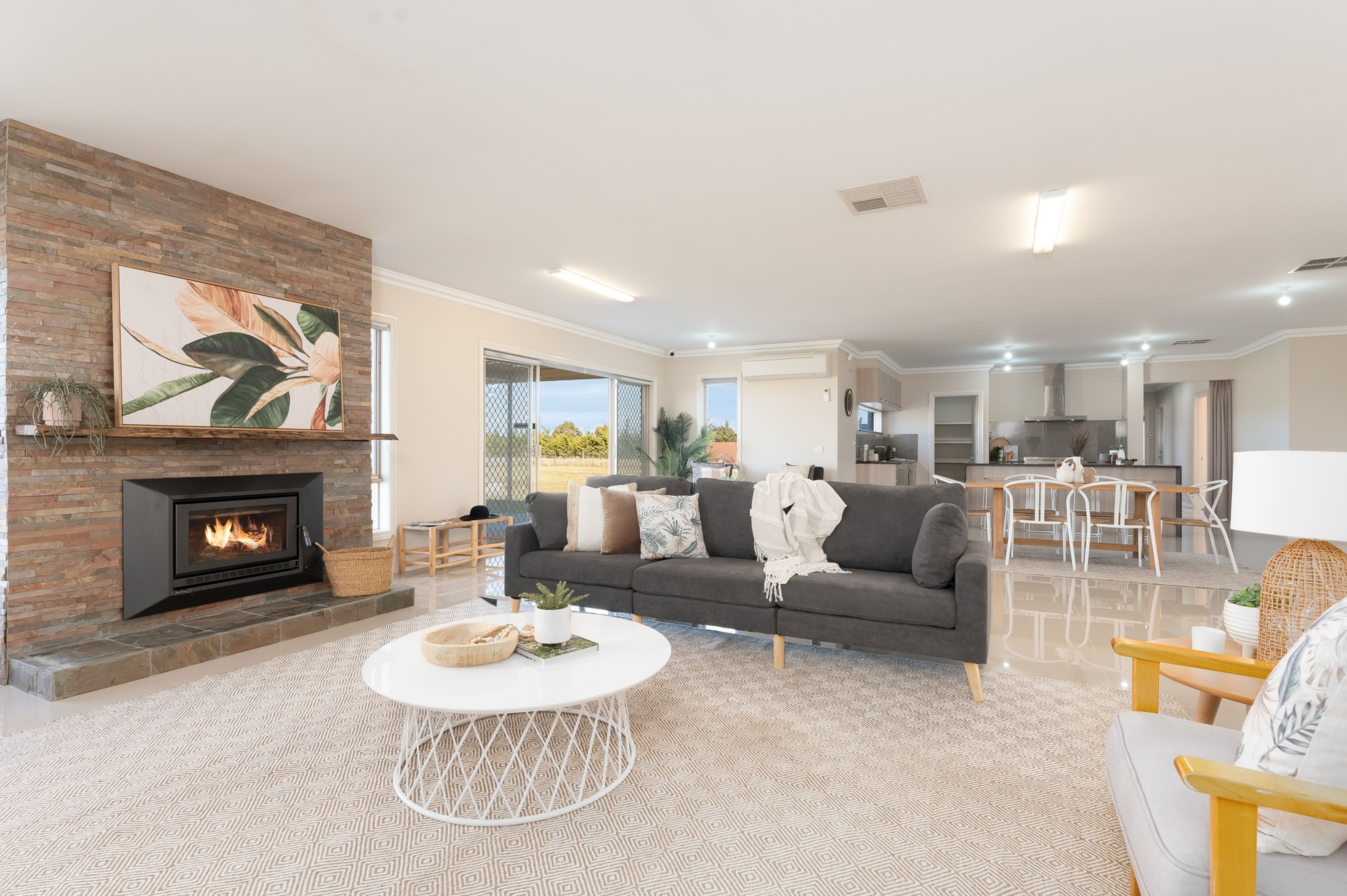 The kitchen overlooks an oversized open plan dining area and living space, boasting a stunning feature stone fireplace with Heat Charm wood fire, which leads to an undercover alfresco area to enjoy the outdoors - whatever the weather! There is also a separate lounge which can be used as a rumpus room for the kids, theatre or games room.