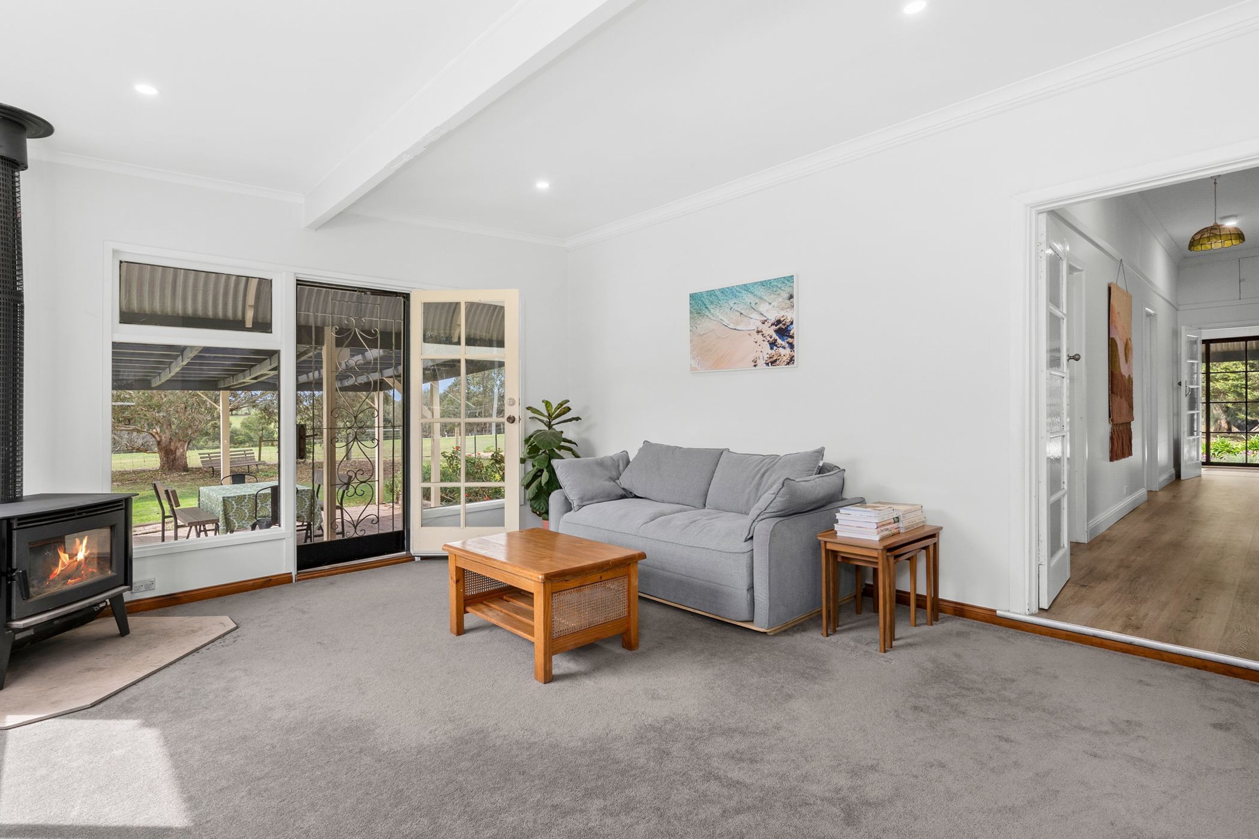 The large living room features a Coonara wood heater, split system and a separate study area, and opens onto a full length verandah to enjoy the views of the property.