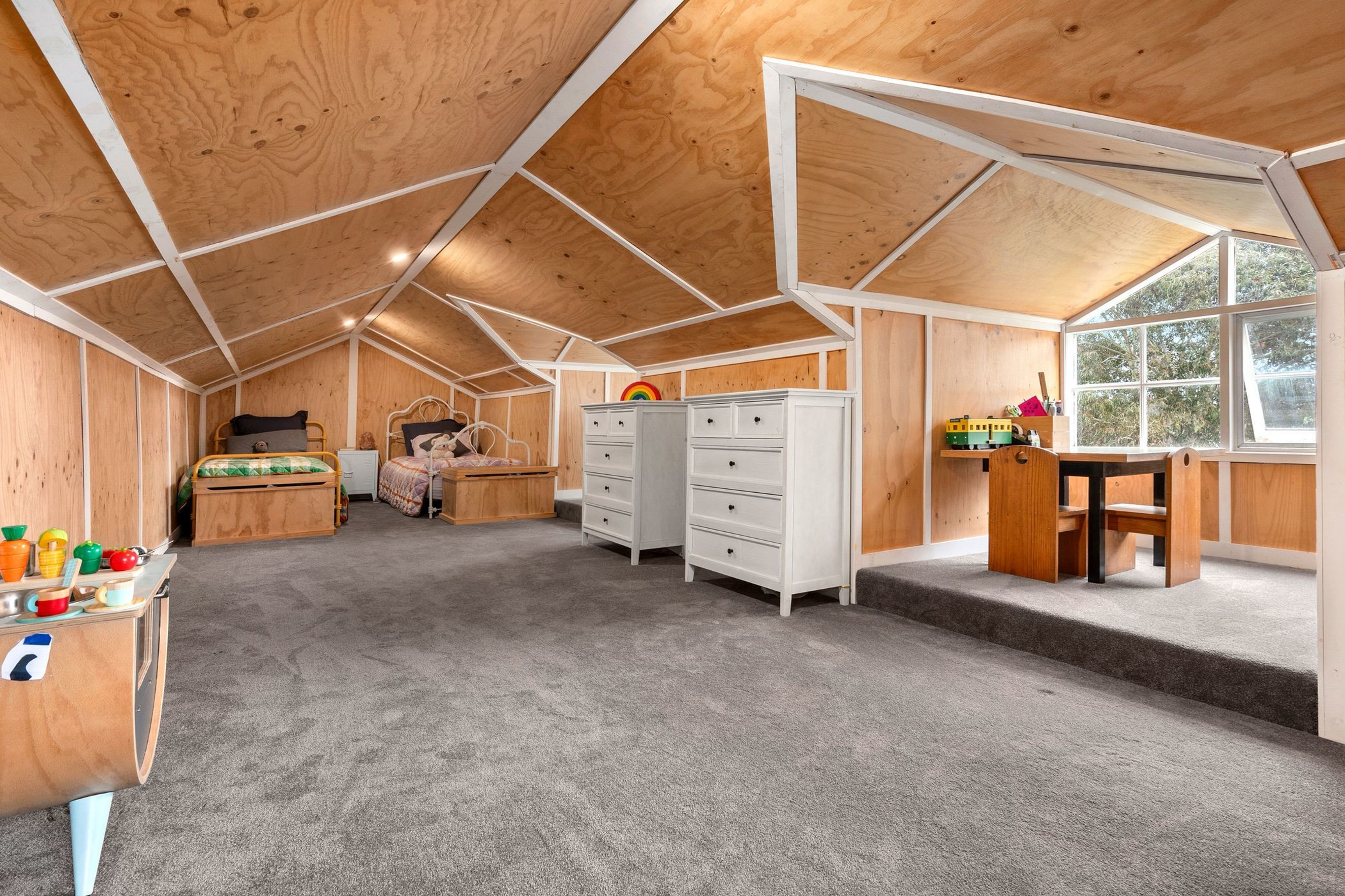 The home features two spacious bedrooms with robes, upstairs 3rd bedroom/multi-purpose attic, a family bathroom, generous laundry, mud room/entry and a modern white kitchen adjacent to a large meals area.