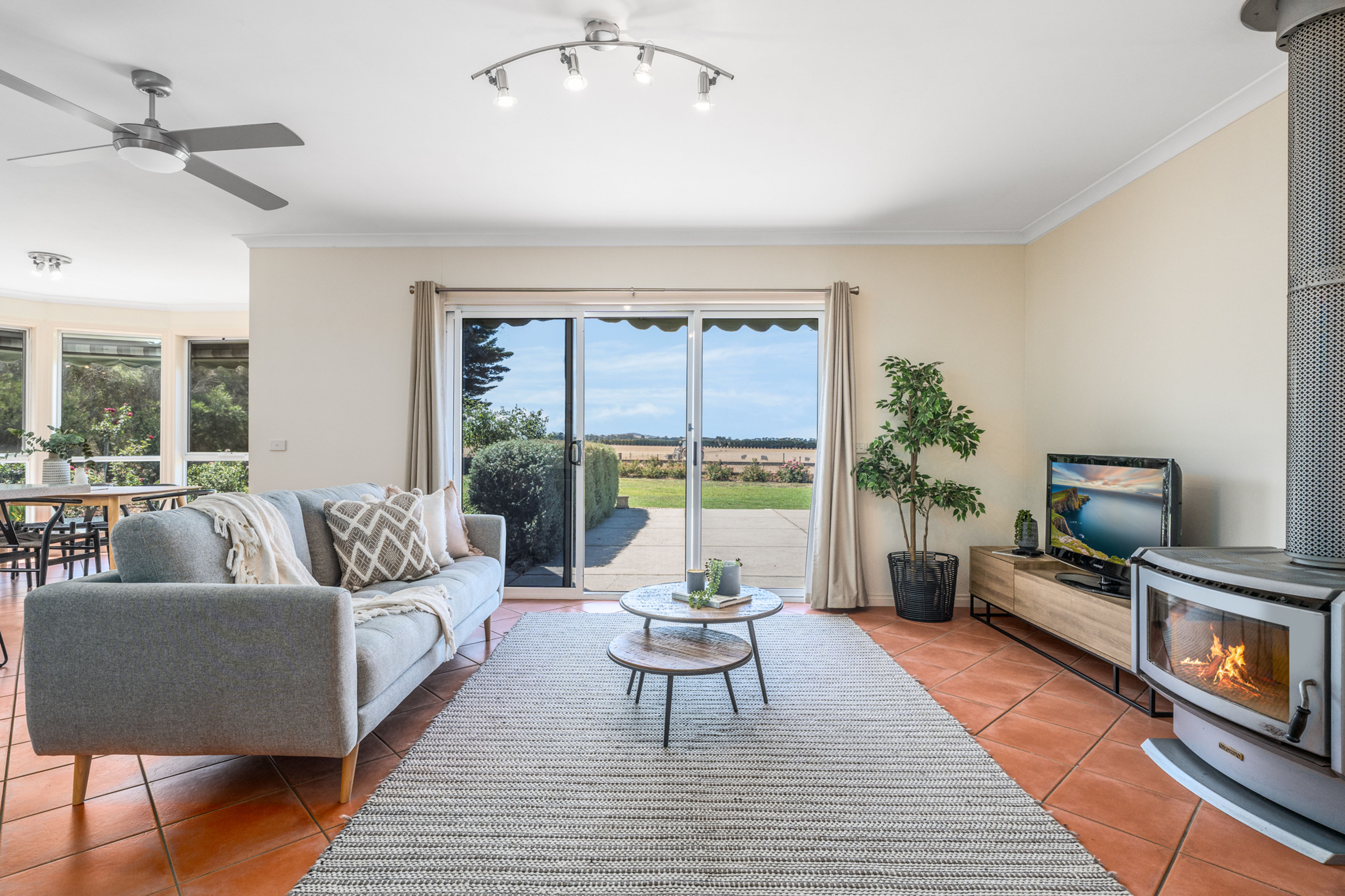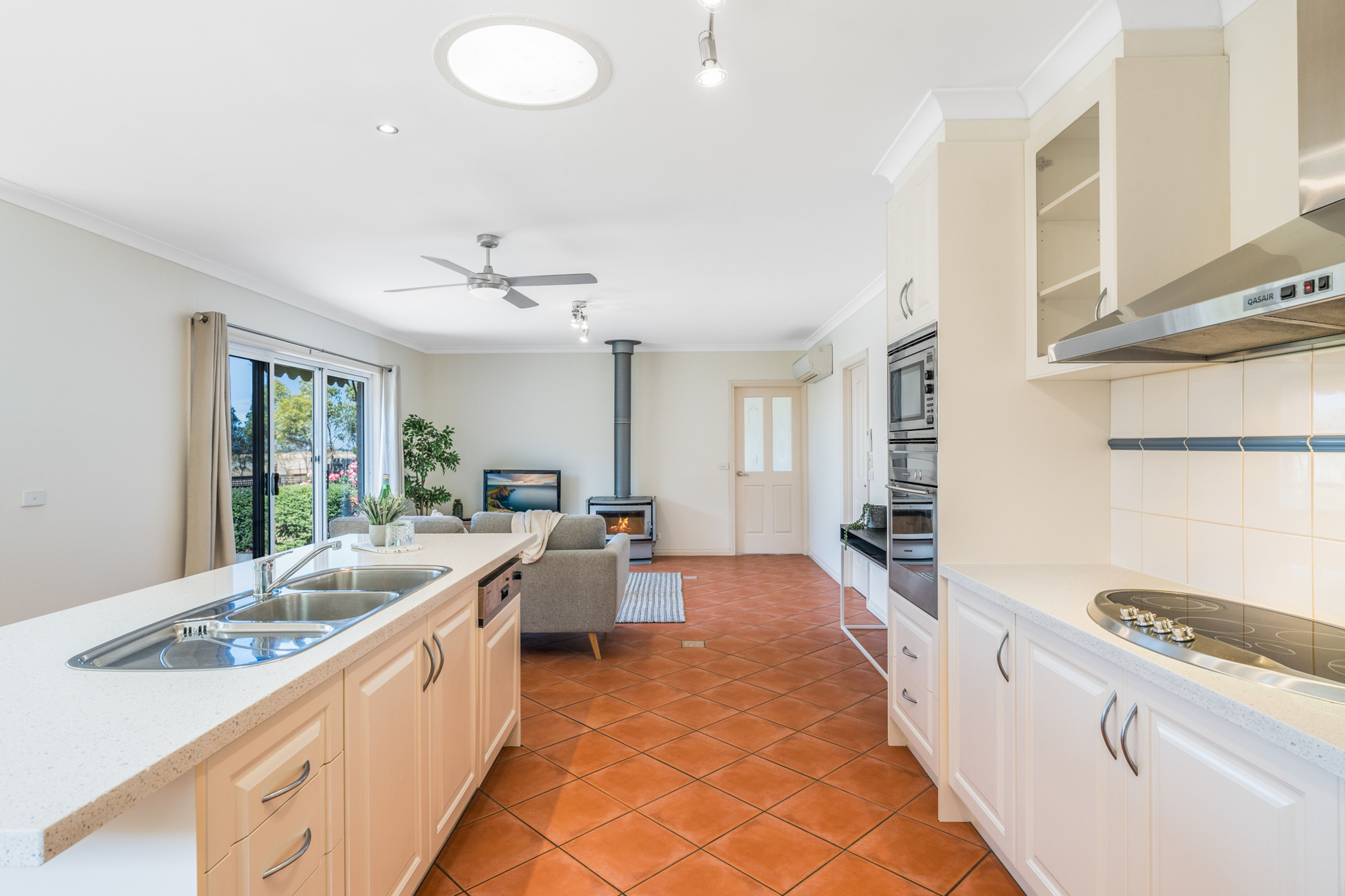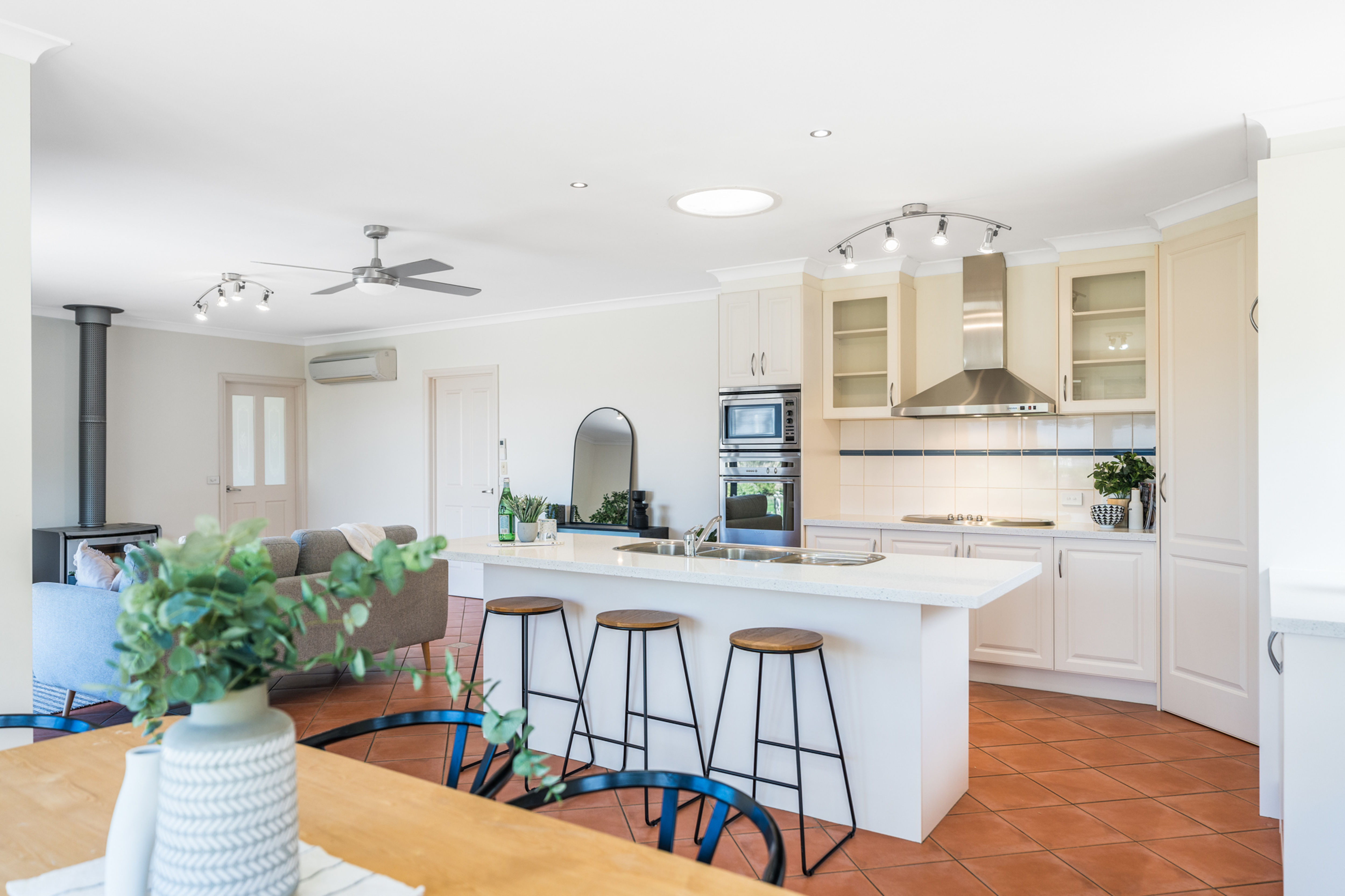 The kitchen & dining area enjoys great natural light and features a modern, open plan design which overlooks the farm through the large windows. Sliding doors lead out to the paved al-fresco area whilst a wood fire and split system keep this area cool in summer and warm in winter. The kitchen is well-appointed, featuring all electric appliances including a Neff oven, Miele dishwasher, built-in Miele microwave plus a large pantry and island bench.