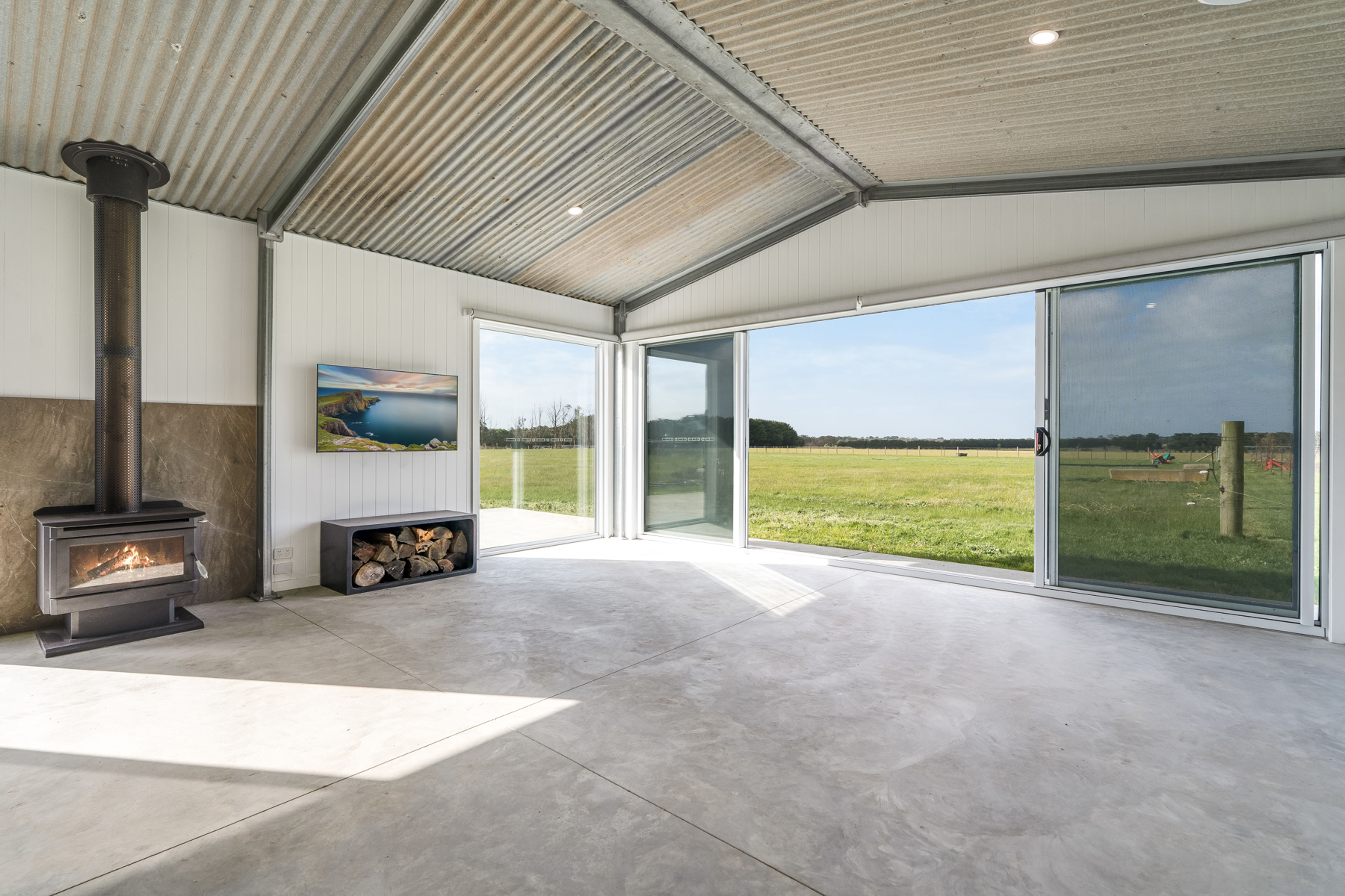 Featuring an established, tree lined entrance with automatic solar gate, the property opens up with expansive views over the surrounding paddocks and a feeling of peace & rural tranquillity. Brimming with features that make it an exceptionally rare find, the property is ready for a new chapter with a fully approved planning permit to build plus quality shedding already in place, including a spacious 15m x 9m shed/commercial garage, internally divided into a garage and/or workshop area, washroom with toilet, living area and solar storage room.