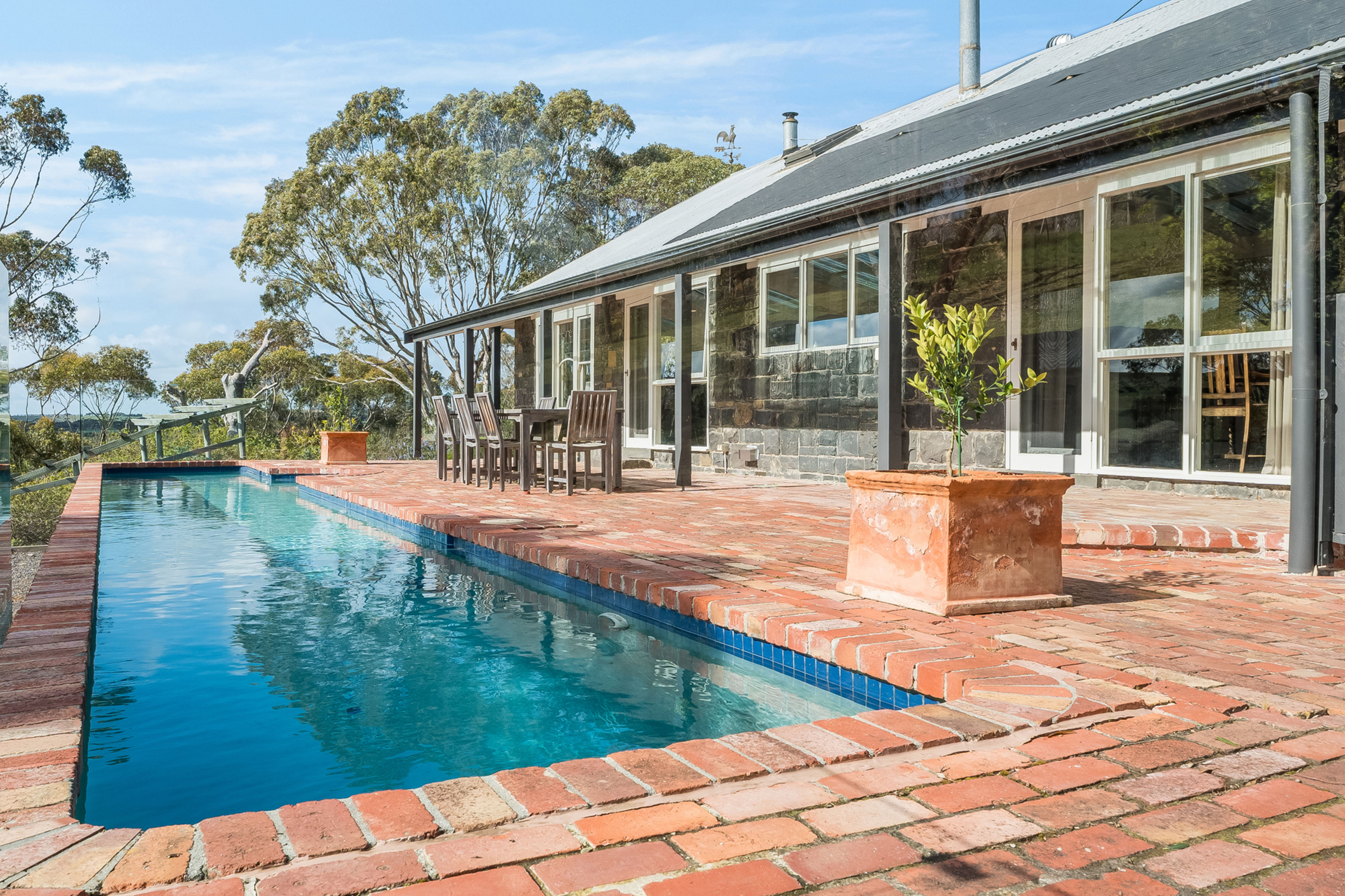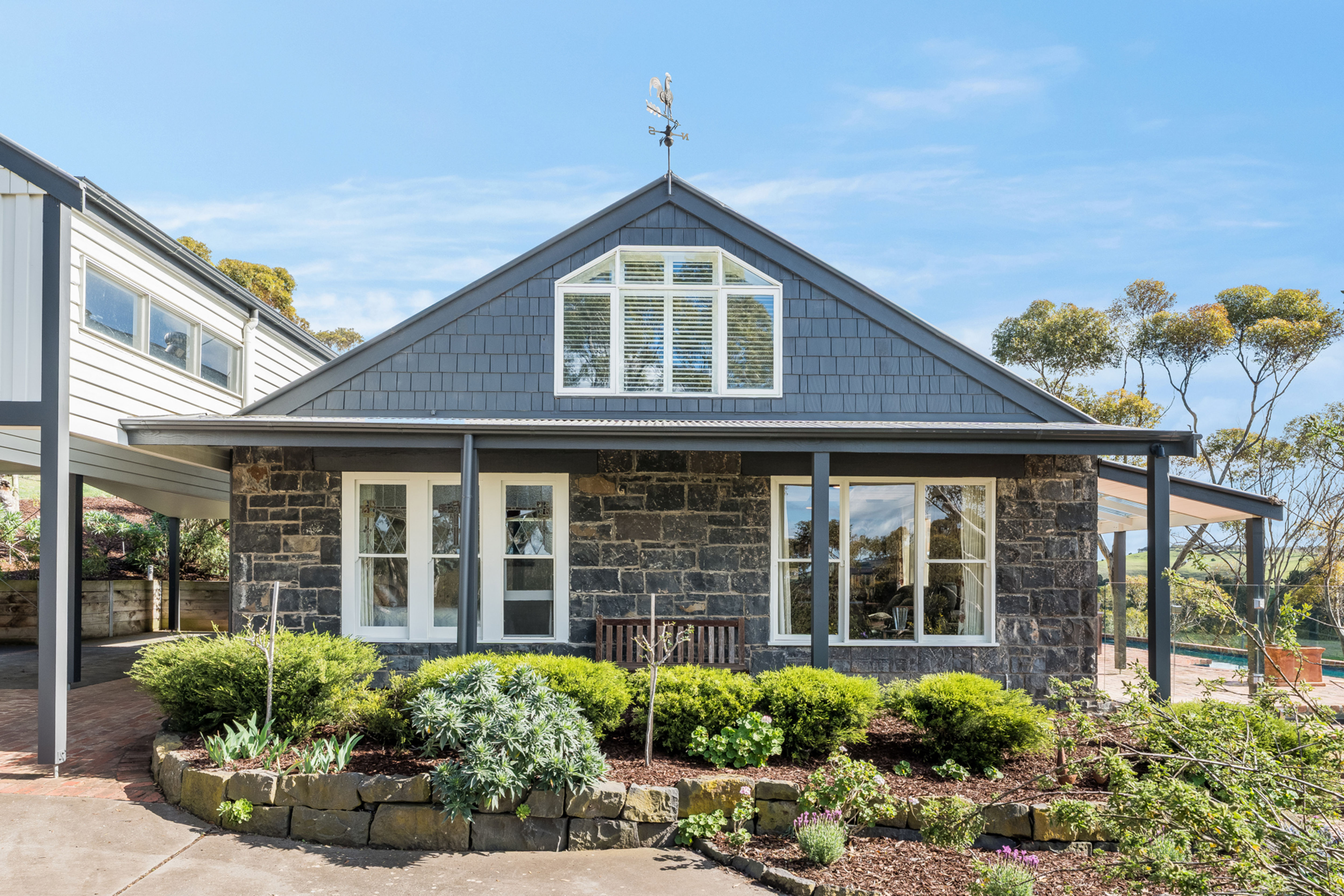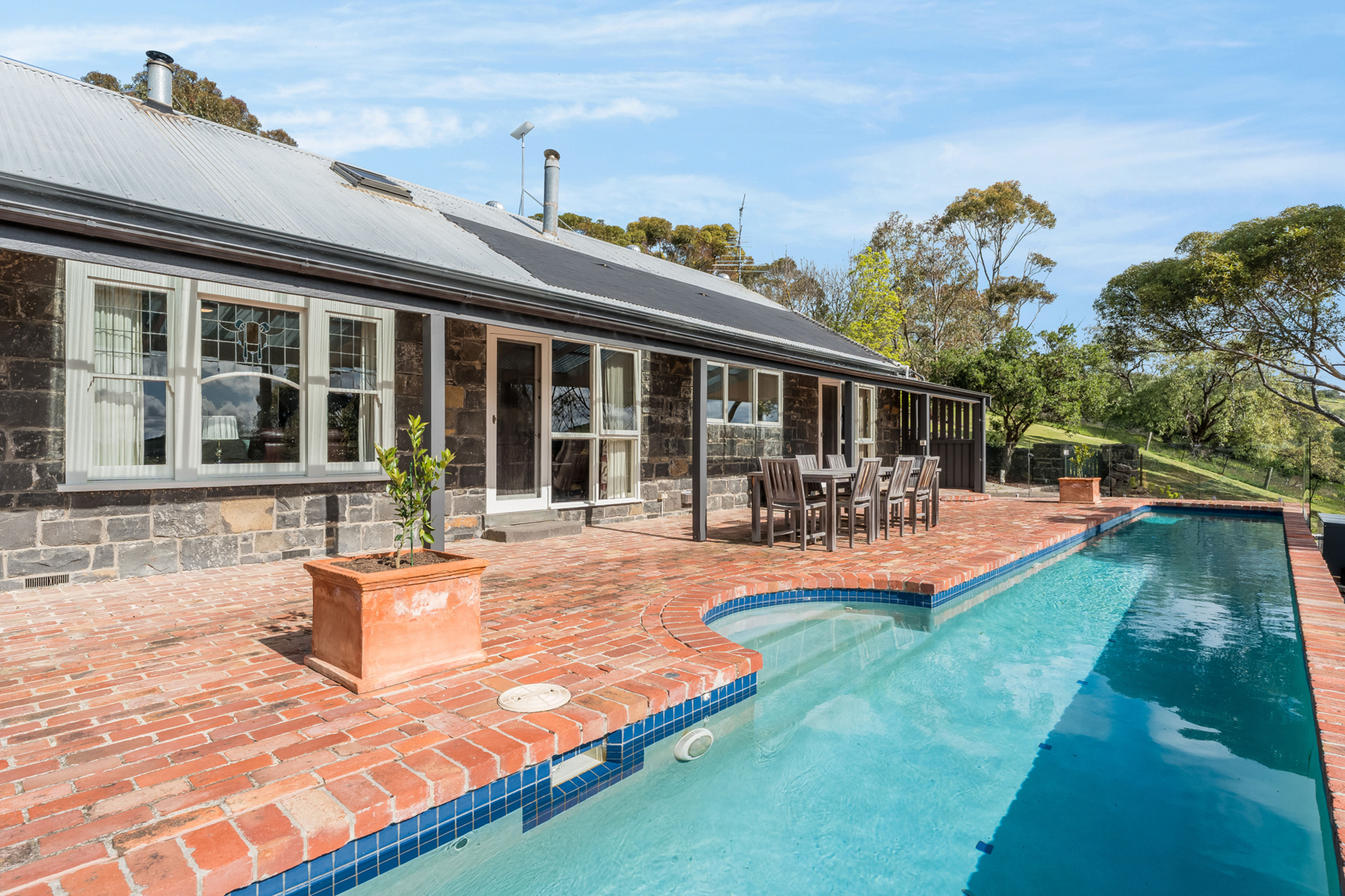 Set on approximately 4.4 acres of beautifully landscaped grounds, this timeless bluestone residence offers the perfect blend of rural charm, lifestyle luxury and modern convenience. Located off scenic Russells Bridge Road, the home is approached via a magnificent tree-lined driveway and enjoys sweeping views across the Moorabool Valley, positioned perfectly to soak up the northern sun.
