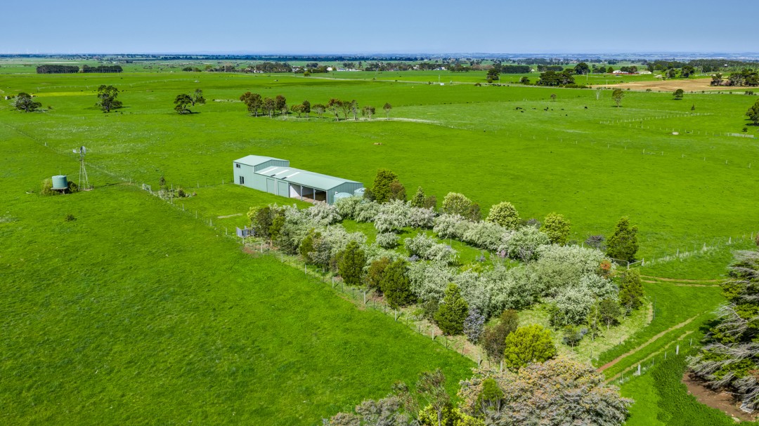 Infrastructure includes a high-quality 32m x 9m shed, part open-fronted for hay or machinery storage, with the remainder fully enclosed (2 roller doors), featuring a concrete floor and mezzanine area, ideal for a workshop or future development.