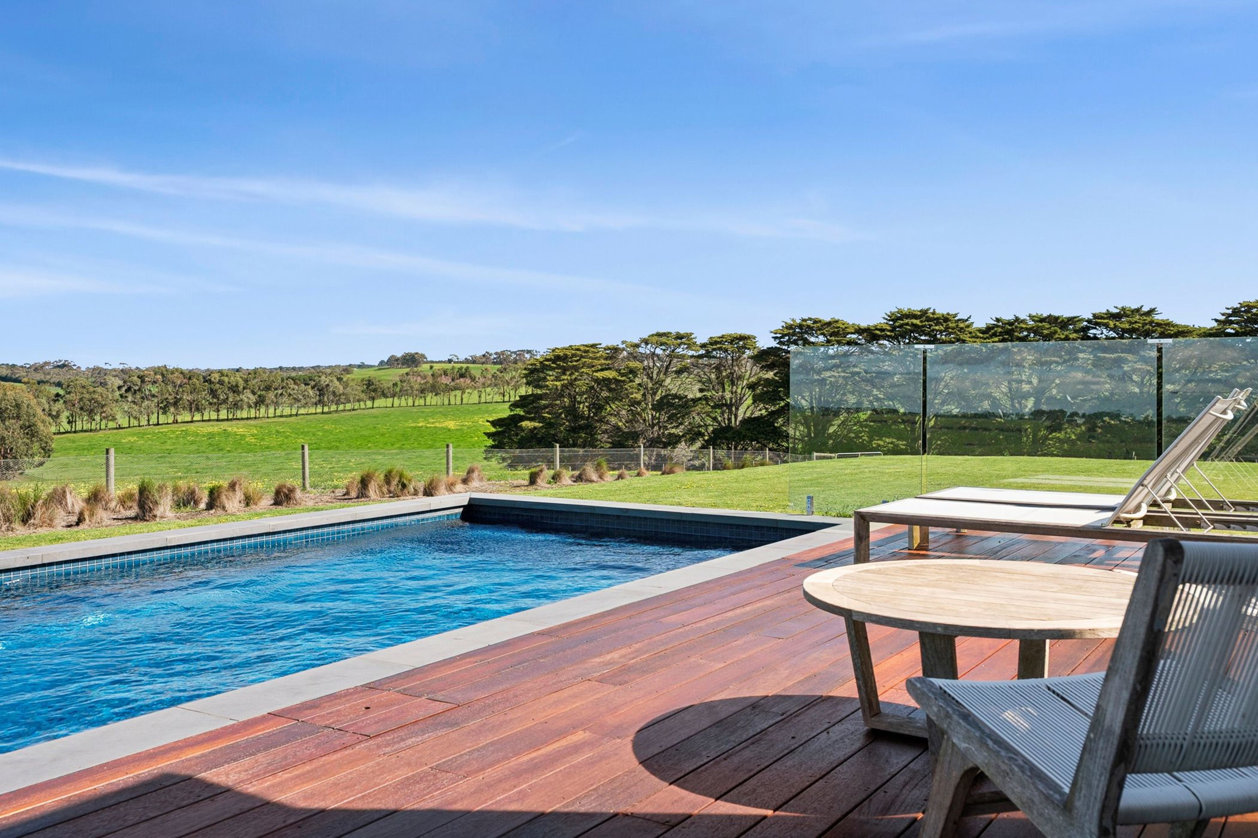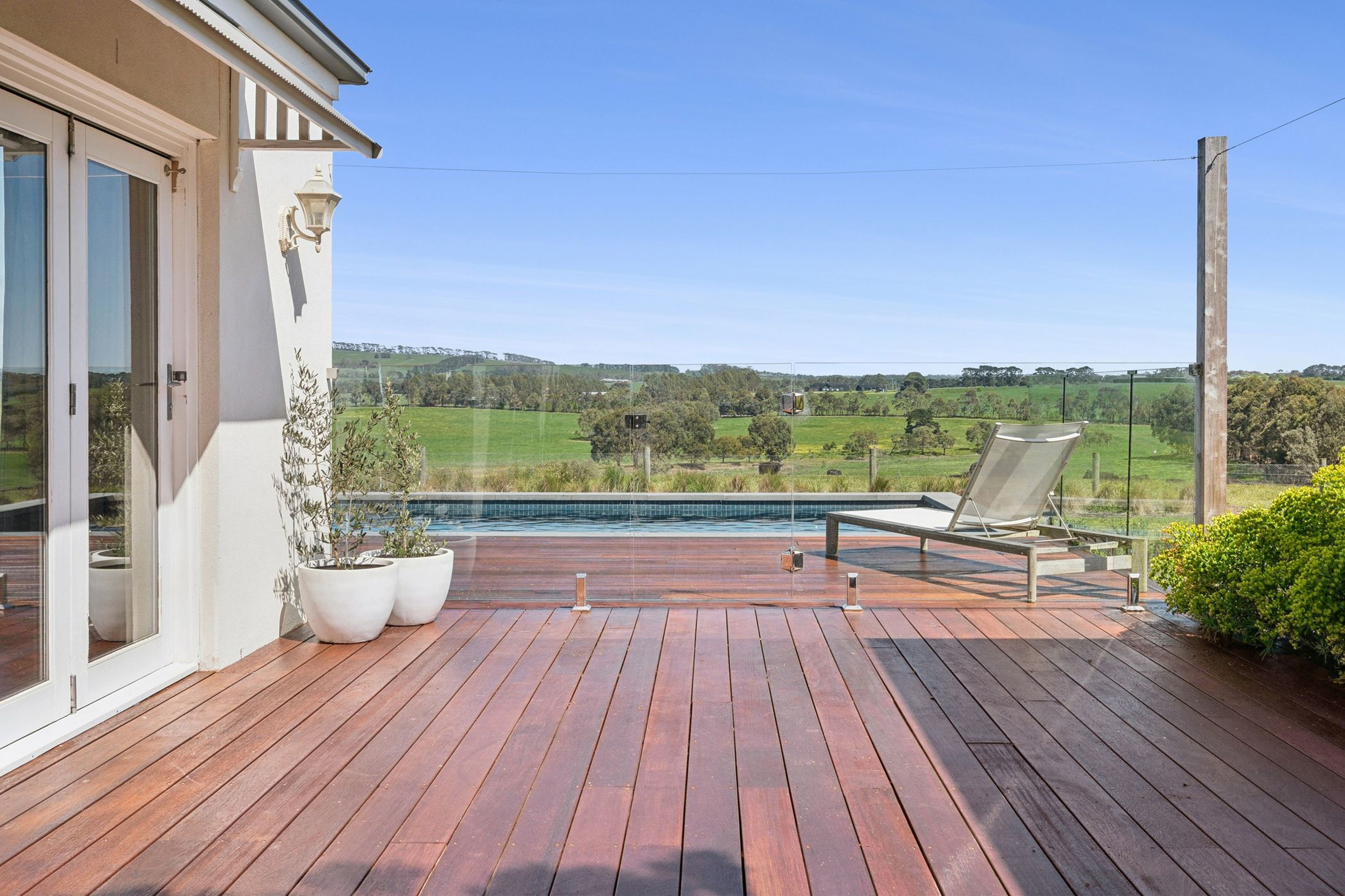Carefully designed and positioned to showcase the incredible views, picture windows frame the lush outlook over the luxurious pool, paddocks and Mount Moriac in the distance. The heart of the home is the open plan kitchen, meals and lounge area which enjoys a wood fire for cosy winter nights, r/cycle heating & cooling, ducted evap cooling, and a seamless connection onto the sprawling deck and entertaining area around the pool. The bespoke kitchen features concrete benchtops, walk-in-pantry, separate coffee/meal prep area, 900mm Falcon pyrolytic oven & gas stovetop, Miele dishwasher and extensive storage.