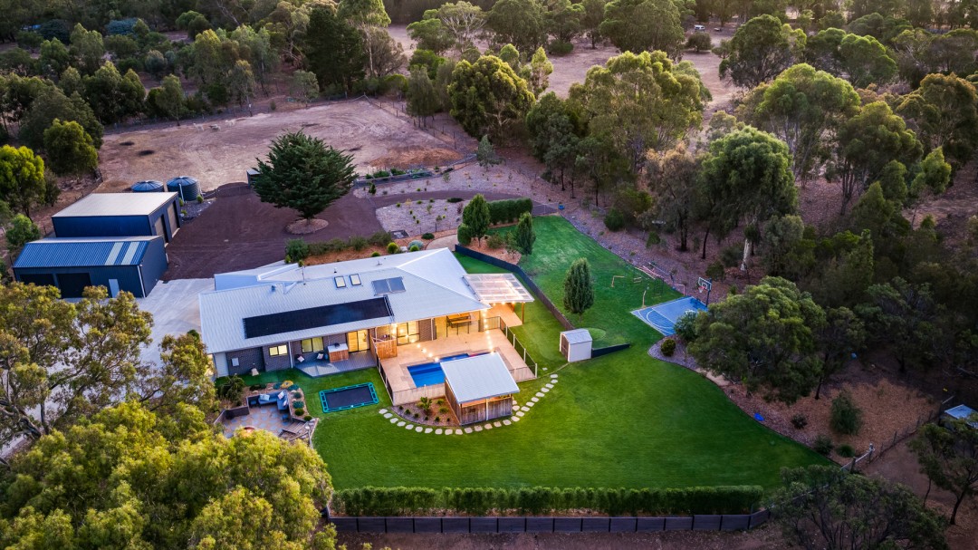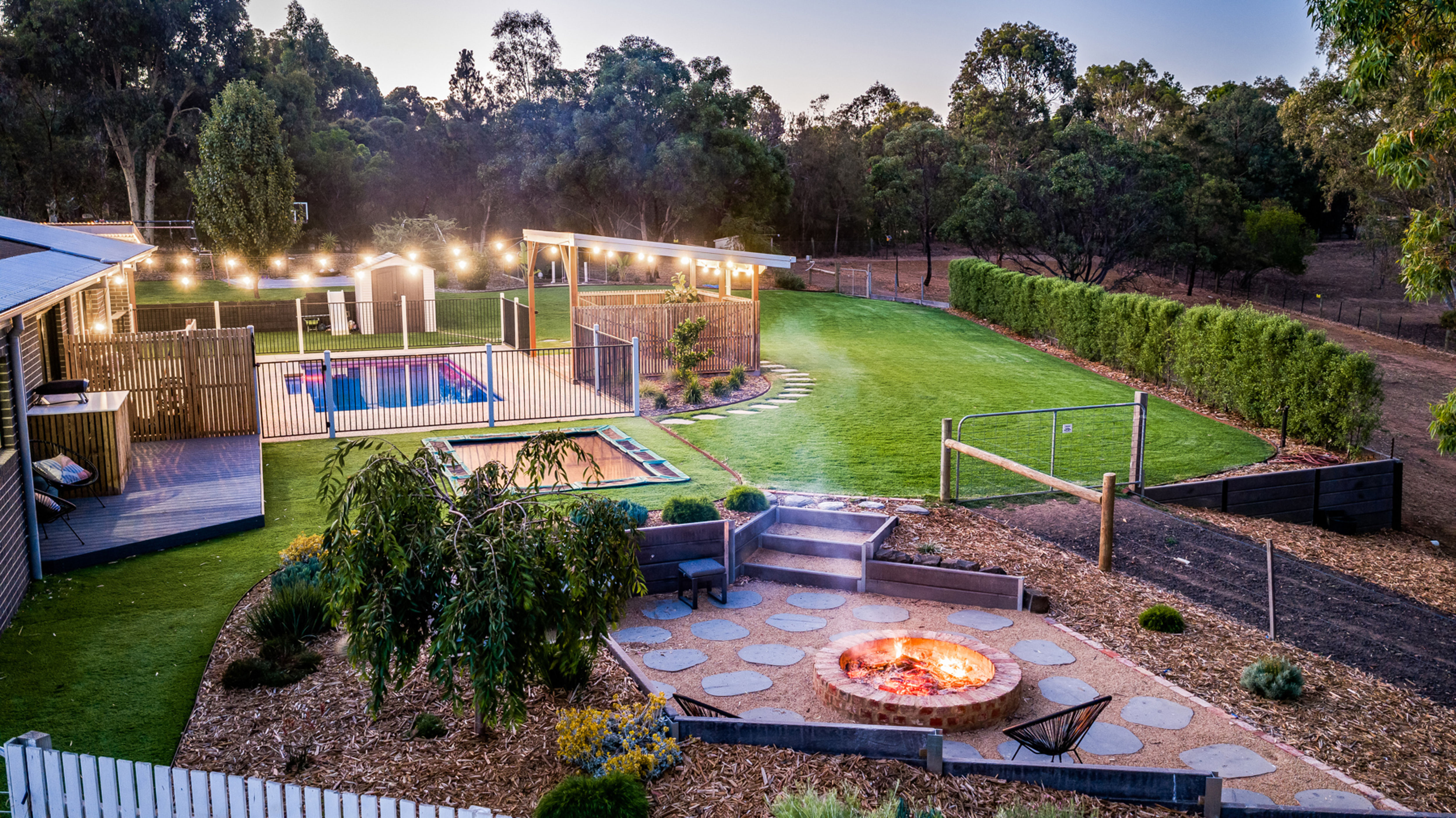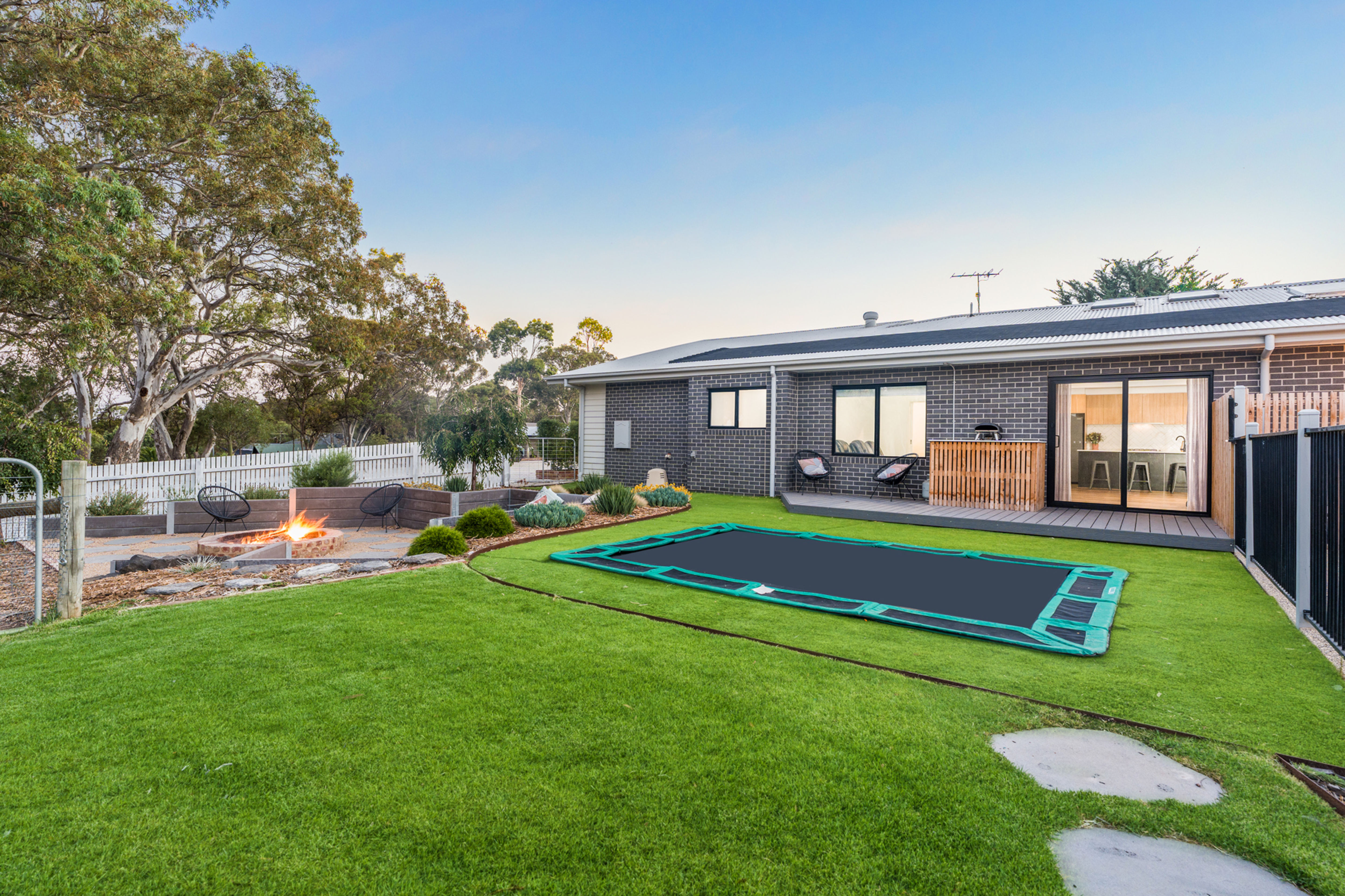 Outdoors: 8m Narellan in-ground solar heated pool with feature bluestone tiling and surrounding aggregate, fully fenced, large pergola for relaxing afternoons, in-ground trampoline, sunken fire pit area for cozy winter nights, immaculate natural grass areas for the kids to play, established veggie boxes and native plantings throughout