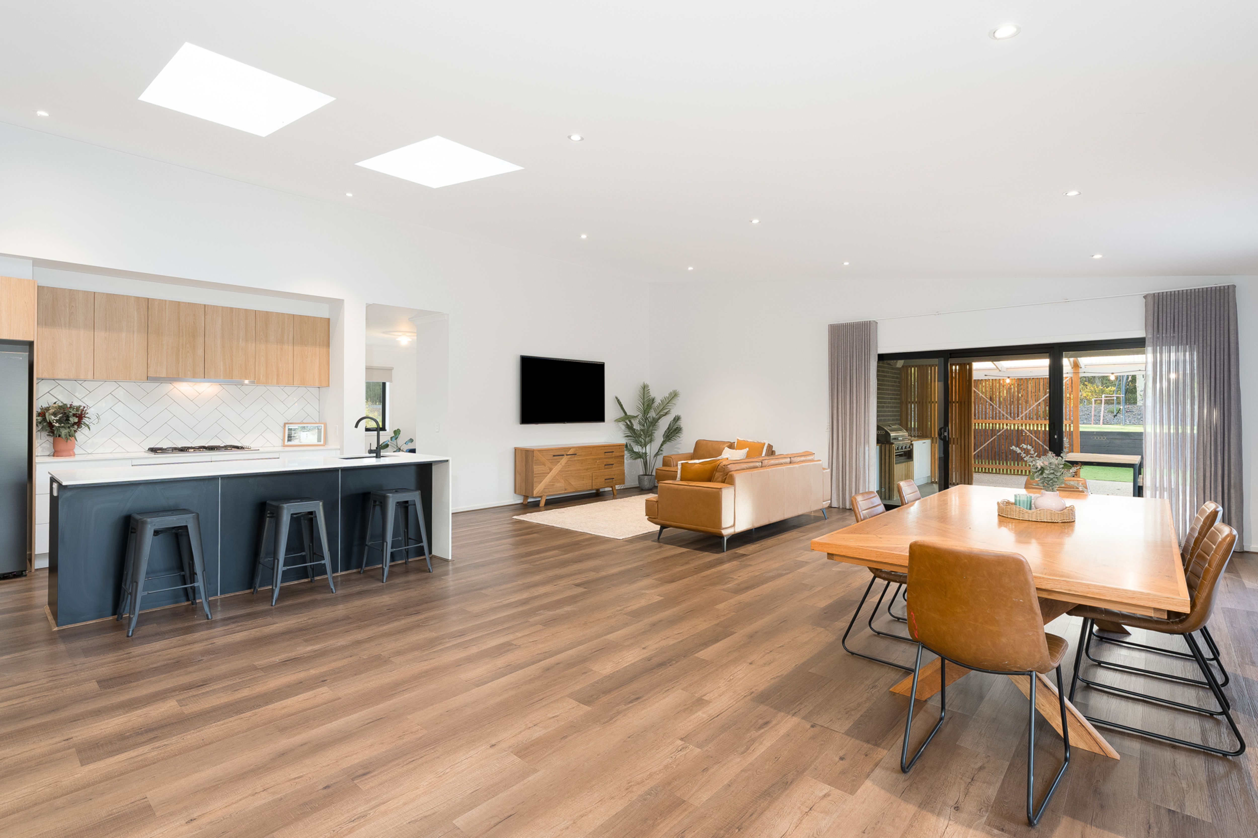 Open Plan Living / Dining: An immense entertaining space, skylights bring in lovely natural light, views over the pool and connects through to the undercover BBQ area