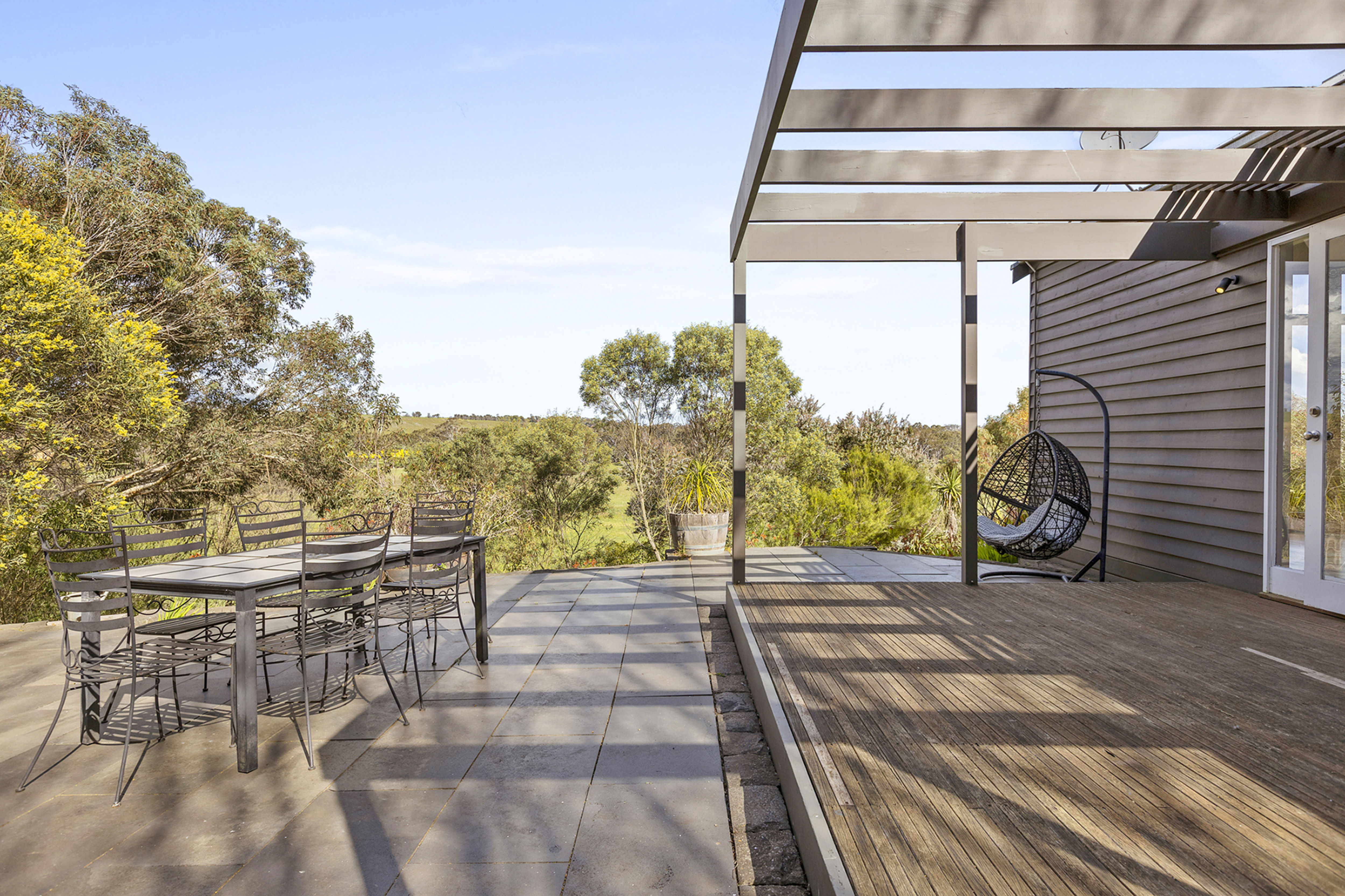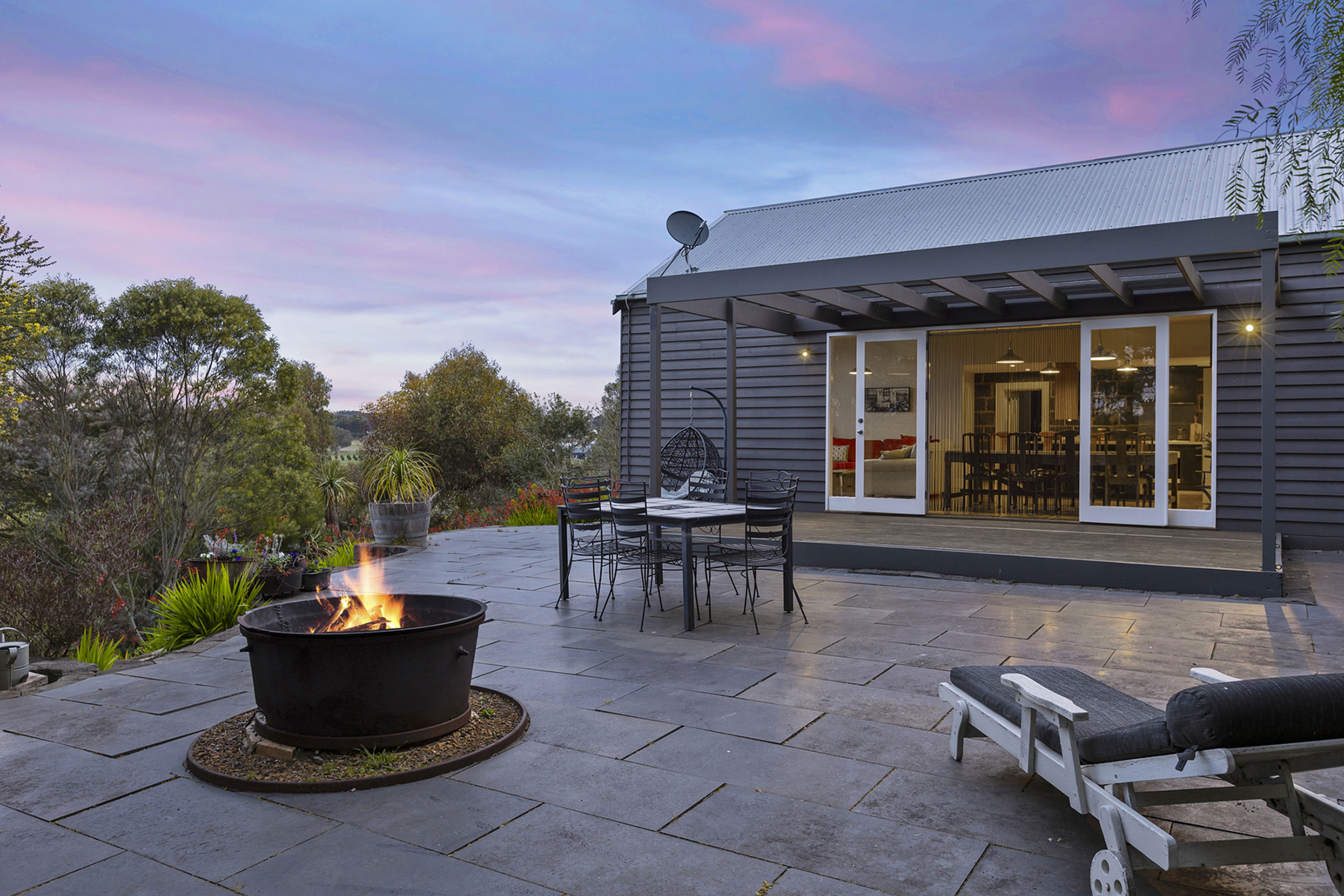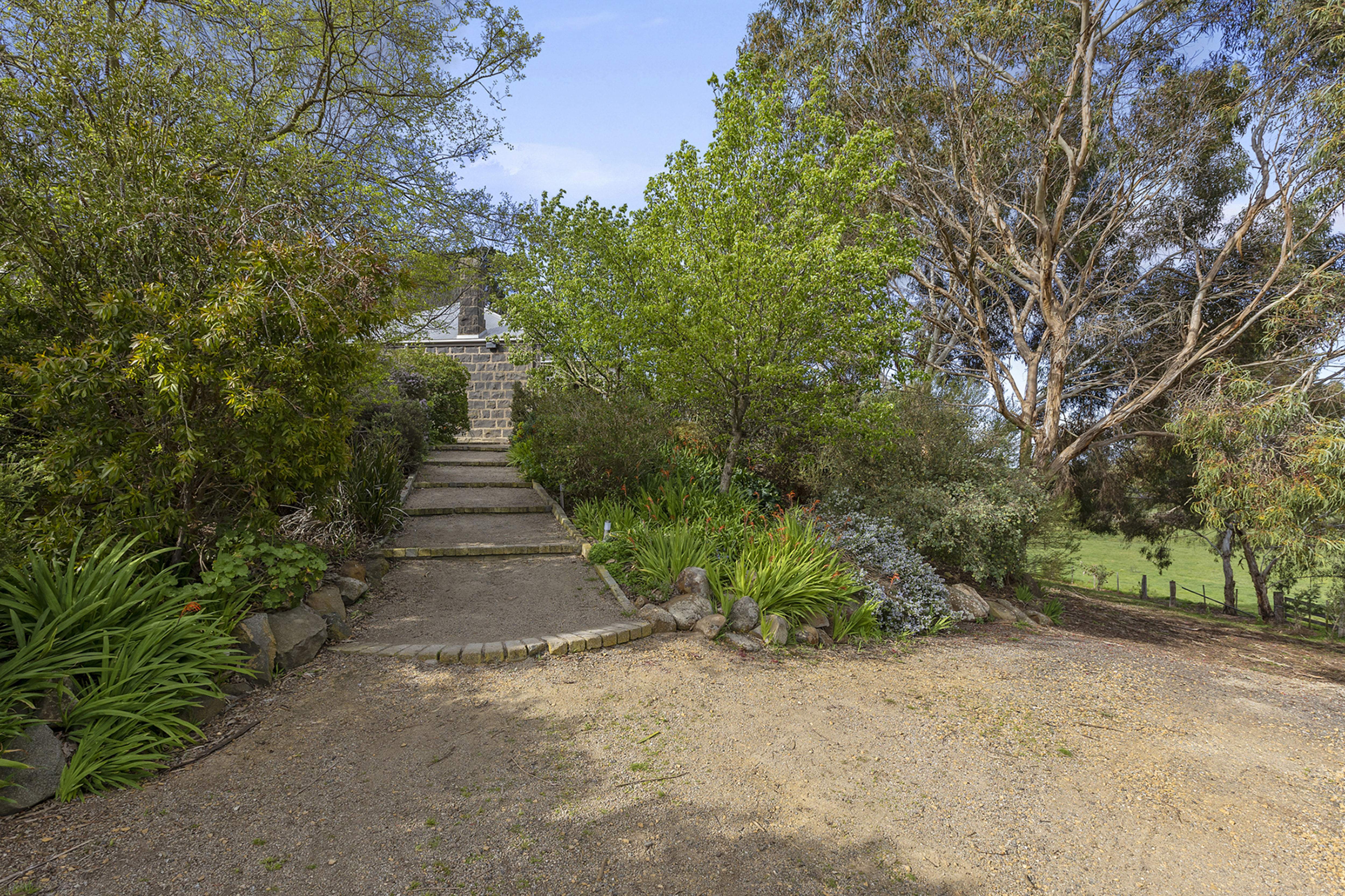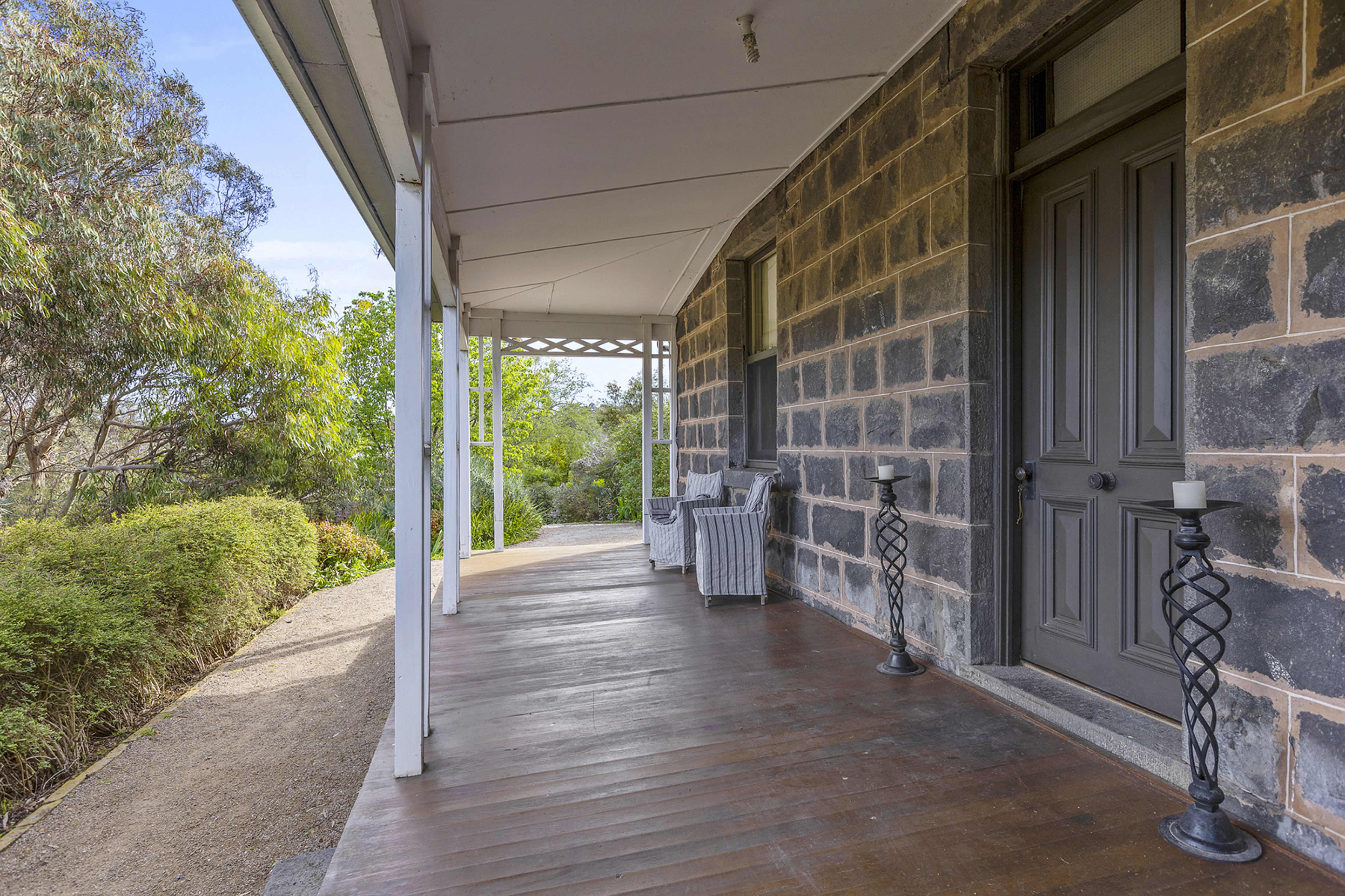 Nestled amongst established botanical gardens and sitting in an elevated position, the bluestone residence enjoys expansive views and a curated blend of modern living and country elegance.