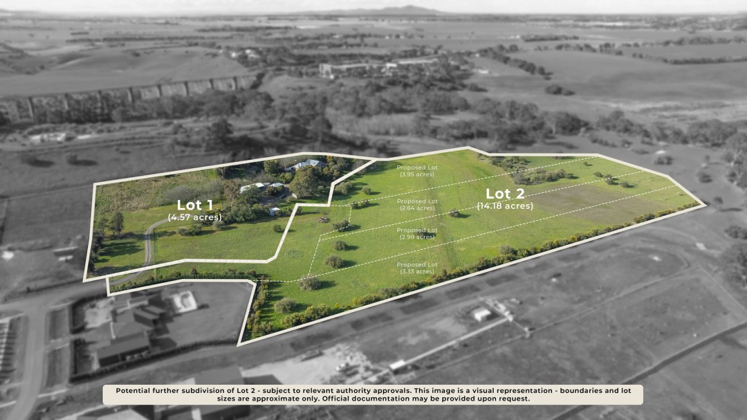 The property currently sits on one title with a planning permit currently in place for a further subdivision into 4 residential lots (STCA), presenting a boutique land development opportunity which effortlessly blends the best of country living with city convenience in close proximity.