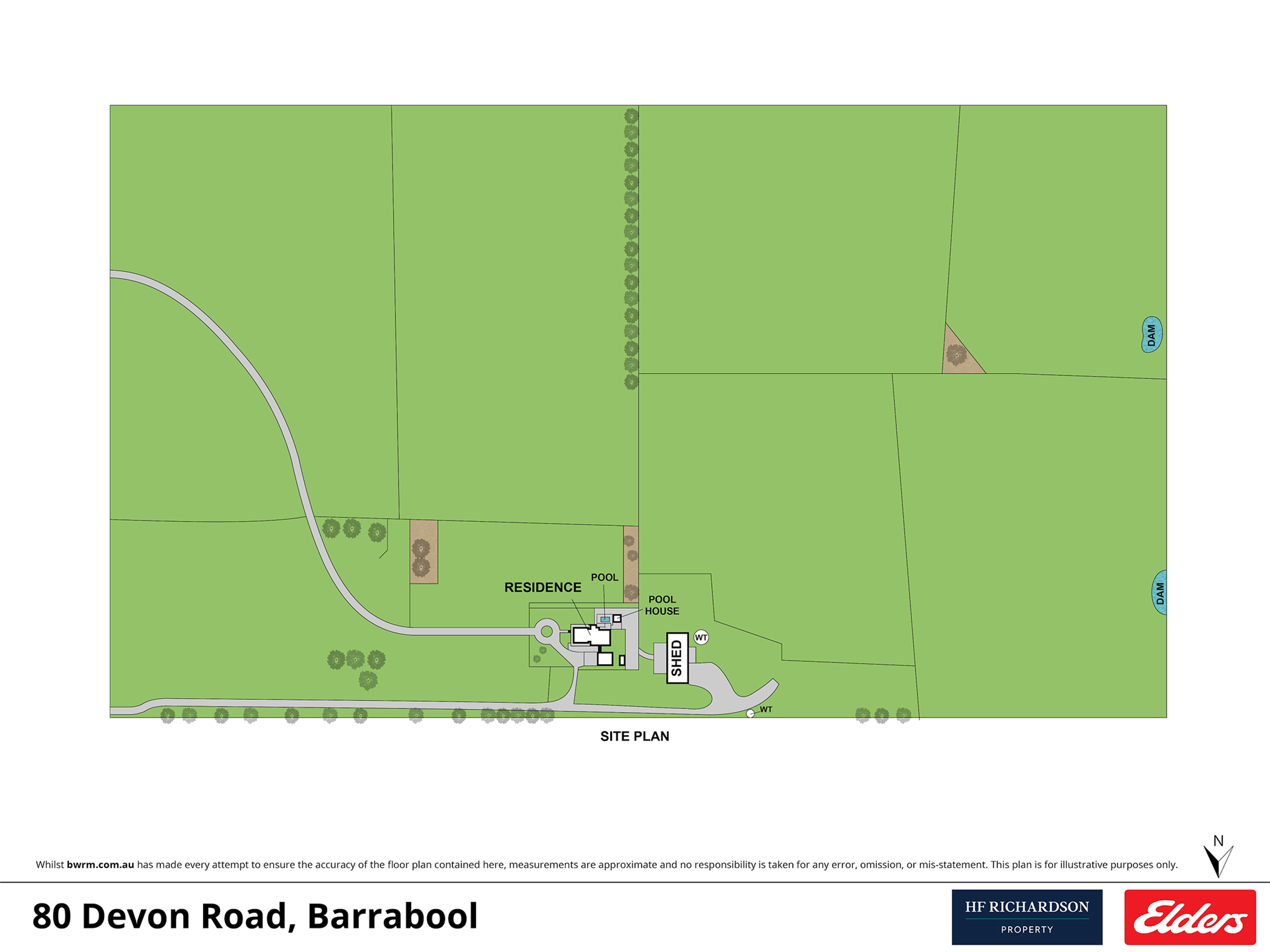 Two dams, a spring, and six fenced paddocks support equine use, grazing, or small-scale agriculture.