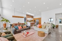Distinct wings are connected by glazed breezeways, reinterpreting the traditional homestead in a contemporary form. High ceilings, bespoke joinery, timber floors, and plush wool carpets soften the accommodation areas, while polished concrete floors define the main living zones. Large windows throughout create a seamless connection between indoors and the surrounding Barrabool Hills landscape.