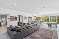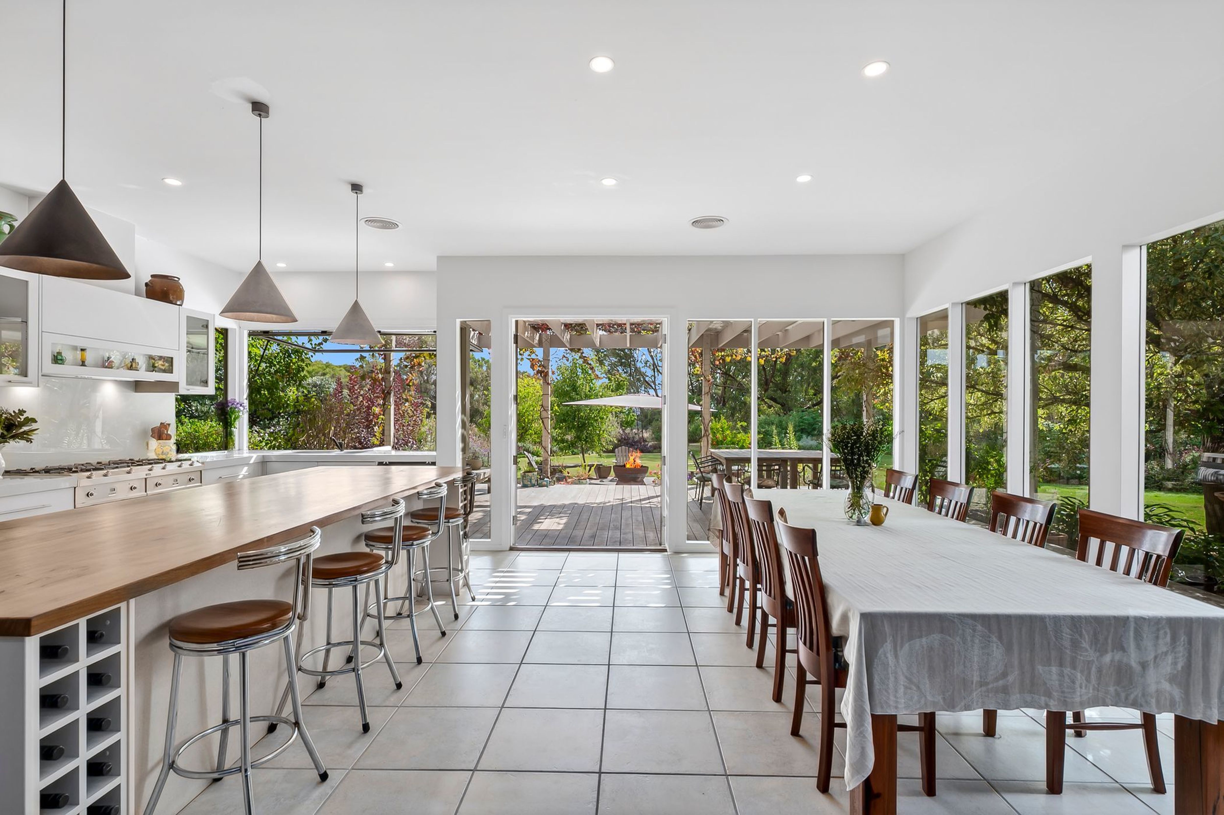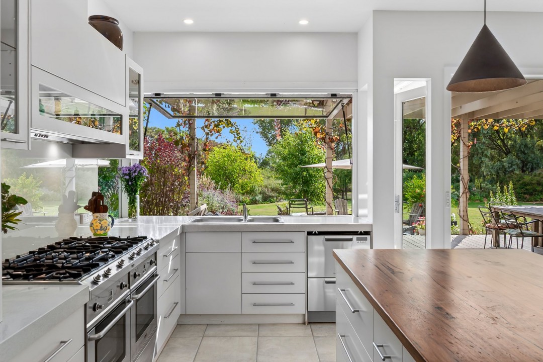 The adjoining open-plan gourmet kitchen is a chef's delight with llve electric double oven/gas cooktops, dishwasher, breakfast bar, ample cupboard space, walk-in pantry with wine storage plus a servery window out to the undercover alfresco dining and expansive timber decking.