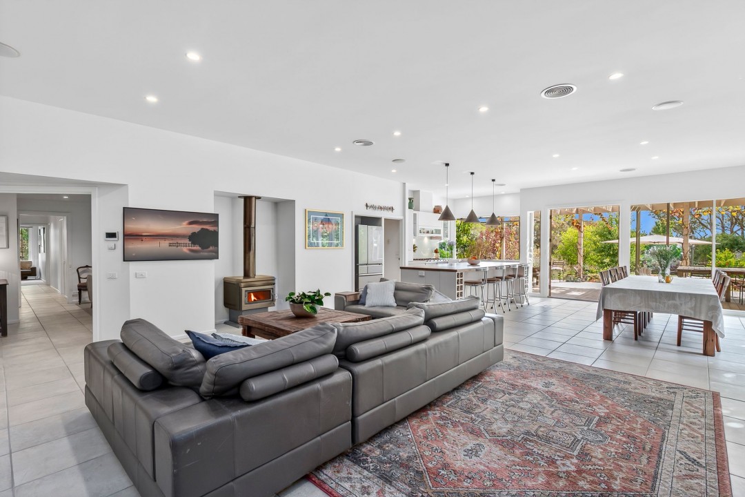 Located at the end of a tree-lined driveway, the expansive homestead offers a private rural sanctuary featuring an abundance of natural light and modern interiors, giving a great sense of space throughout.